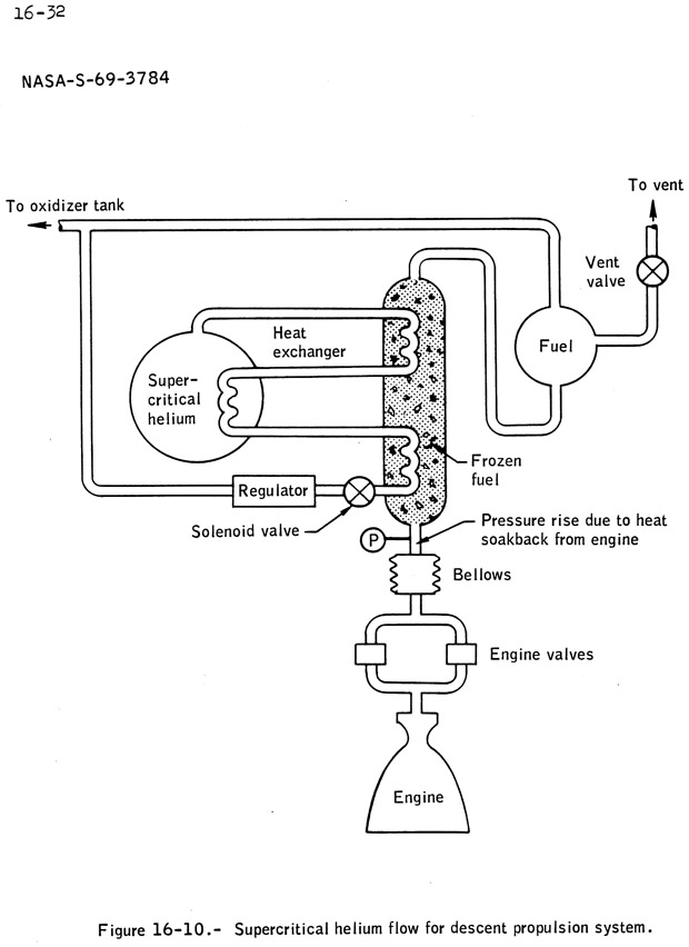 [Finally, in his excellent 2001 book Moon Lander, Grumman's Thomas J. Kelly discusses the situation in some detail. Briefly, the temperature of the fuel trapped in the line was increasing because of the heat of the nearby engine. "The rocket fuel was a mixture of two forms of hydrazine and, at temperatures above four hundred degrees (Fahrenheit, about 200 Celsius), it became unstable. The temperature of the trapped fuel had climbed above three hundred degrees and would reach four hundred in just a few minutes. "We all felt that the consequences of an explosion, even of the relatively small amount of fuel remaining in that short section of line, was unpredicatable and unacceptable." Discussions between Grumman, NASA, and others resulted in a decision to have the crew to "burp" the descent engine by commanding it to fire and immediately shut down by performing a "momentary flick of the manual firing button". That would briefly open the valve on the engine side of the blocked section of line and relieve the building temperature and pressure. CapCom Charlie Duke was about to pass that instruction along to the crew when the fuel frozen in the heat exchanger thawed and the problem disappeared. Charlie informs Neil and Buzz of this fact at 104:46:11.]