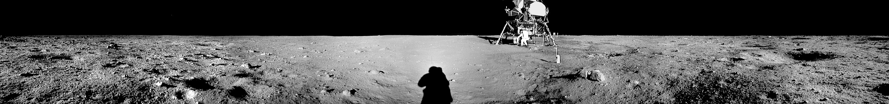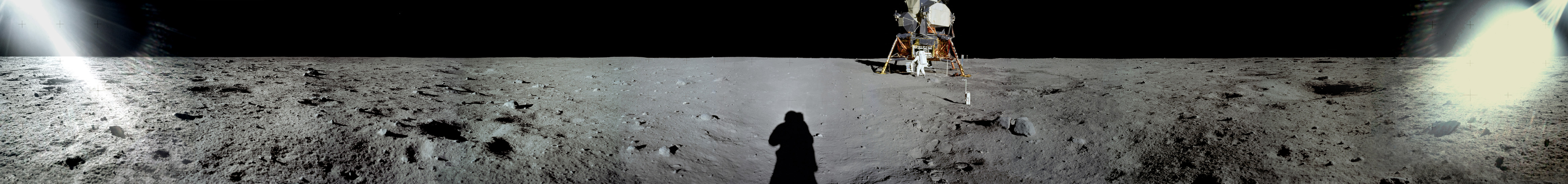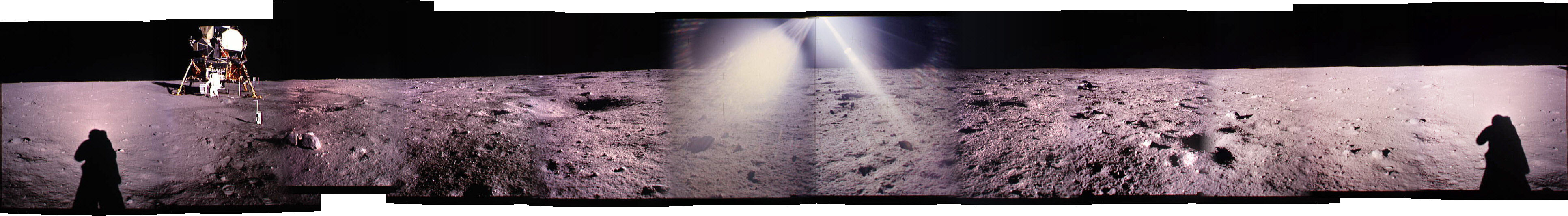 While Buzz offloads the EASEP experiments, Neil takes a pan from southeast of the LM, turning clockwise between images, as indicated in his checklist. Assembly by Mike Constantine.
