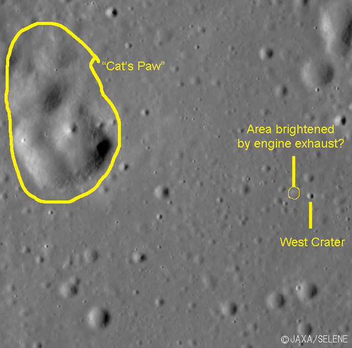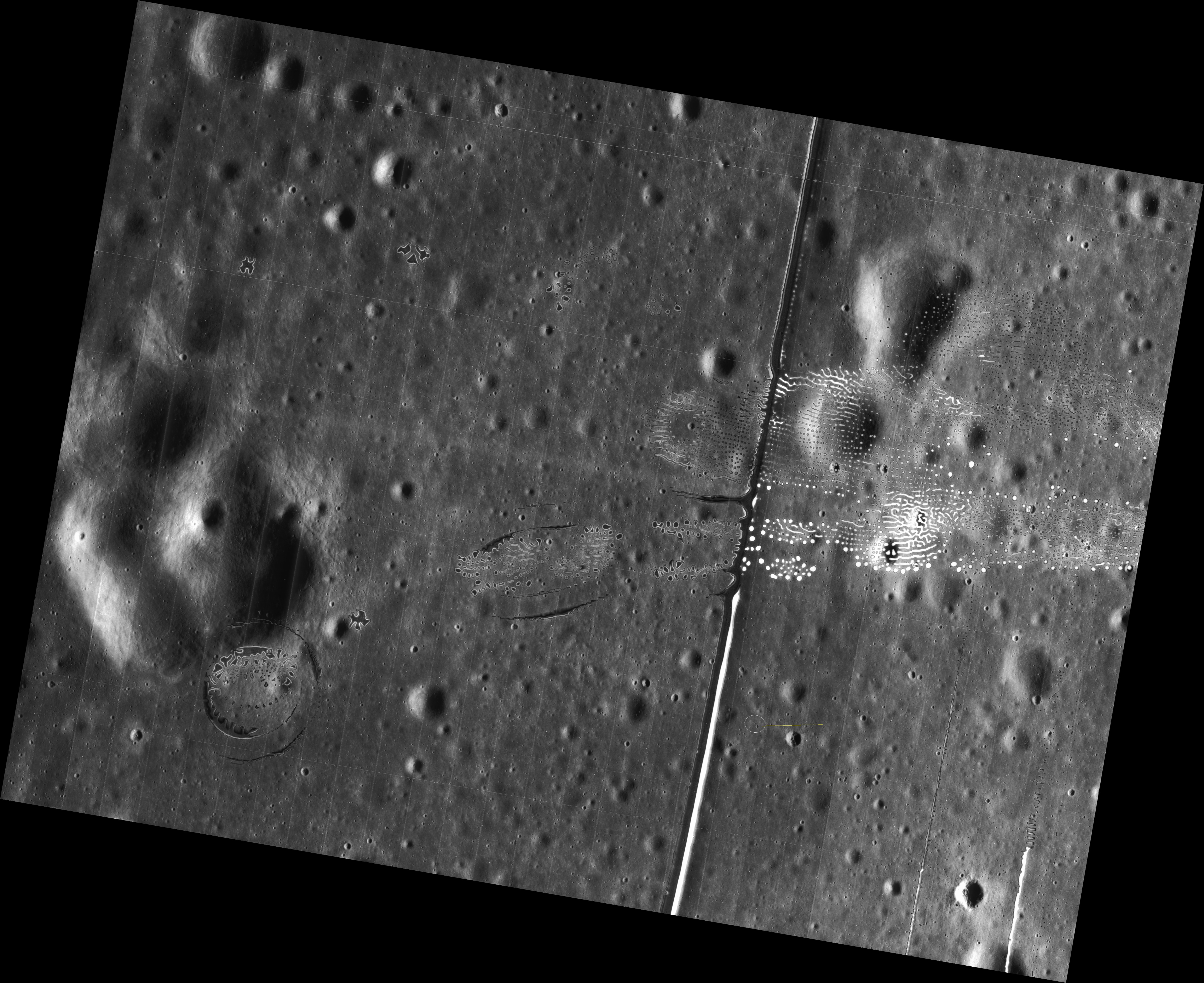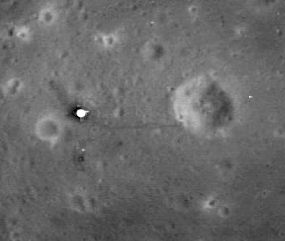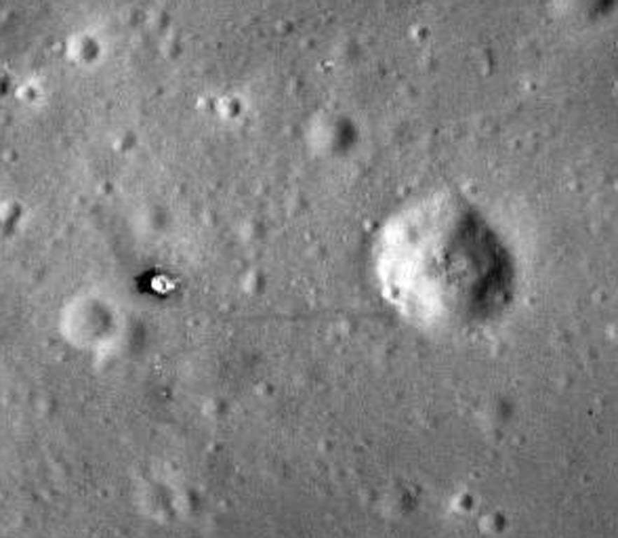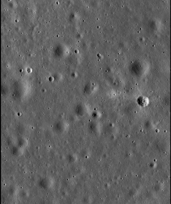 Higher solar elevation than the 08 August image. Good track definition to Little West. Just a hint of the LRRR and PSEP visible in the 0.5 m/pixel deconvolved version. The raw file is M106719774L. The landing site lat/long is 0.67N/23.47E. The LRO spacecraft was at 0.95N/24.33E.01 October 2009 23:50:40 UTC; Solar El/Az 87.8/195.3; LRO altitude 50 km. (1.8 Mb)Deconvolved, 0.50 m/pixel (4.2 Mb TIF) and 1.0 m/pixel (3.5 Mb TIF) versions by GoneToPlaid.