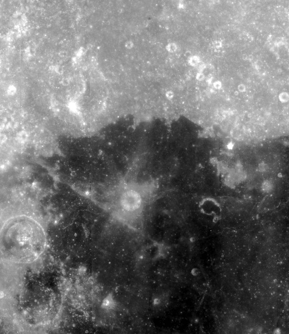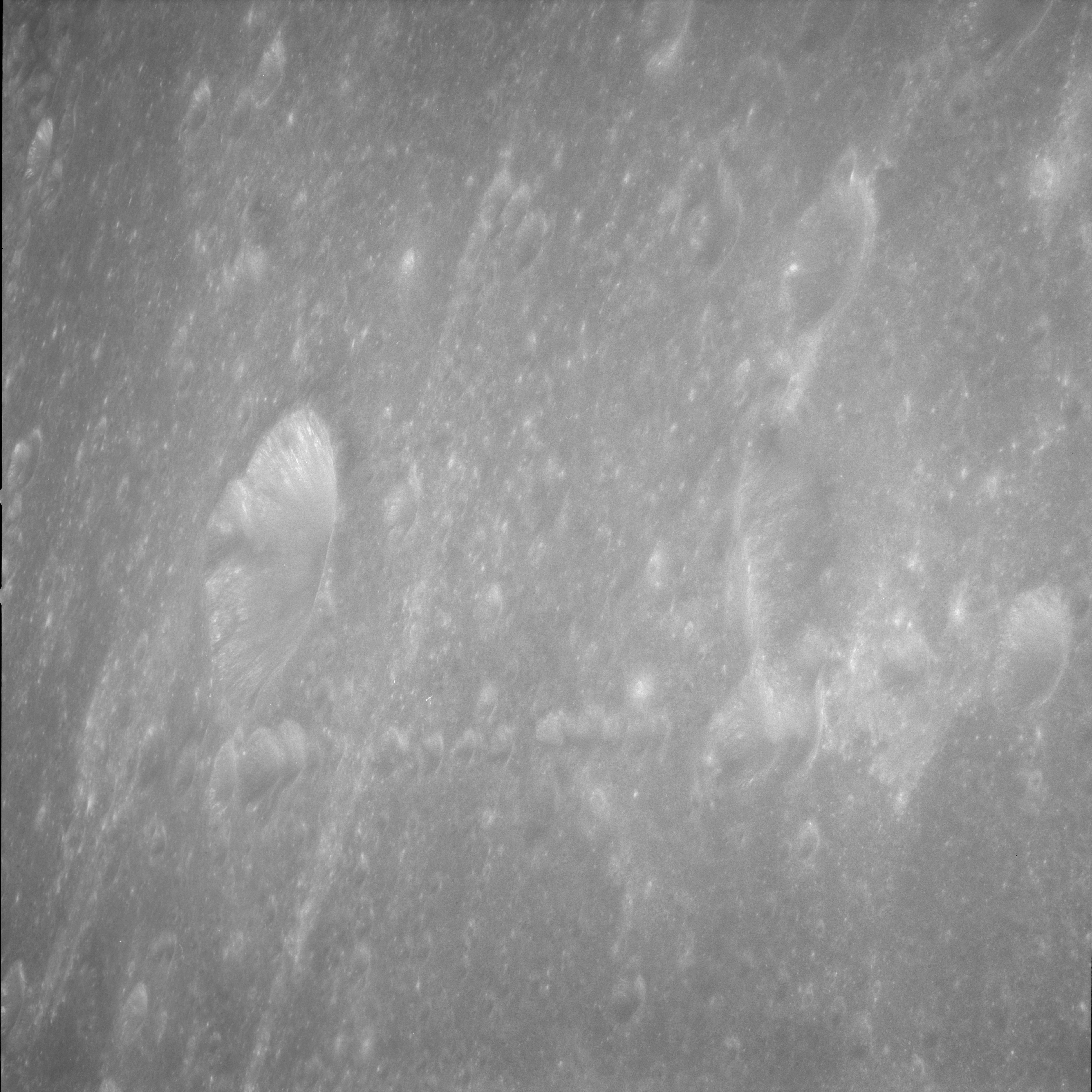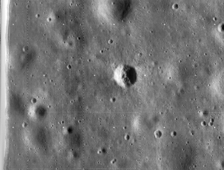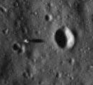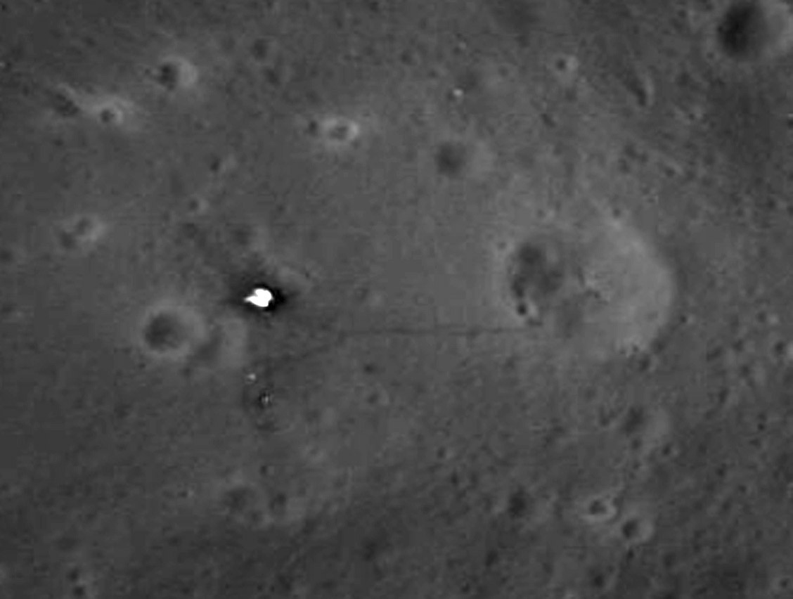 Higher solar elevation than the 08 August image. Good track definition to Little West. Just a hint of the LRRR and PSEP visible in the 0.5 m/pixel deconvolved version. The raw file is M106719774L. The landing site lat/long is 0.67N/23.47E. The LRO spacecraft was at 0.95N/24.33E.01 October 2009 23:50:40 UTC; Solar El/Az 87.8/195.3; LRO altitude 50 km. (1.8 Mb)Deconvolved, 0.50 m/pixel (4.2 Mb TIF) and 1.0 m/pixel (3.5 Mb TIF) versions by GoneToPlaid.