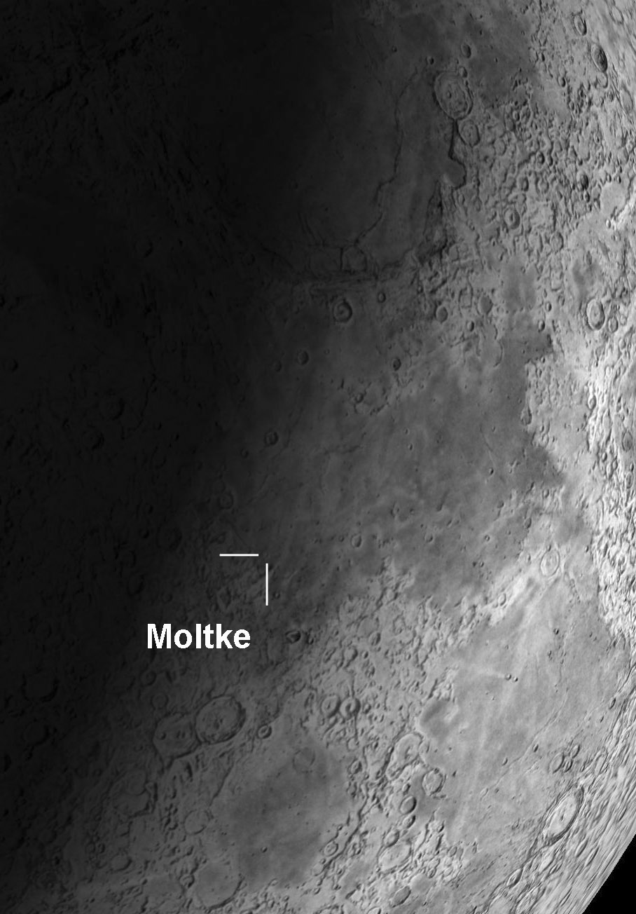 The EASEP components in a 3x-enlarged detail are not prominent. The raw LROC file is M113799518R. The landing site lat/long is 0.67N/23.47E. The LRO spacecraft was at 1.07N/23.96E.22 December 2009 22:43:38 UTC; Solar El/Az 8.2/90.7; LRO altitude 47 km. (4.2 Mb)Deconvolved, 0.25 m/pixel (5.1 Mb TIF) and 0.5 m/pixel (3.9 Mb TIF) versions by GoneToPlaid.