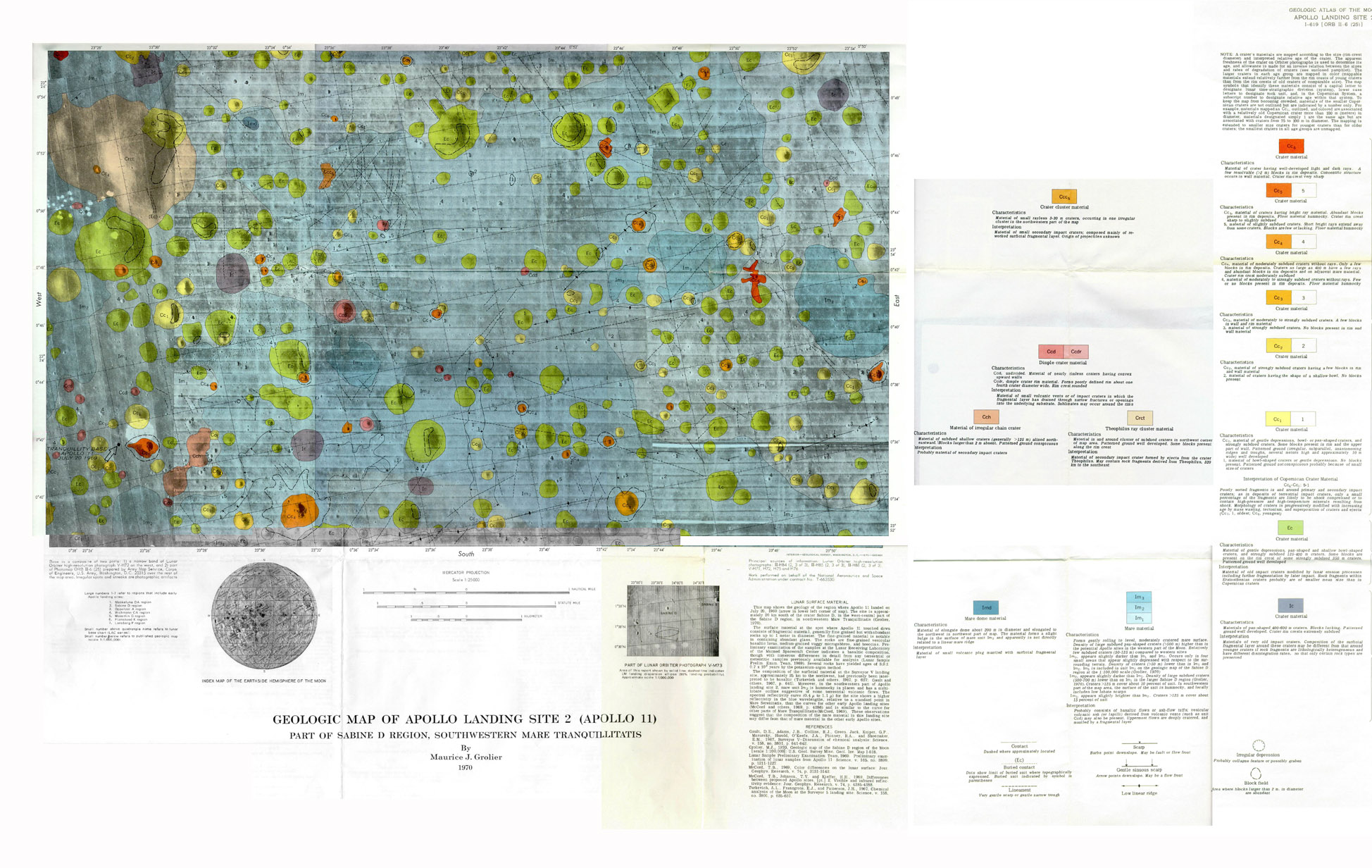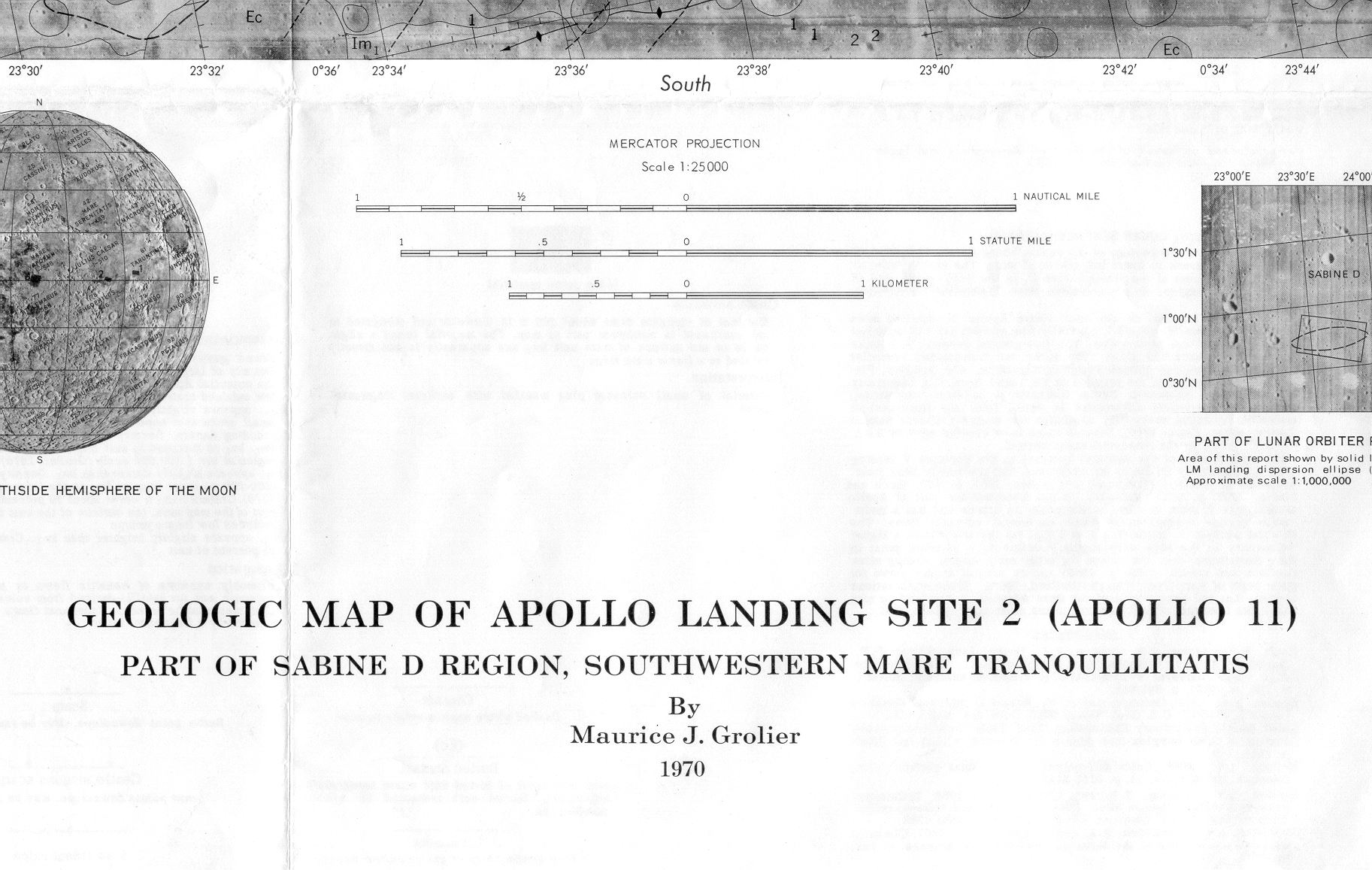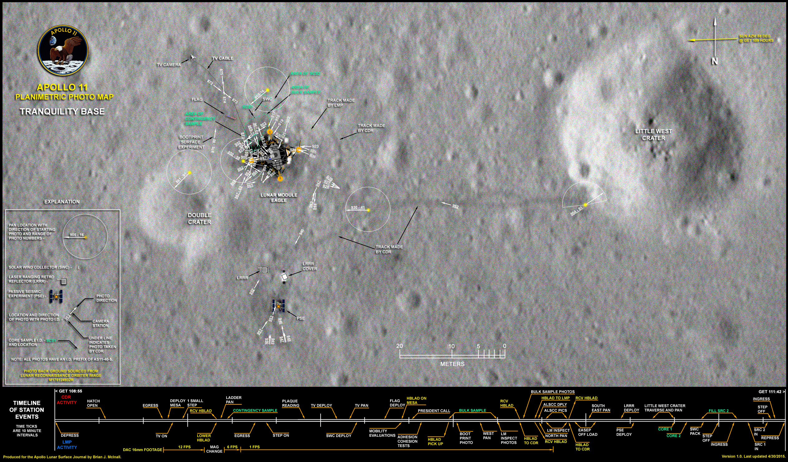Brian McInall has combined LROC17512493R with triangulation data derived from the Hasselblad images to produce a map similar in scale to Vlad Pustynski's. Because Brian's triangulation method lacks the detail and precision of Vlad's photogrammetric analysis, location errors are larger, but not enough so to keep the map from capturing the essential features of the EVA. Brian's method lends itself to improved mapping of the individual geology stops made by later crews.Apollo 11 Planimetric Map, Preliminary Science Report Figure 3-15 (0.1 Mb)