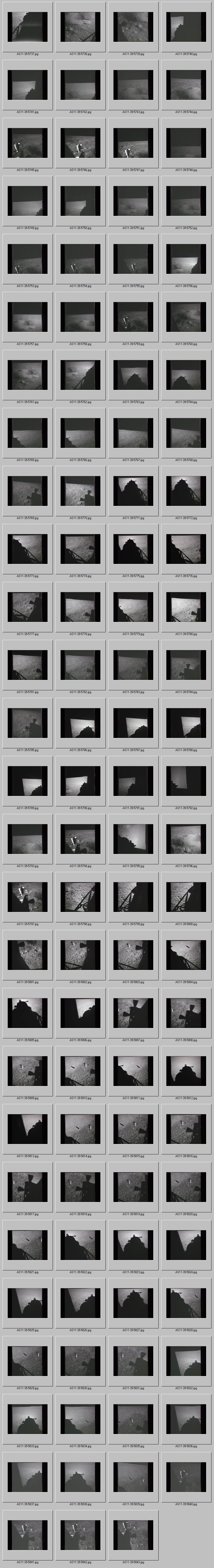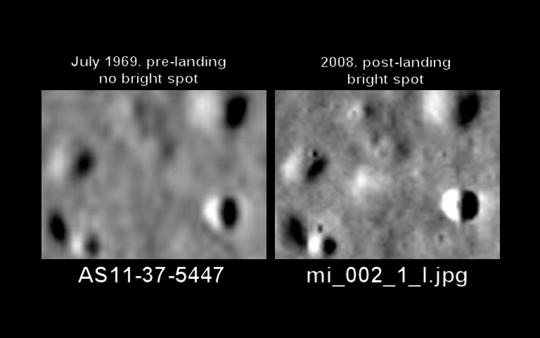 ALSJ Contributor GoneToPlaid has used eleven LROC images taken of the Apollo 11 landing site between 12 July 2009 and and 22 May 2010 to show how the appearance of the site from overhead changes with sun angle. Each frame has been converted to a common scale and has been deconvolved and enhanced. The WMV film begins with a presentation of the frames in the order which they were taken. The next section presents the frames in order of solar elevation, beginning with local sunrise and ending with sunset. The third sequence is ordered by solar elevation and shows as area of about 600 x 360 meters, centered on the LM. The sequence shows changes in the appearance of the LM, terrain features, astronaut tracks, rocks, and deployed equipment under different lighting conditions. The sequence also shows bright objects well away from the LM which, because each persists over two or more consecutive images, are almost certainly pieces of Mylar blown off the descent stage during LM liftoff. The final sequence, GoneToPlaid writes, "is a repeat of the previous sequence, but with only a one-sixth-second delay before transitioning to the next image. This helps the sequence flow smoothly from start to finish. It also provides a stronger visual effect where the viewer can clearly see the top of the LM descent stage shifting left and right, relative to the footpads, due to the changing perspective from which the LRO viewed the AP11 landing site."12 July 2009 First Pass 01:08:01 UTC; Solar El/Az 10.2/270.2; LRO Altitude 113 km. (2.8 Mb)