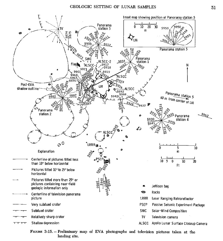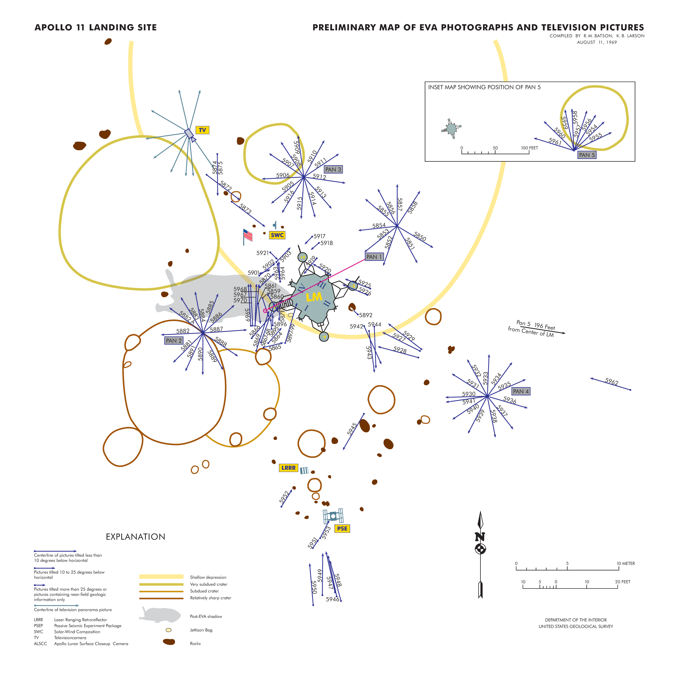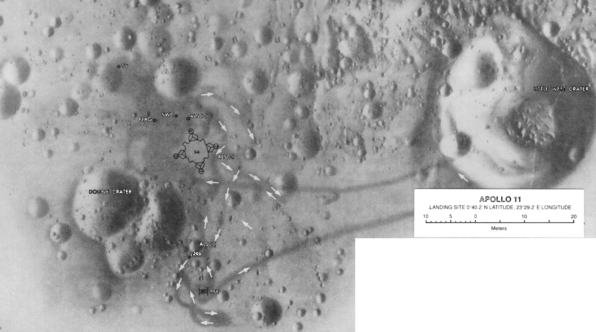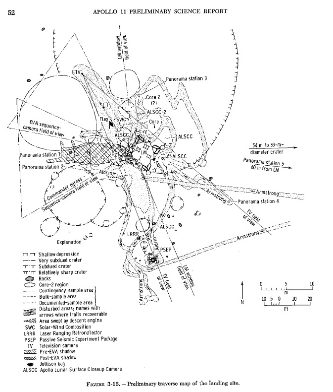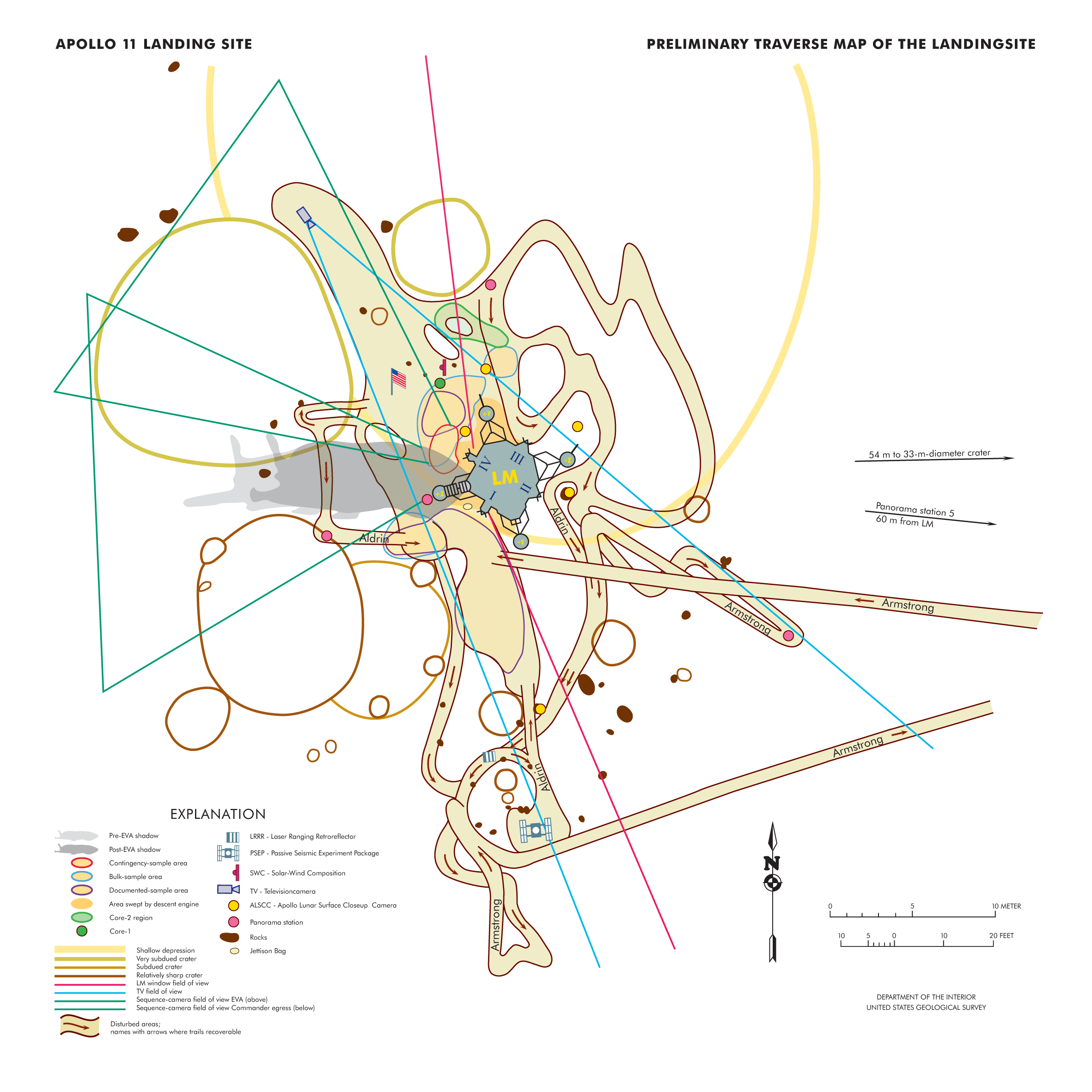 The text that accompanies the map indicates "Because the graphical method by which these data have been obtained is fairly crude, azimuths shown for individual frames may have errors of 3° or more. Positions of most of the camera stations are probably within a 1.5-m circle centered at the point shown. The determinations are sufficiently accurate, however, to provide a useful control net for an overall view of the astronauts' traverse and a starting point for more rigorous analytical photogrammetric measurements."Apollo 11 Traverse Map, Defense Mapping Agency ( 0.7 Mb )