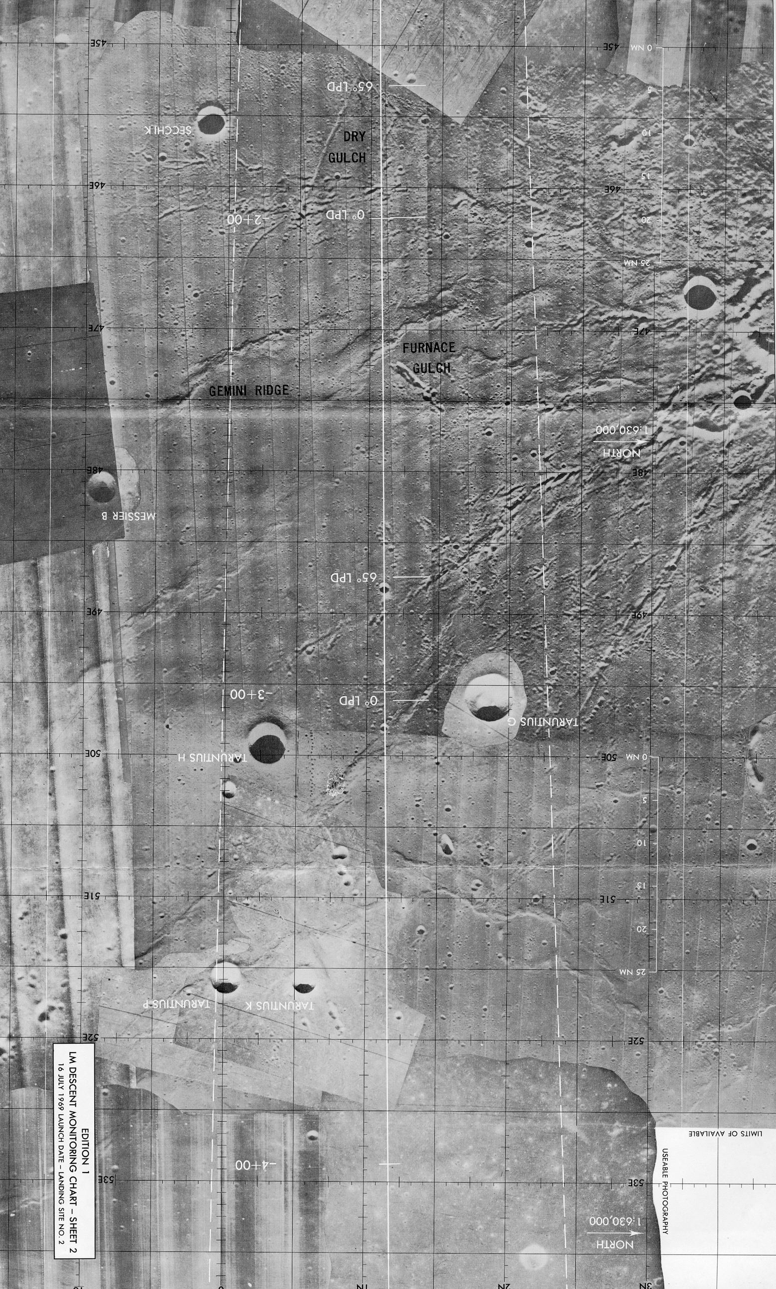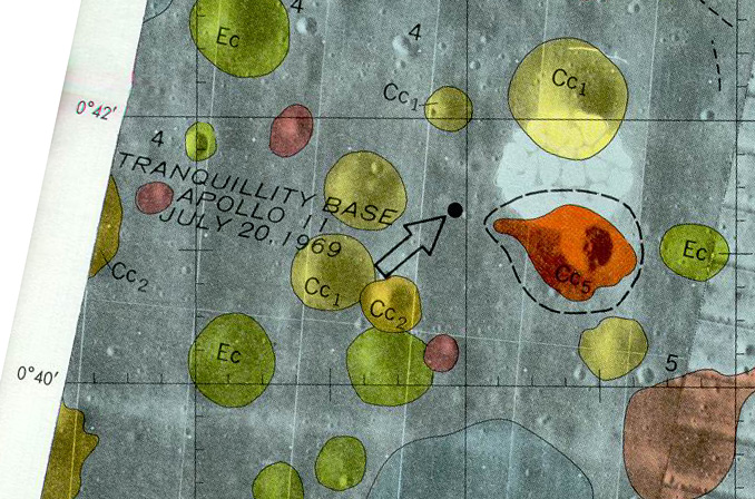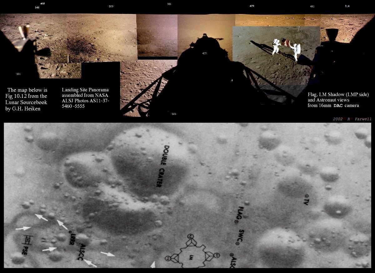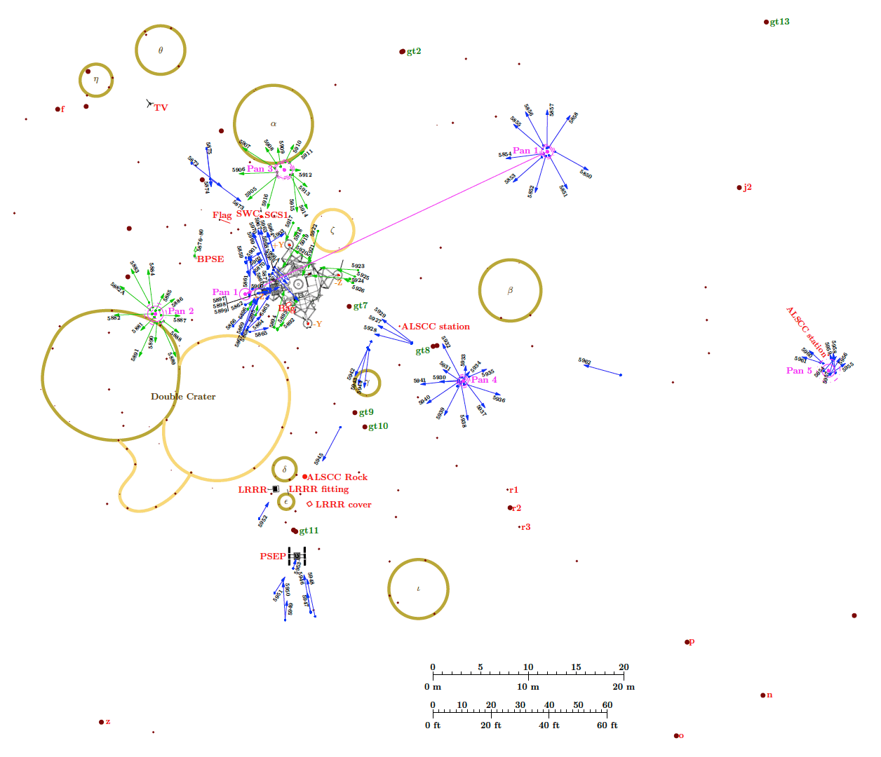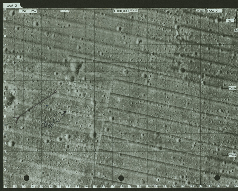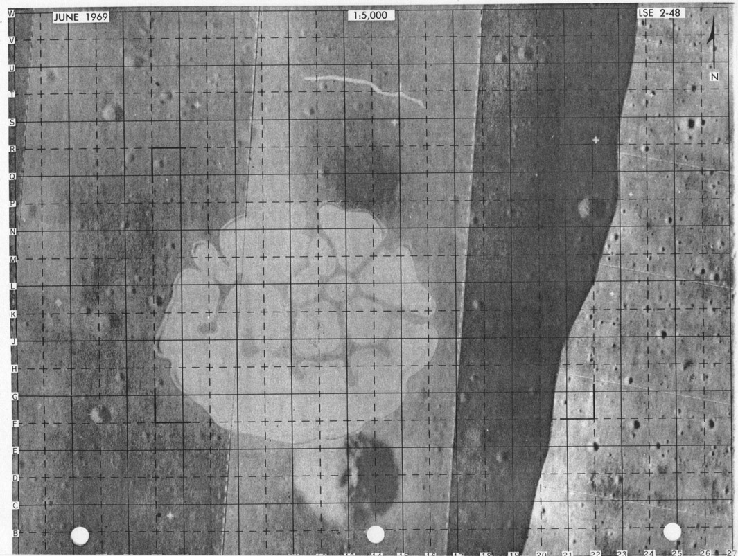 The text that accompanies the map indicates "Because the graphical method by which these data have been obtained is fairly crude, azimuths shown for individual frames may have errors of 3° or more. Positions of most of the camera stations are probably within a 1.5-m circle centered at the point shown. The determinations are sufficiently accurate, however, to provide a useful control net for an overall view of the astronauts' traverse and a starting point for more rigorous analytical photogrammetric measurements."Apollo 11 Traverse Map, Defense Mapping Agency ( 0.7 Mb )