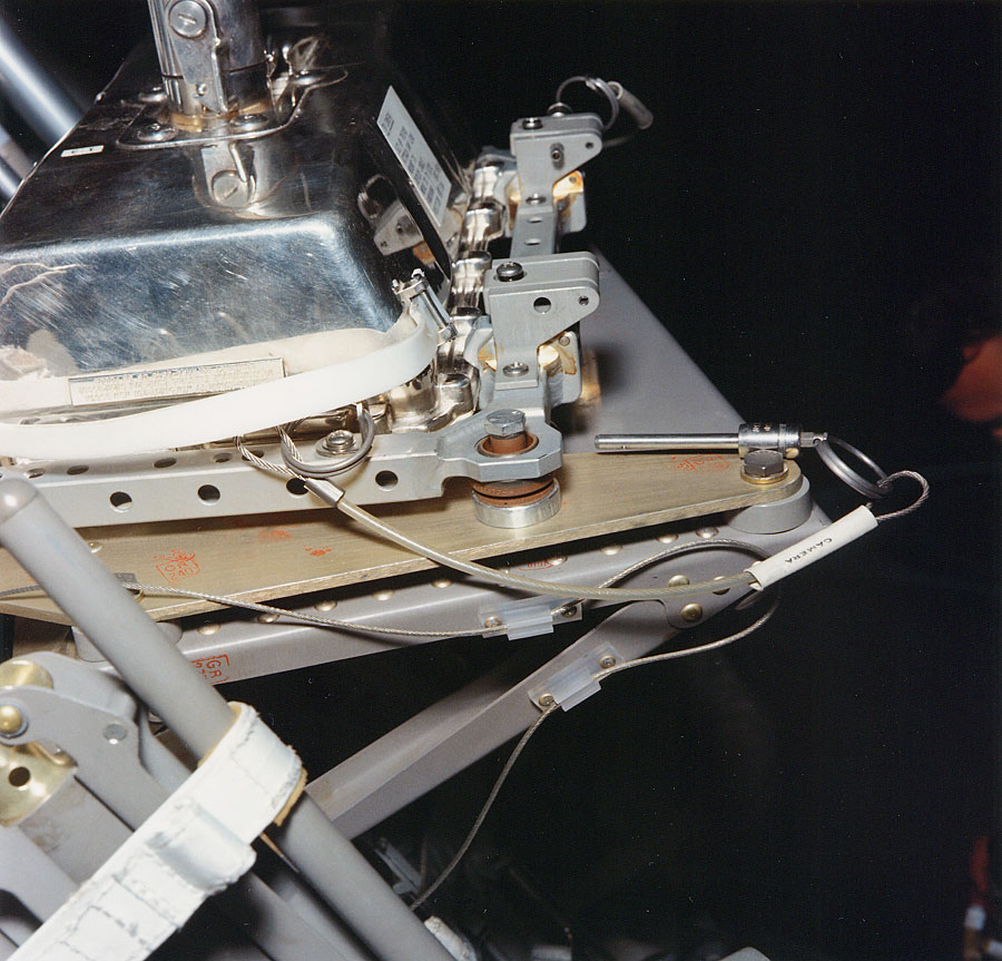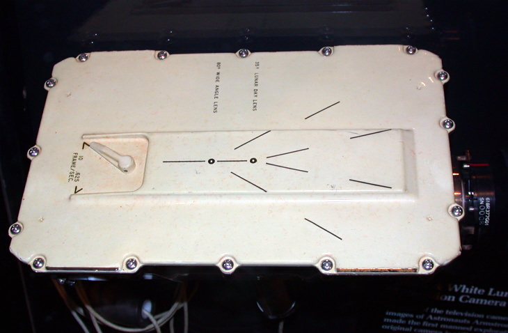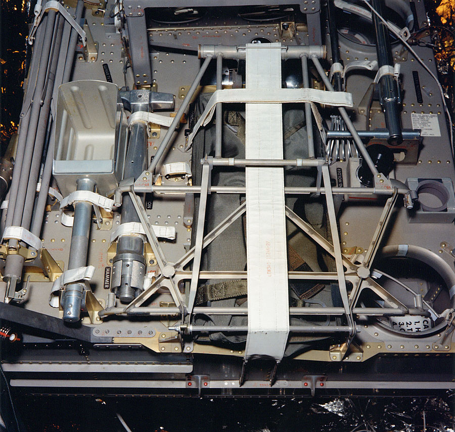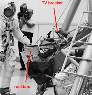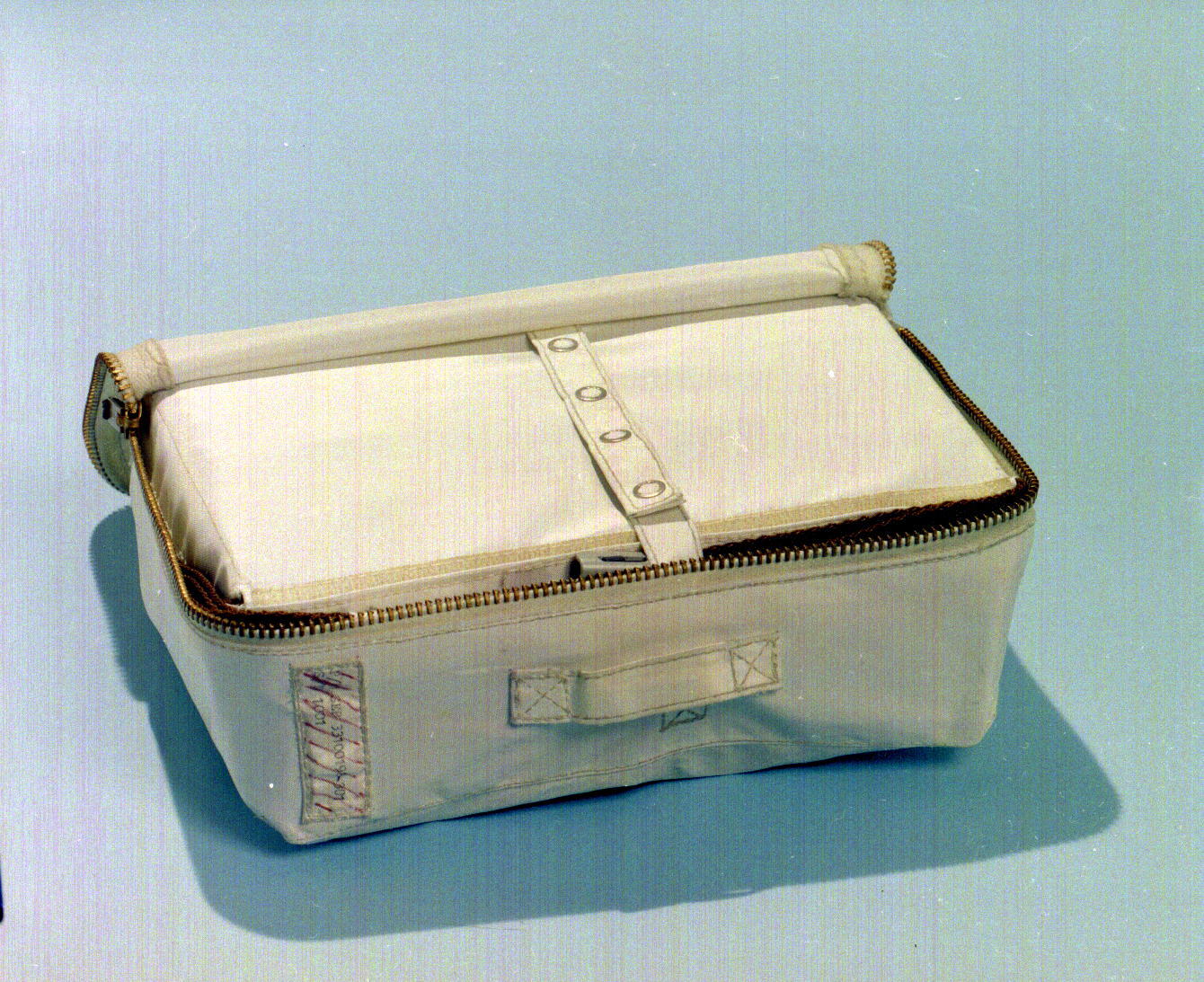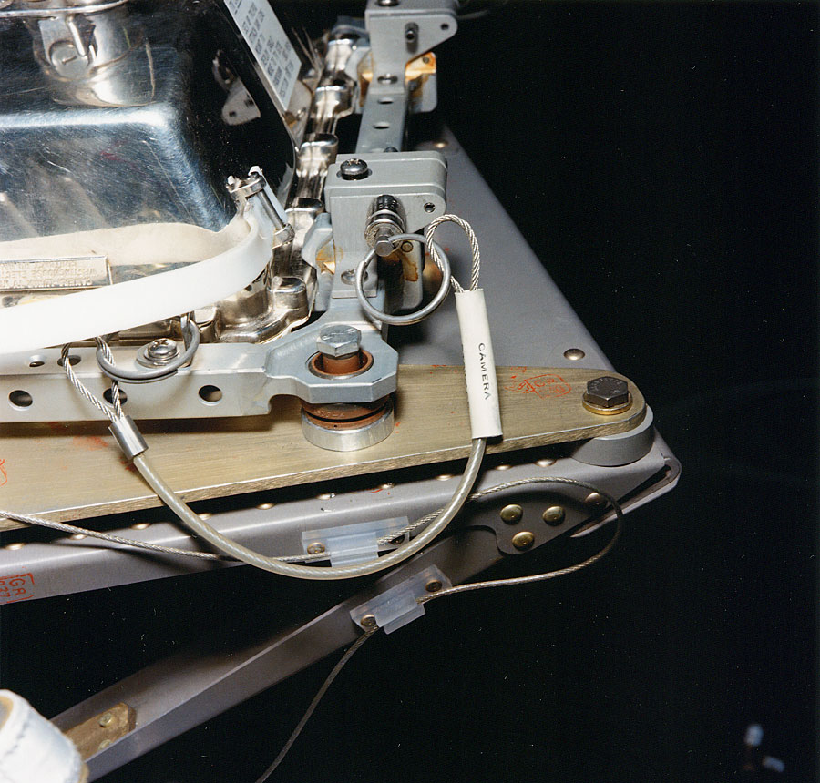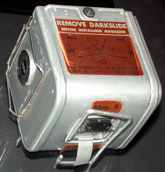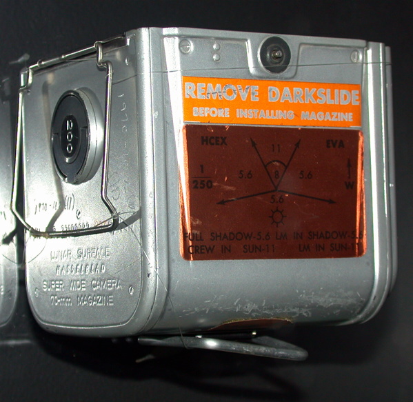 View of the back, top, and lefthand side of the Hasselblad magazine used by Neil Armstrong and Buzz Aldrin during the Apollo 11 EVA. Note the hook on the back that was used to attach the magazine to the Lunar Equipment Conveyor (LEC) for transfer to the cabin at the end of the EVA. Note, also, the orange decal on the top showing f-stops to be used for photography in various directions relative to the Sun. Note, also, the wire handle on the lefthand side attached to dark slide that was in place whenever the magazine wasn't attached to the camera. In the case of this magazine, the dark slide was removed early in preparations for the EVA, just before the magazine was attached to the EVA Hasselblad. The dark slide was then stowed in the LHSSC (Left Hand Side Stowage Compartment and wasn't inserted again until the magazine was transferred back up to the cabin on the LEC at the end of the EVA. October 2004. Photo by Ulli Lotzmann at the National Air and Space Museum.Hasselblad Magazine S - Top View ( 141k )