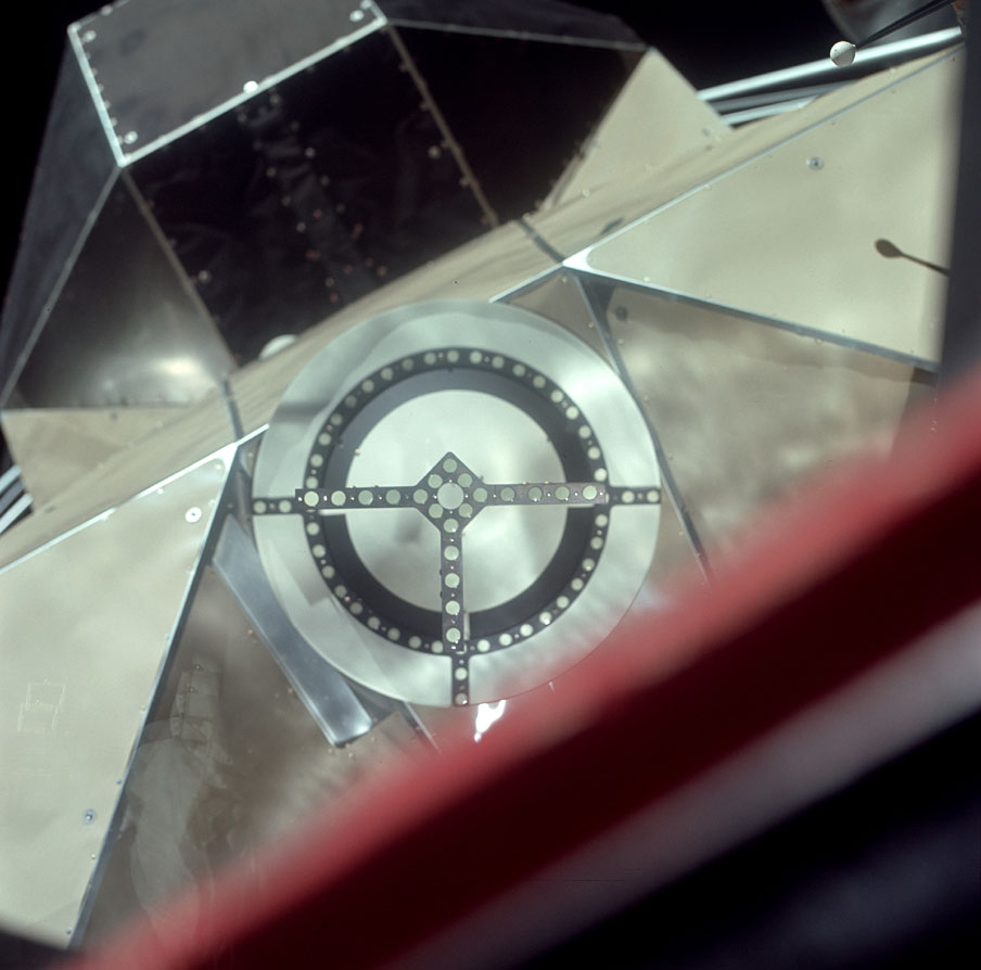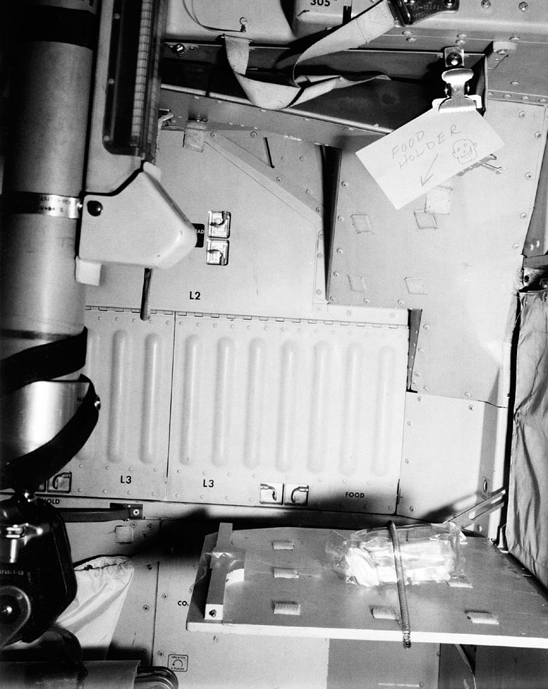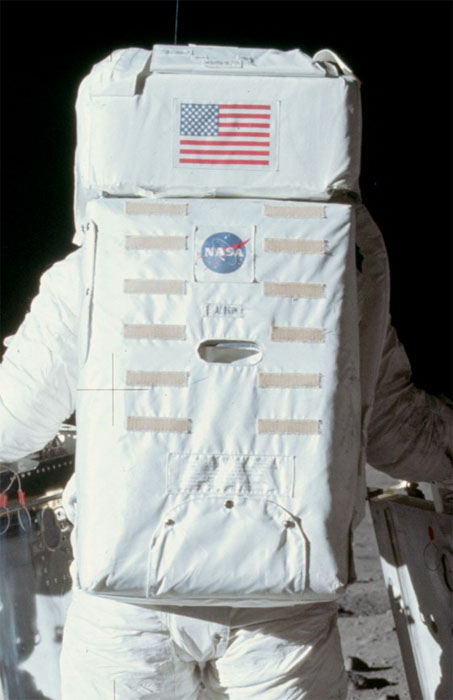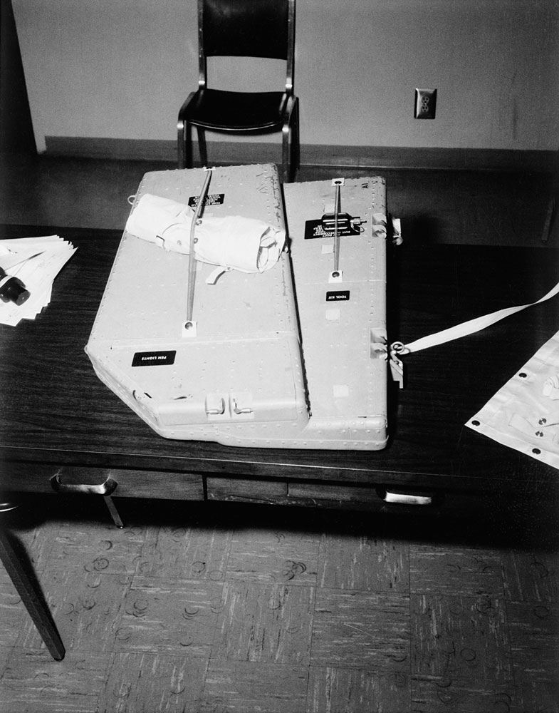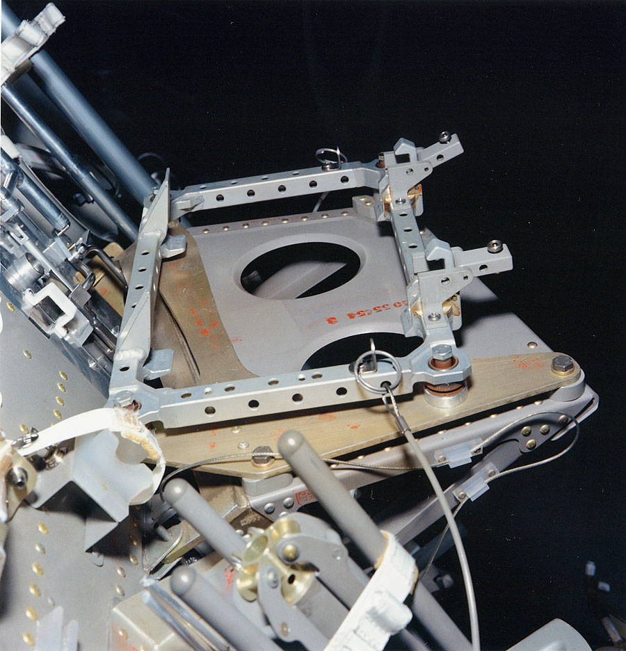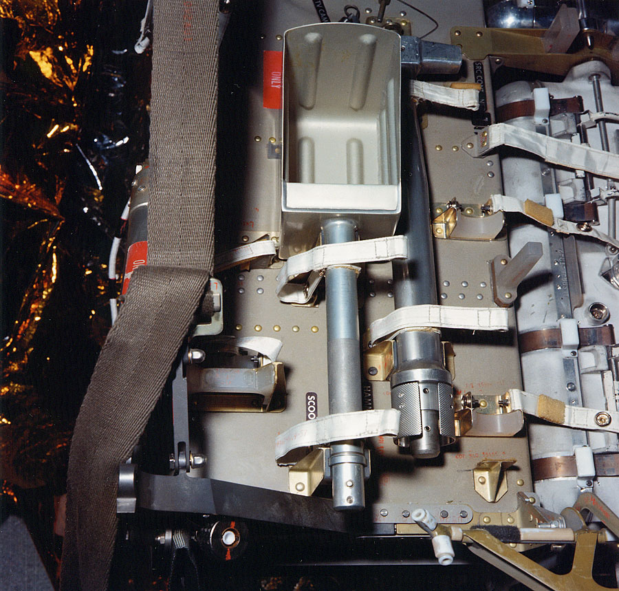 View of the back, top, and lefthand side of the Hasselblad magazine used by Neil Armstrong and Buzz Aldrin during the Apollo 11 EVA. Note the hook on the back that was used to attach the magazine to the Lunar Equipment Conveyor (LEC) for transfer to the cabin at the end of the EVA. Note, also, the orange decal on the top showing f-stops to be used for photography in various directions relative to the Sun. Note, also, the wire handle on the lefthand side attached to dark slide that was in place whenever the magazine wasn't attached to the camera. In the case of this magazine, the dark slide was removed early in preparations for the EVA, just before the magazine was attached to the EVA Hasselblad. The dark slide was then stowed in the LHSSC (Left Hand Side Stowage Compartment and wasn't inserted again until the magazine was transferred back up to the cabin on the LEC at the end of the EVA. October 2004. Photo by Ulli Lotzmann at the National Air and Space Museum.Hasselblad Magazine S - Top View ( 141k )