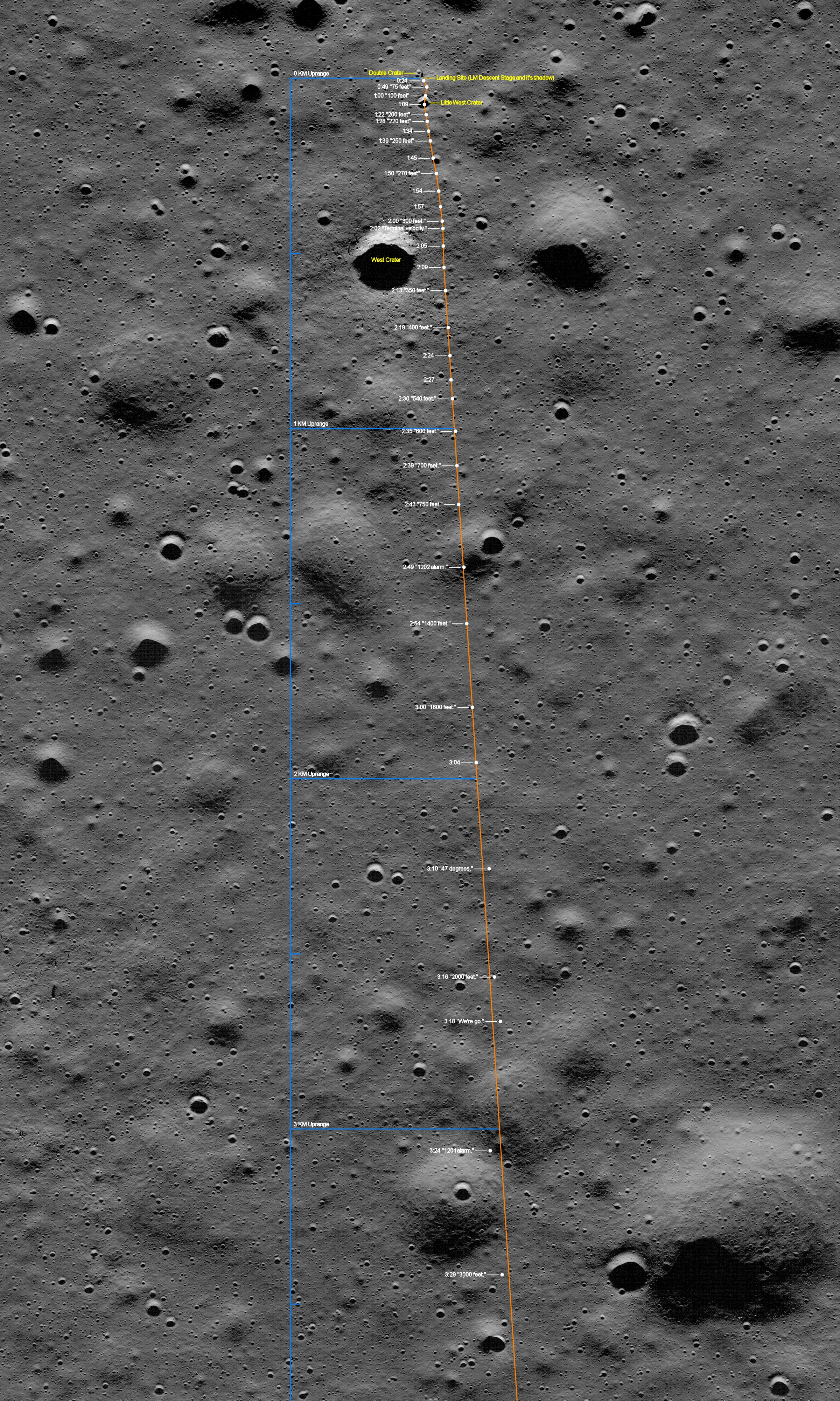 The 3x-enlarged detail shows a good trace of Neil's traverse from the LRRR to the southwest rim of Little West Crater and back to the LM. The raw LROC file is M122054682R. The landing site lat/long is 0.67N/23.47E. The LRO spacecraft was at 0.33N/23.69E.22 May 2010 02:06:13 UTC; Solar El/Az 36.9/89.2; LRO altitude 41 km. (5.2 Mb)Deconvolved, 0.25 m/pixel (3.7 Mb TIF) and 0.5 m/pixel (4.1 Mb TIF) versions by GoneToPlaid.