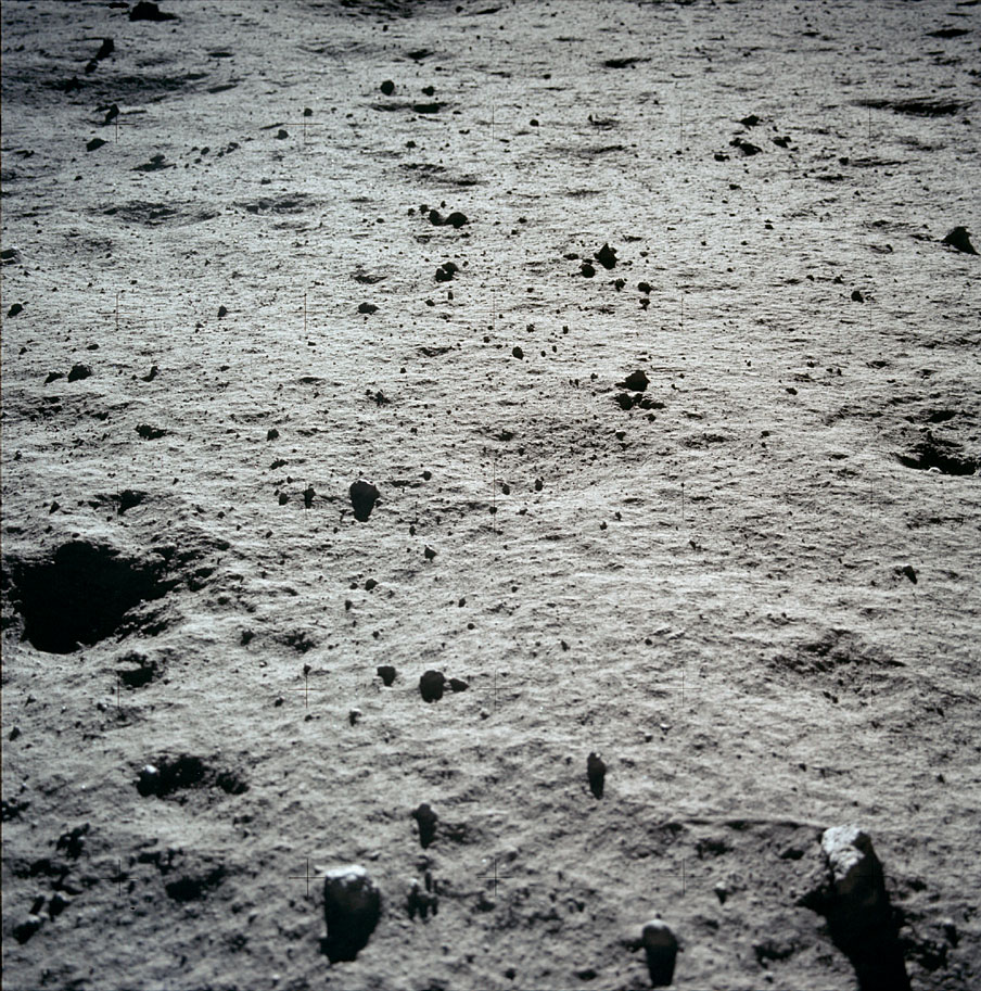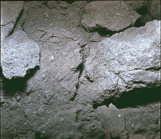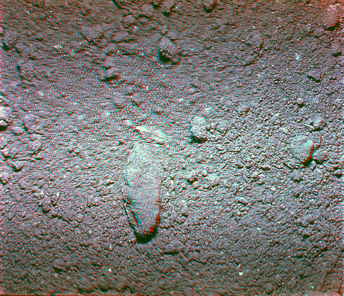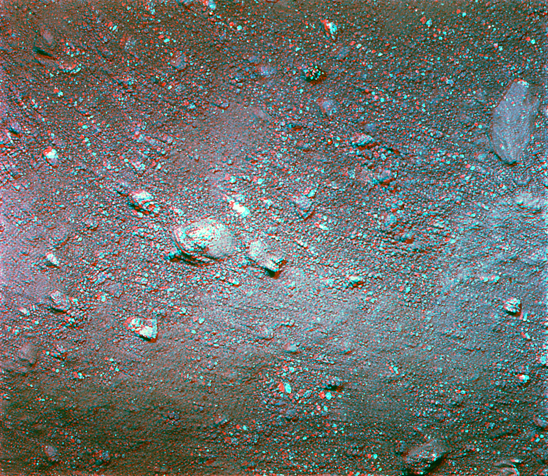 At least some of the large pieces in this image appear to be soil clods, perhaps resulting from disturbance of the area by one of the landing probes. See, for example, AS11-40-5917. Note that the area shown is 72 mm by 83 mm. Red-blue anaglyph created by Erwin D'Hoore.AS11-45-6706 Wiggle Stereo ( 0.2Mb )