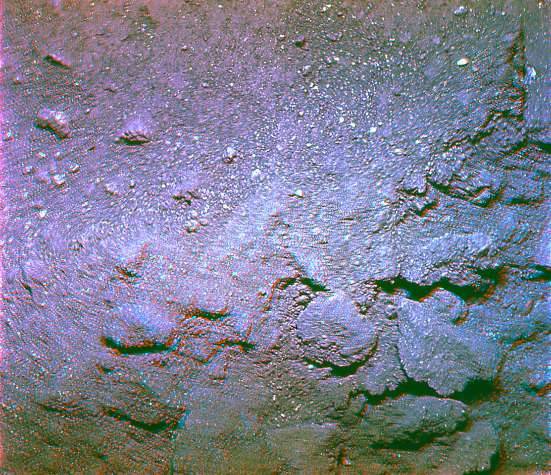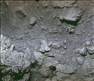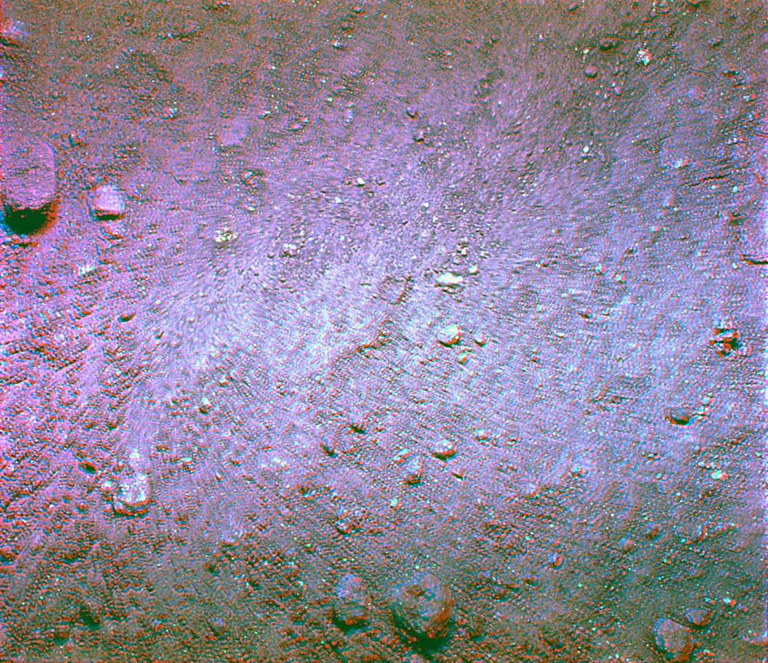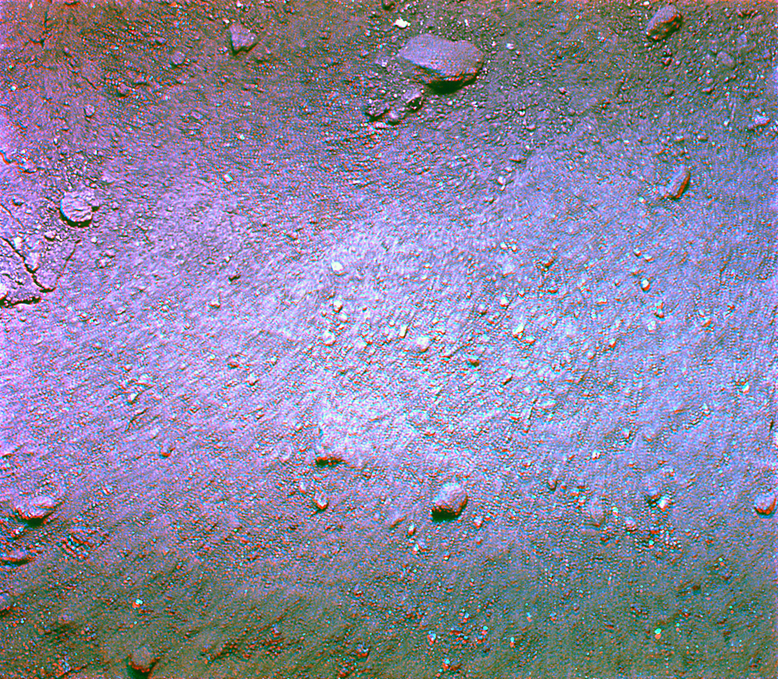 At least some of the large pieces in this image appear to be soil clods, perhaps resulting from disturbance of the area by one of the landing probes. See, for example, AS11-40-5917. Note that the area shown is 72 mm by 83 mm. Red-blue anaglyph created by Erwin D'Hoore.AS11-45-6706 Wiggle Stereo ( 0.2Mb )