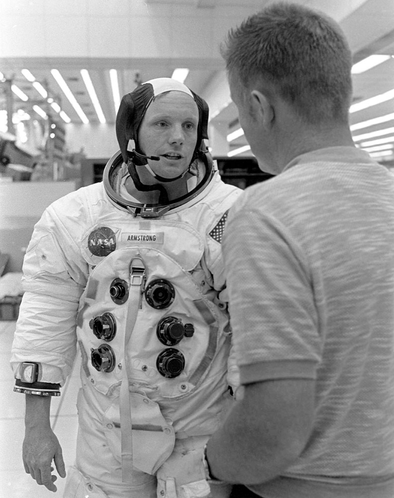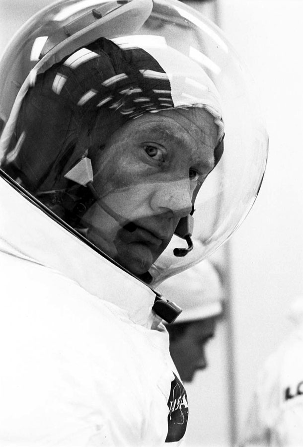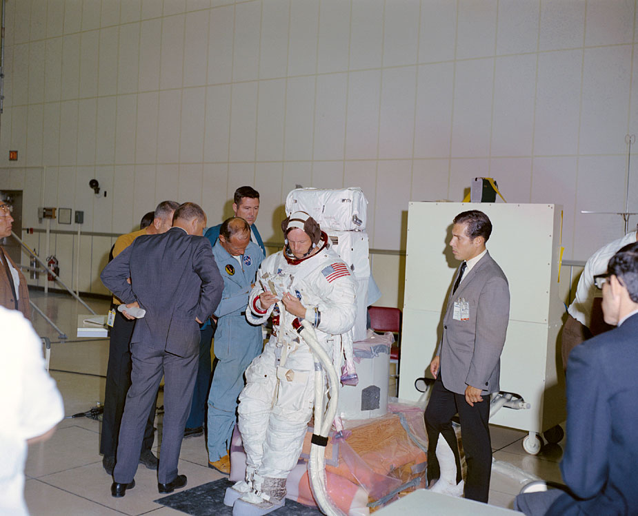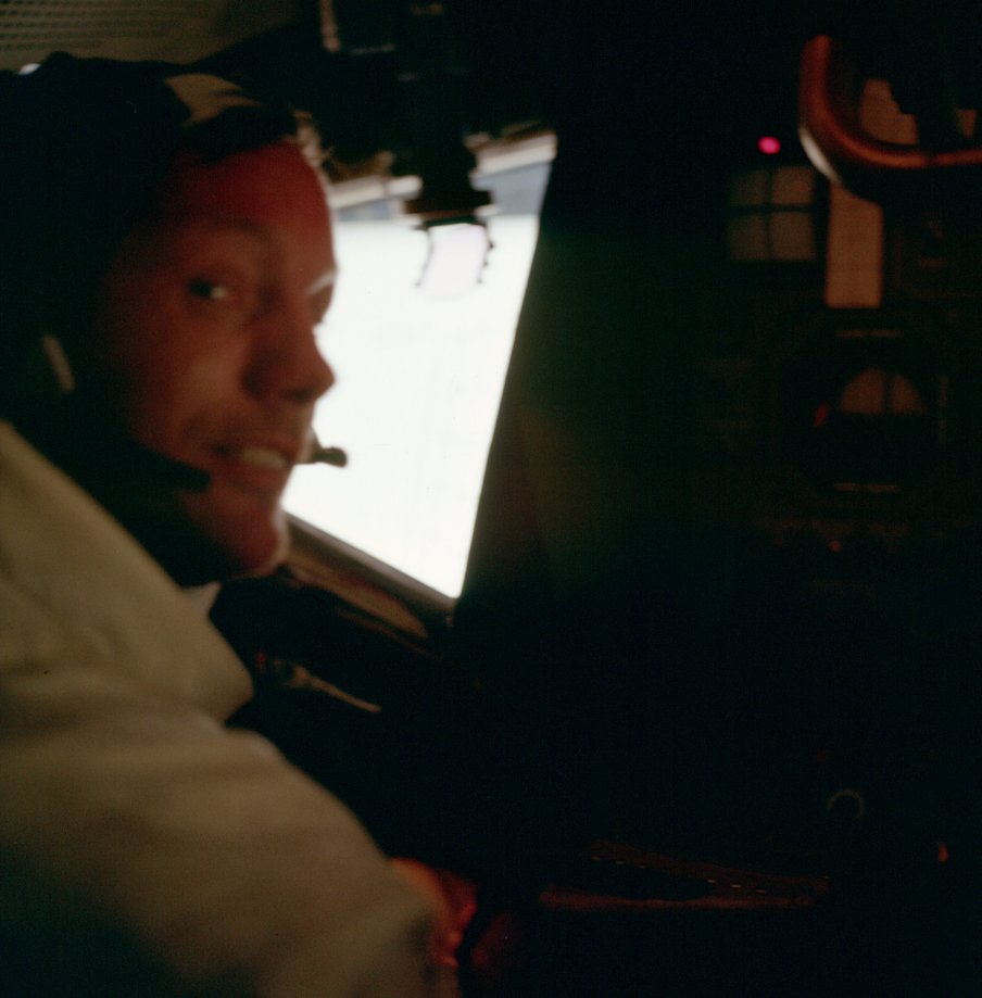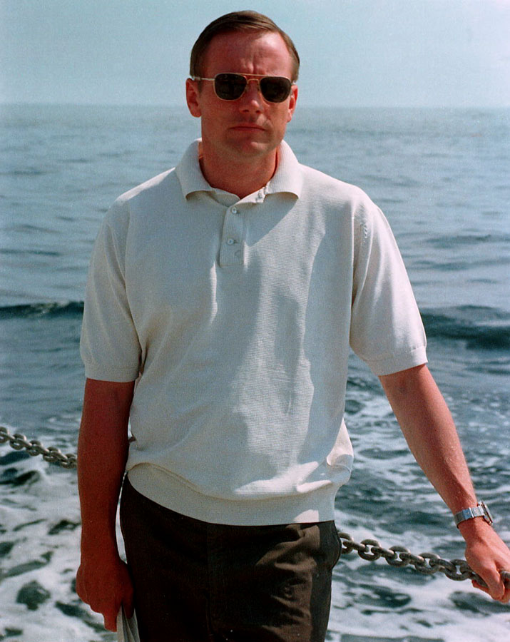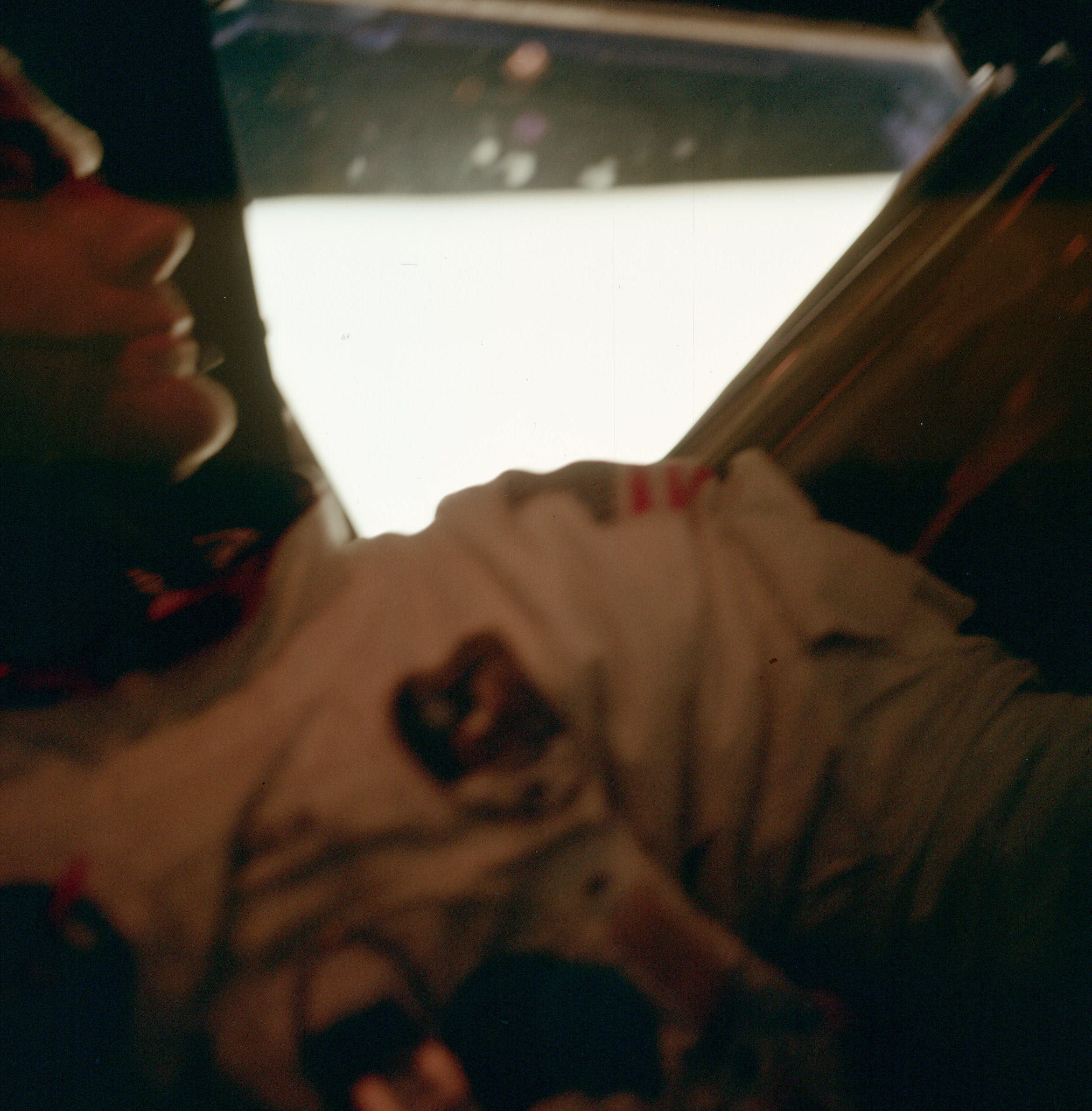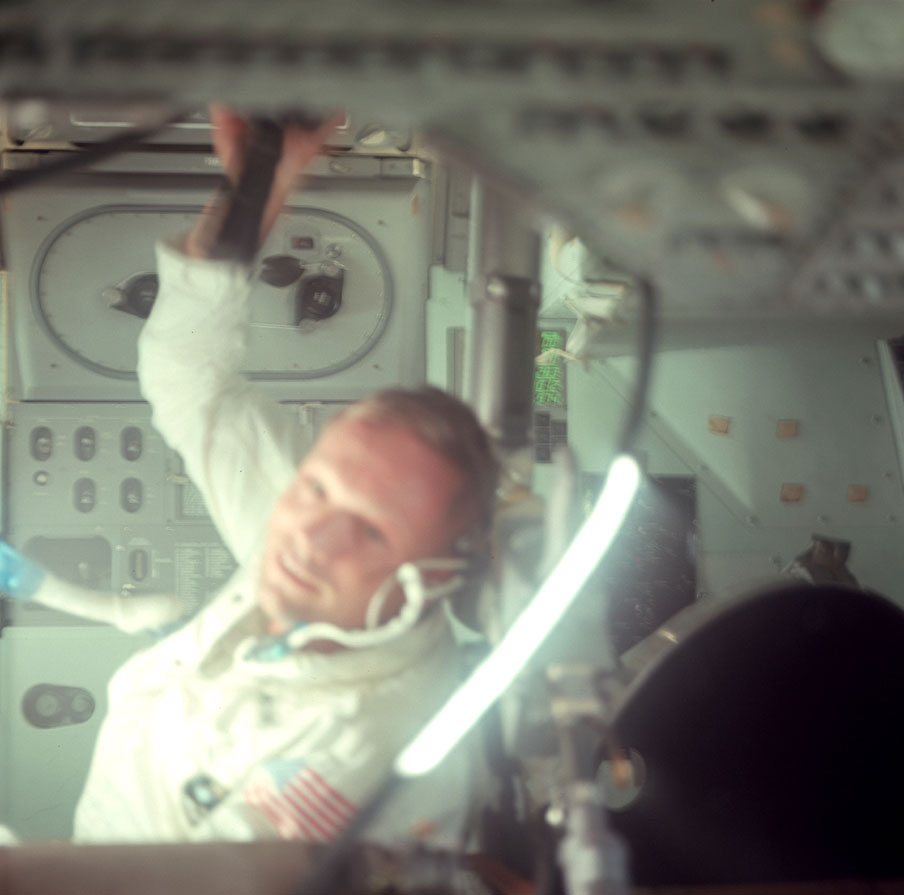 The fact that Neil is wearing his "Hornet Plus Three" badge suggests that this photo was taken on-board the recovery ship. Unknown photographer. Scan courtsey Connie Moore/NASA HQ.S69-40210 ( 1.1 Mb )