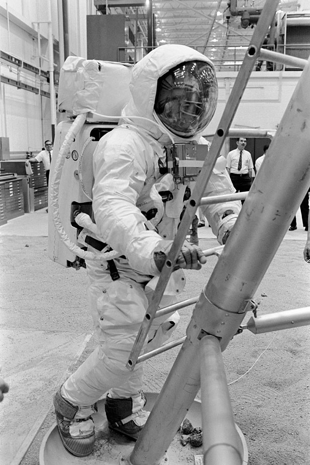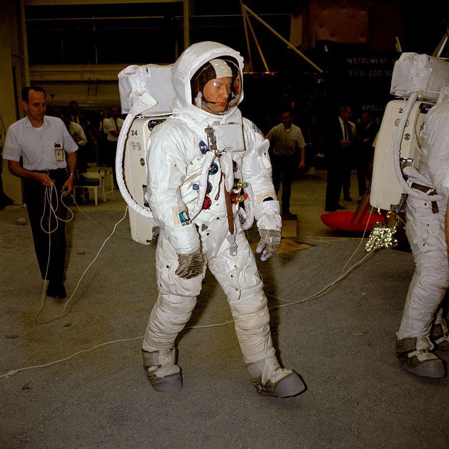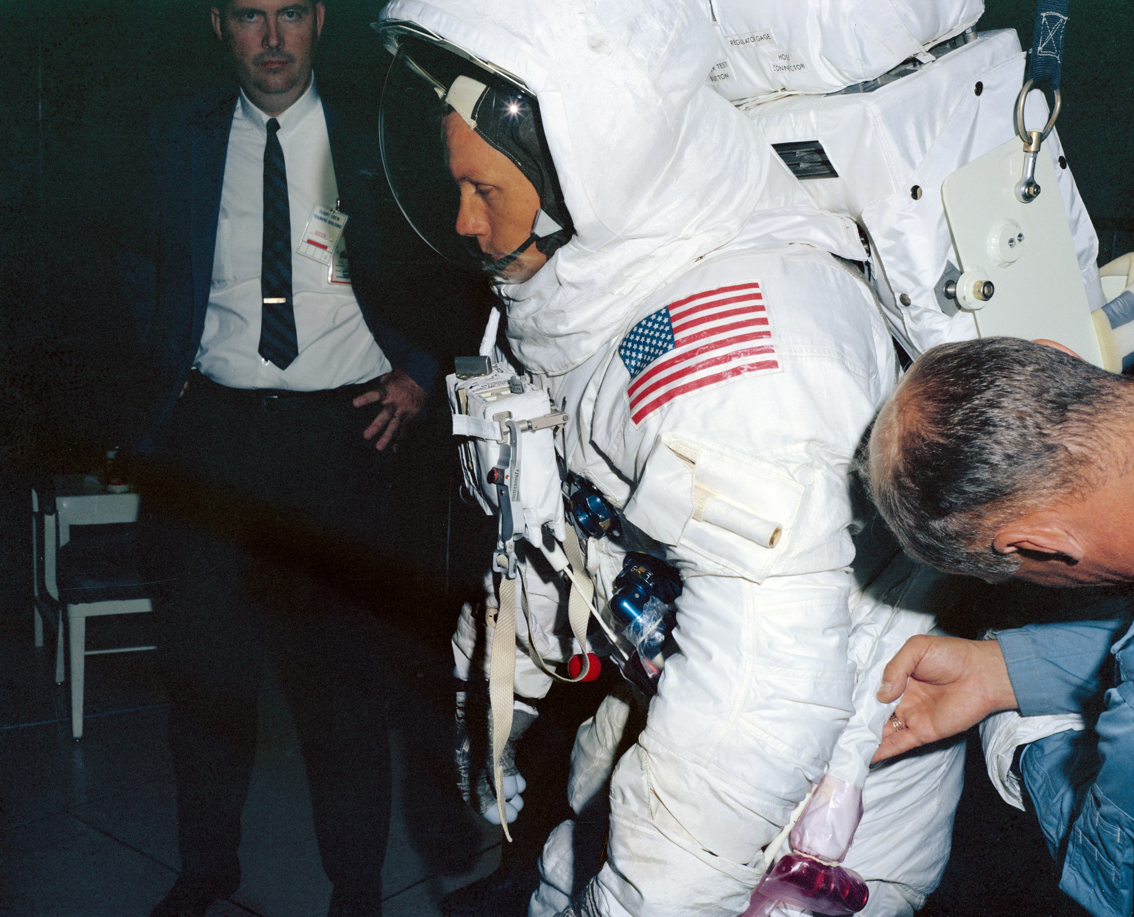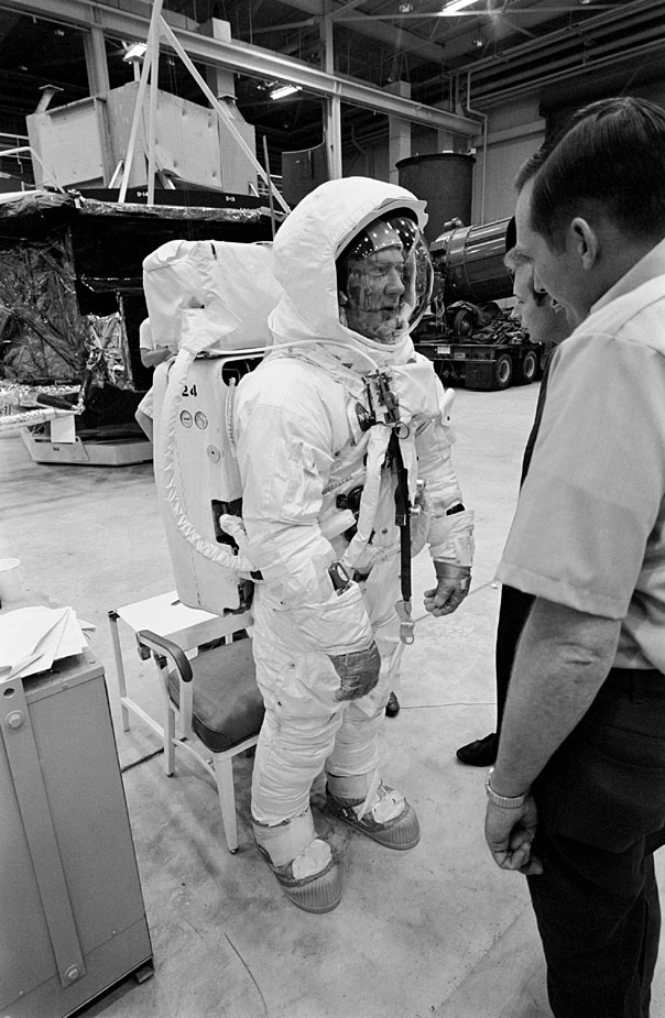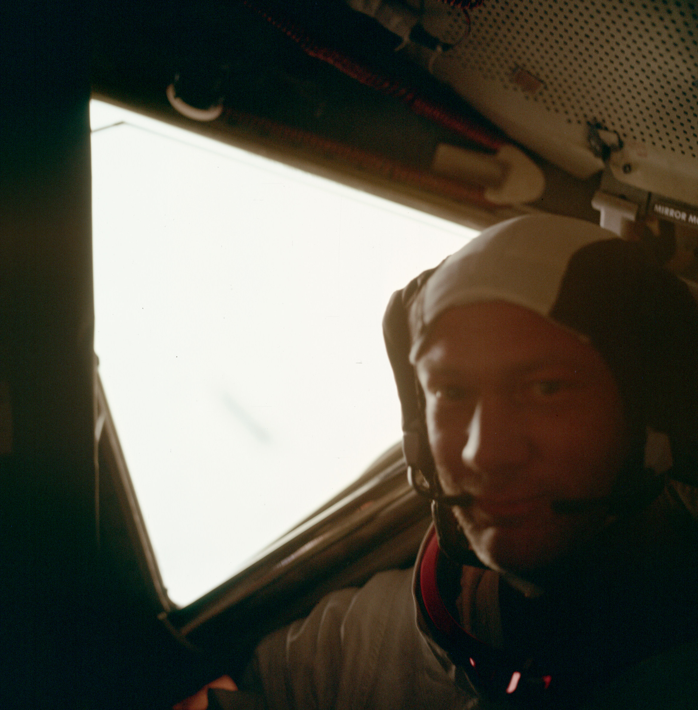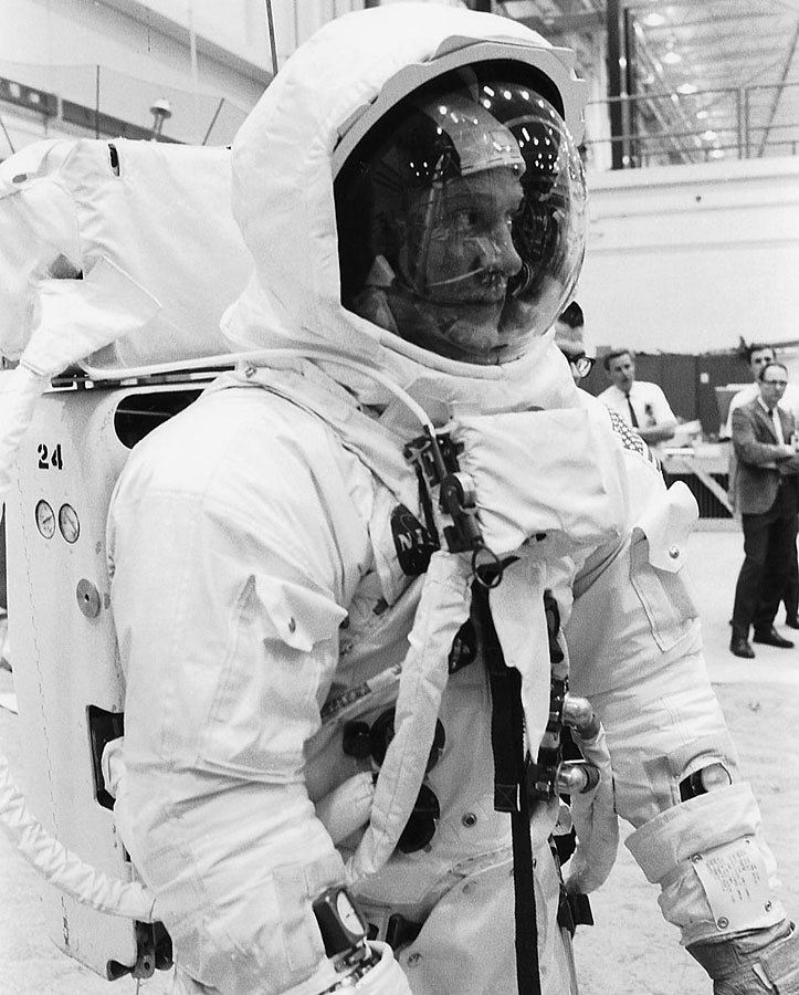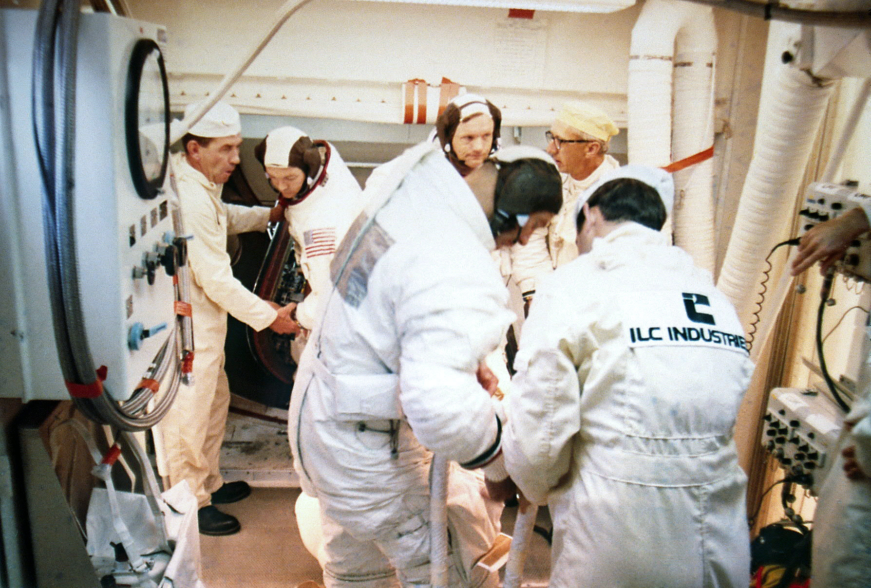 The fact that Neil is wearing his "Hornet Plus Three" badge suggests that this photo was taken on-board the recovery ship. Unknown photographer. Scan courtsey Connie Moore/NASA HQ.S69-40210 ( 1.1 Mb )