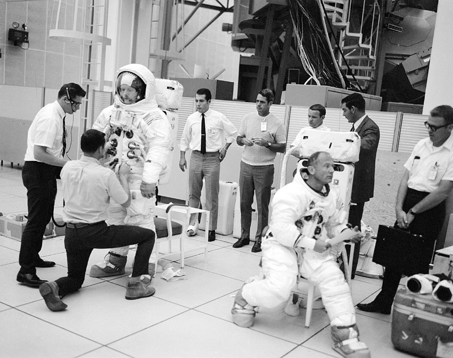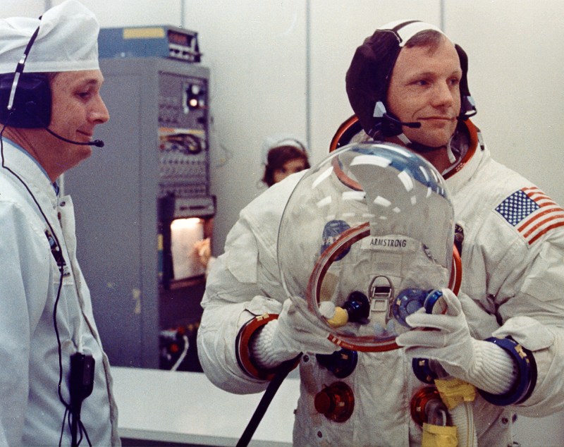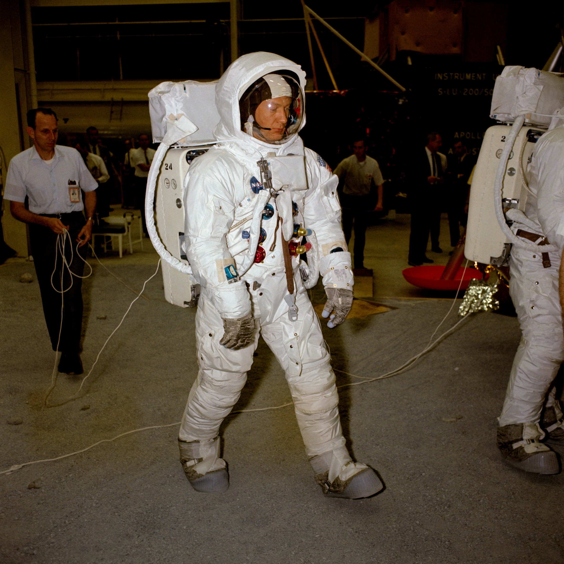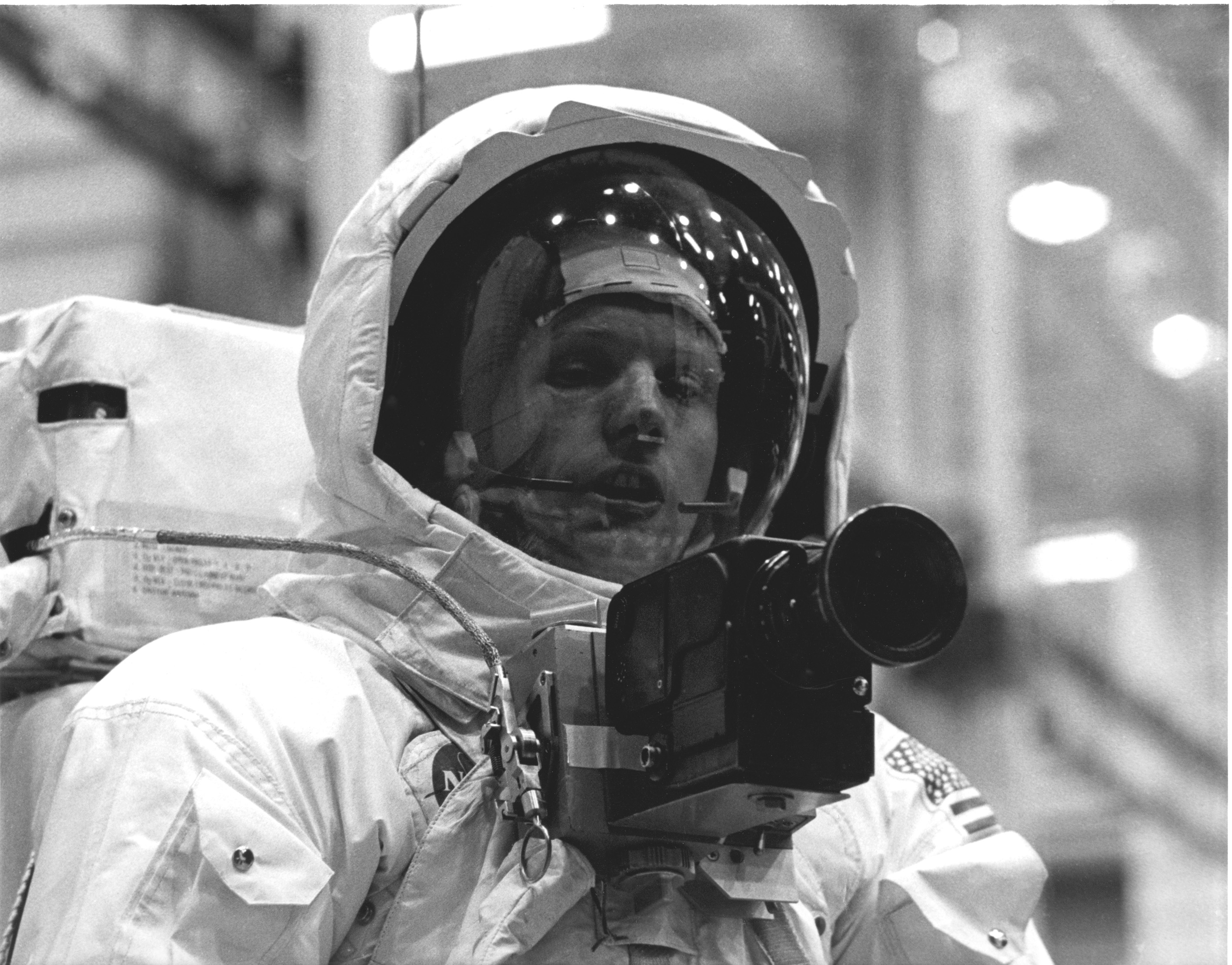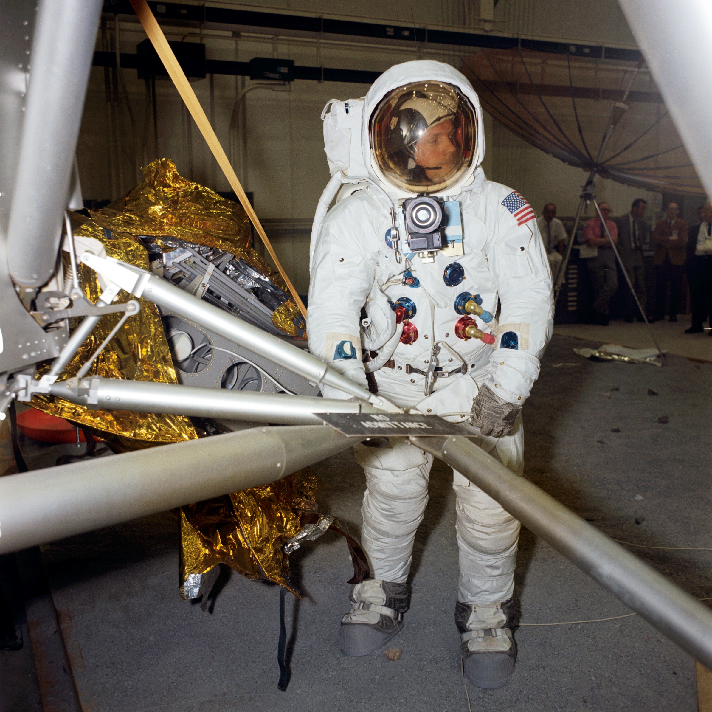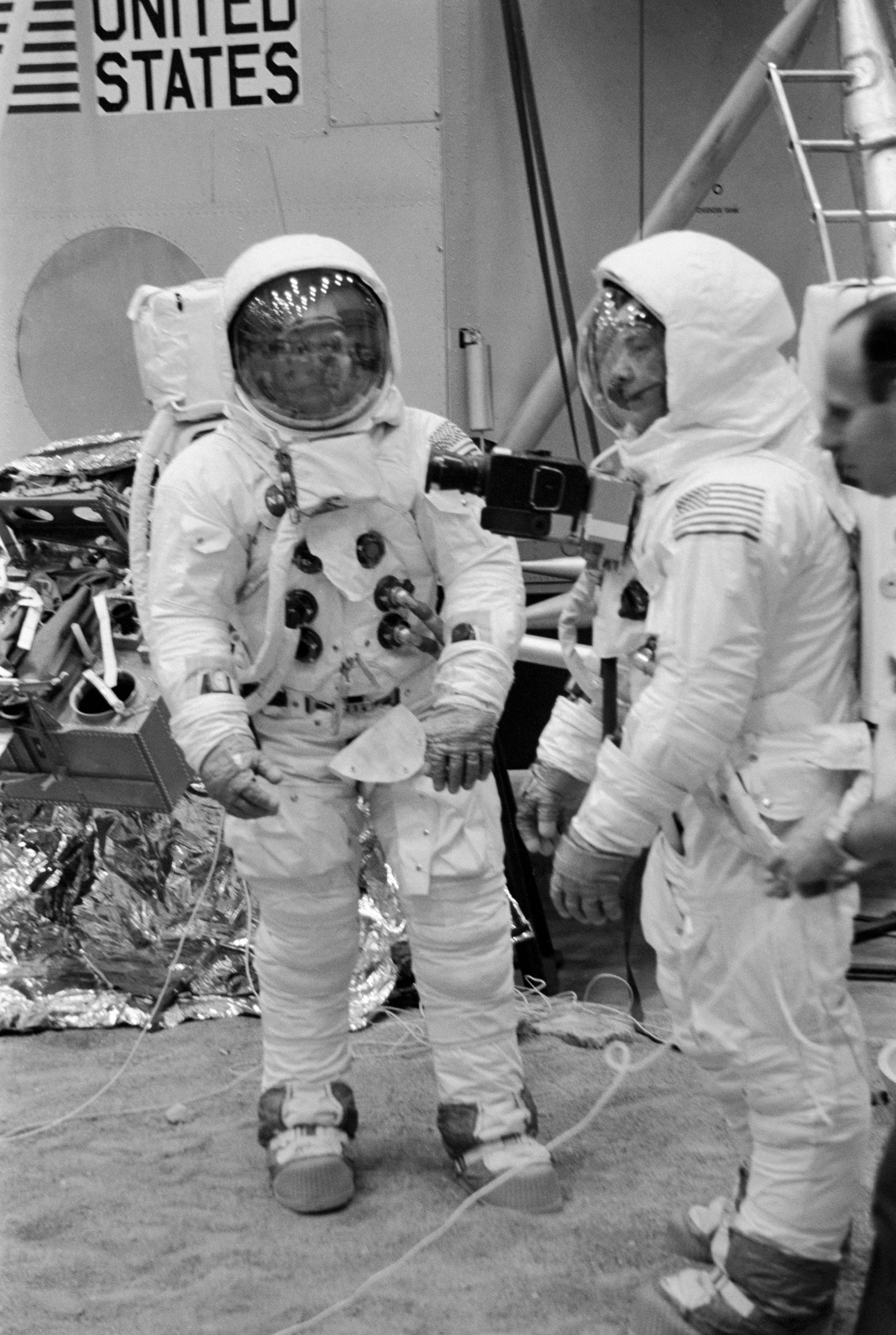 The fact that Neil is wearing his "Hornet Plus Three" badge suggests that this photo was taken on-board the recovery ship. Unknown photographer. Scan courtsey Connie Moore/NASA HQ.S69-40210 ( 1.1 Mb )