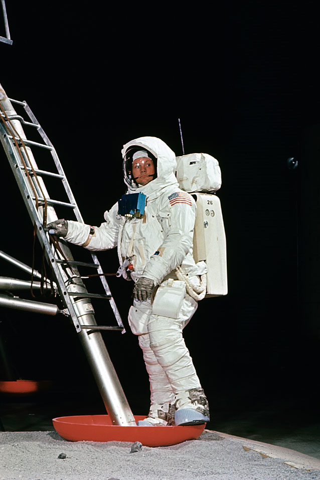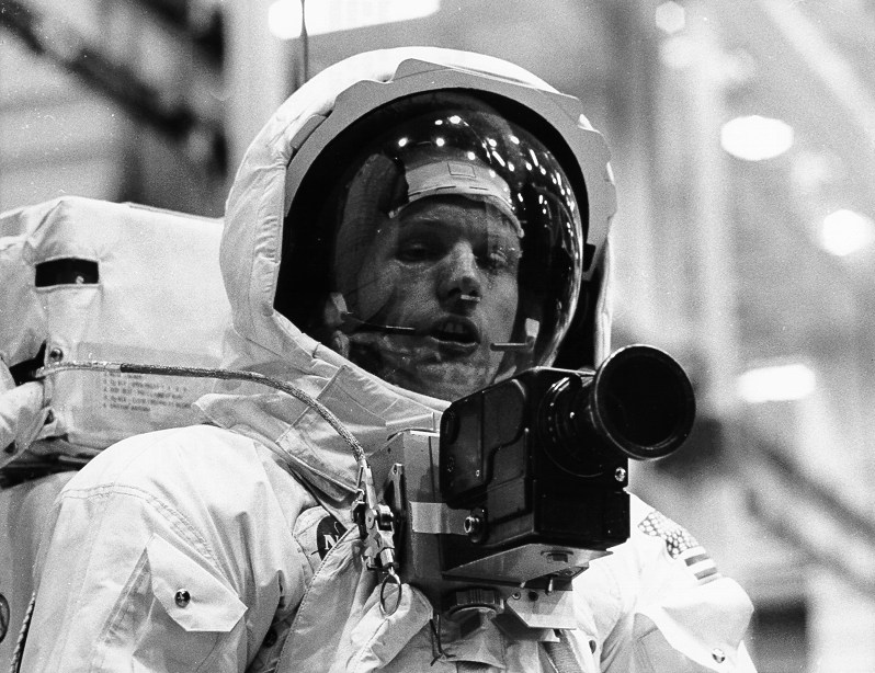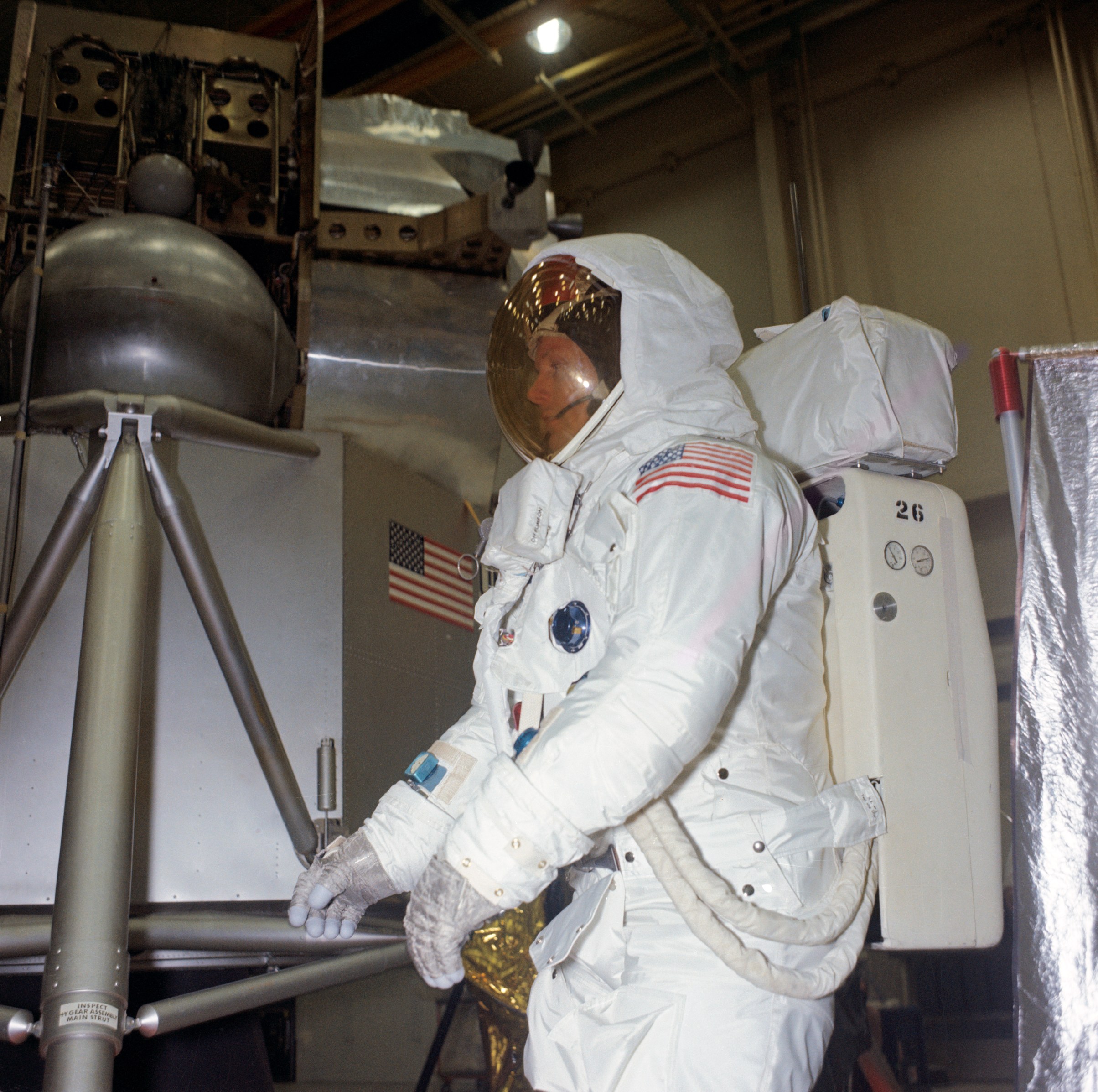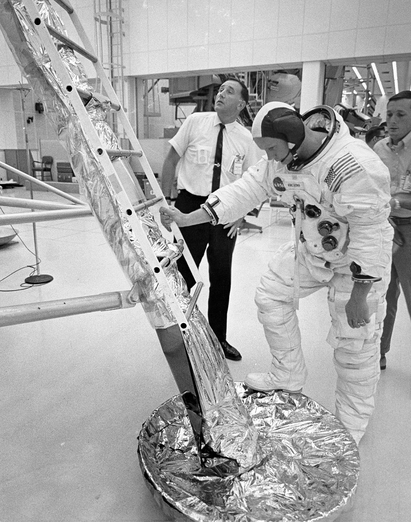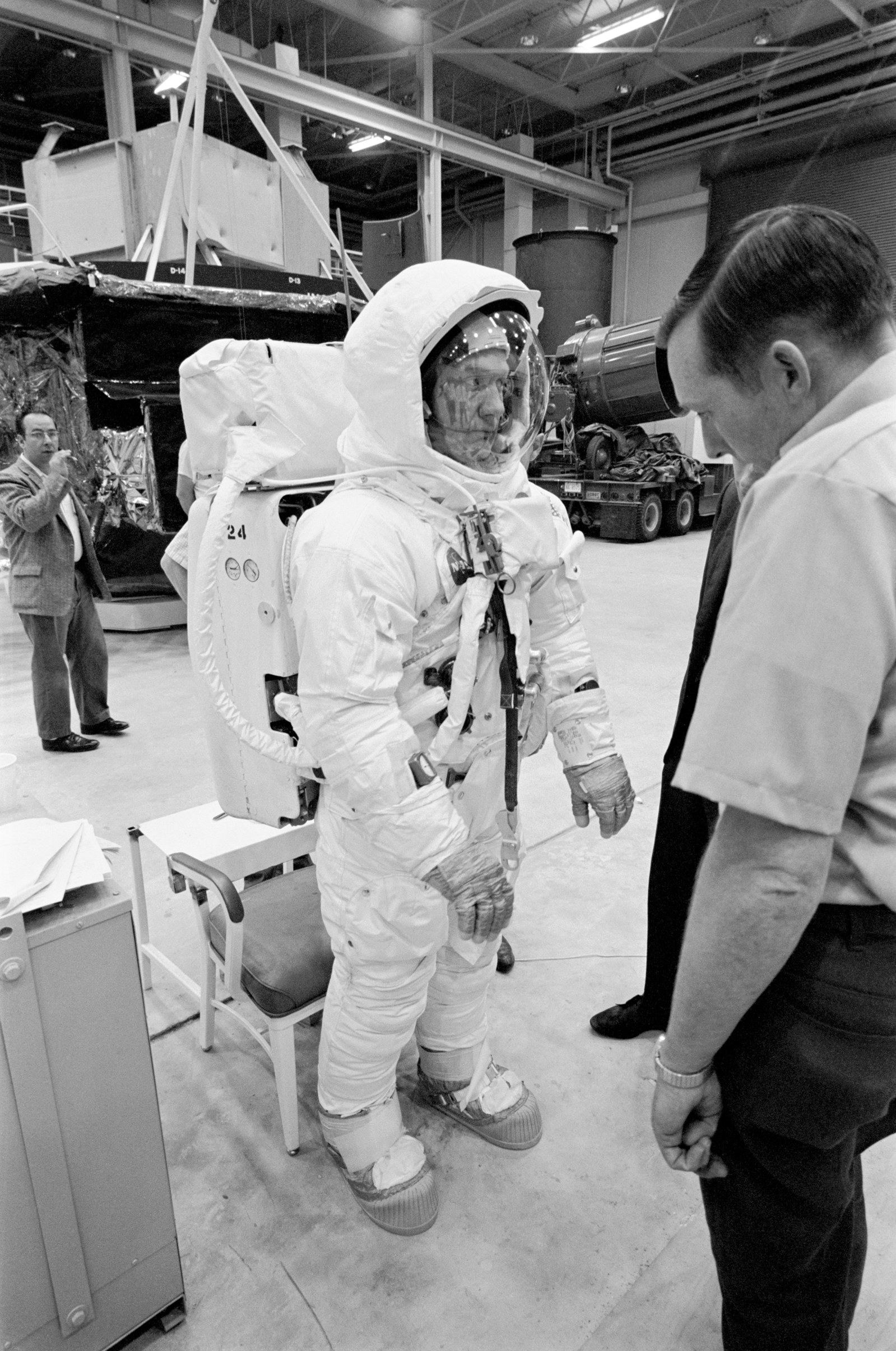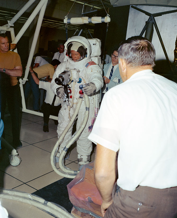 The fact that Neil is wearing his "Hornet Plus Three" badge suggests that this photo was taken on-board the recovery ship. Unknown photographer. Scan courtsey Connie Moore/NASA HQ.S69-40210 ( 1.1 Mb )