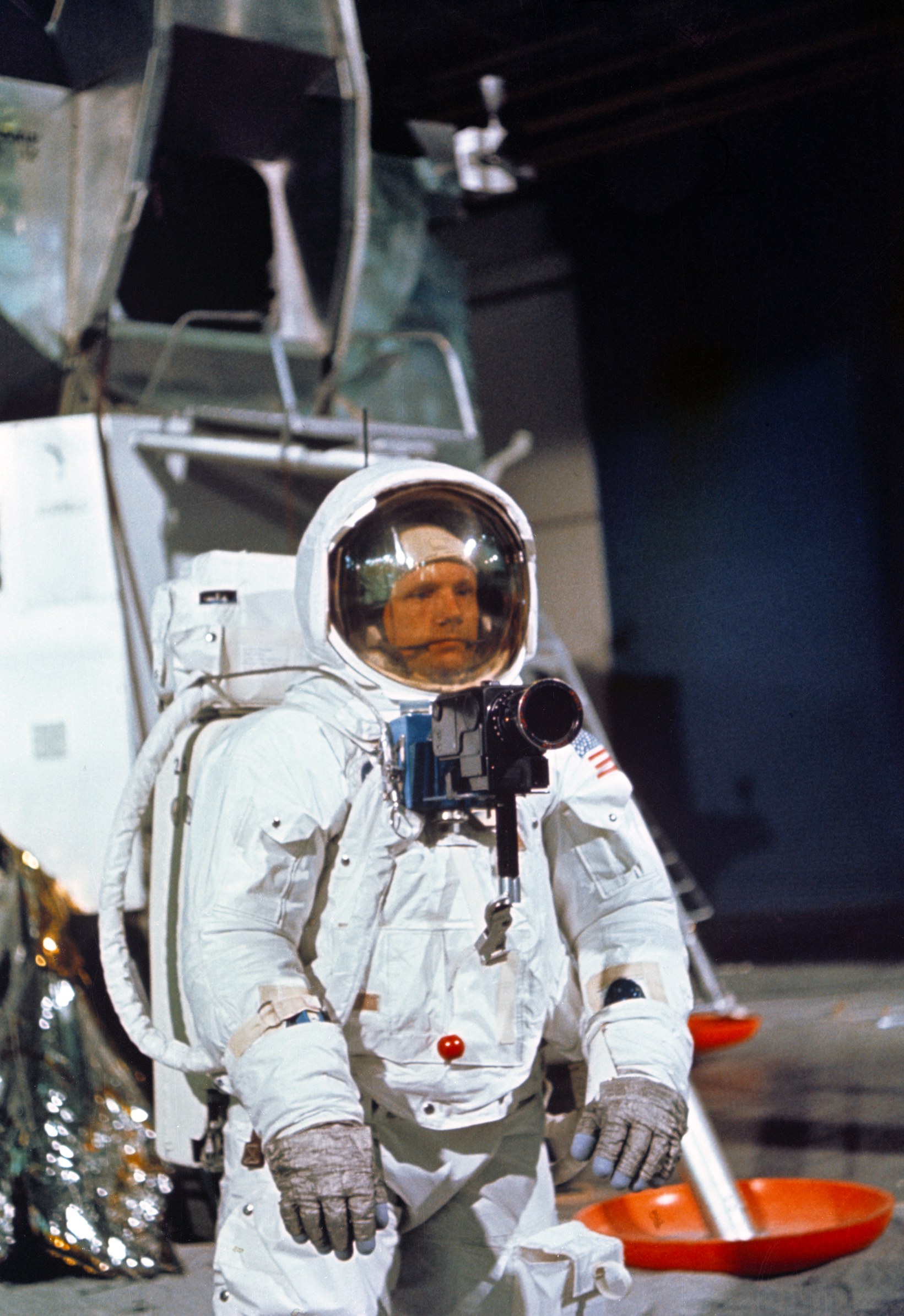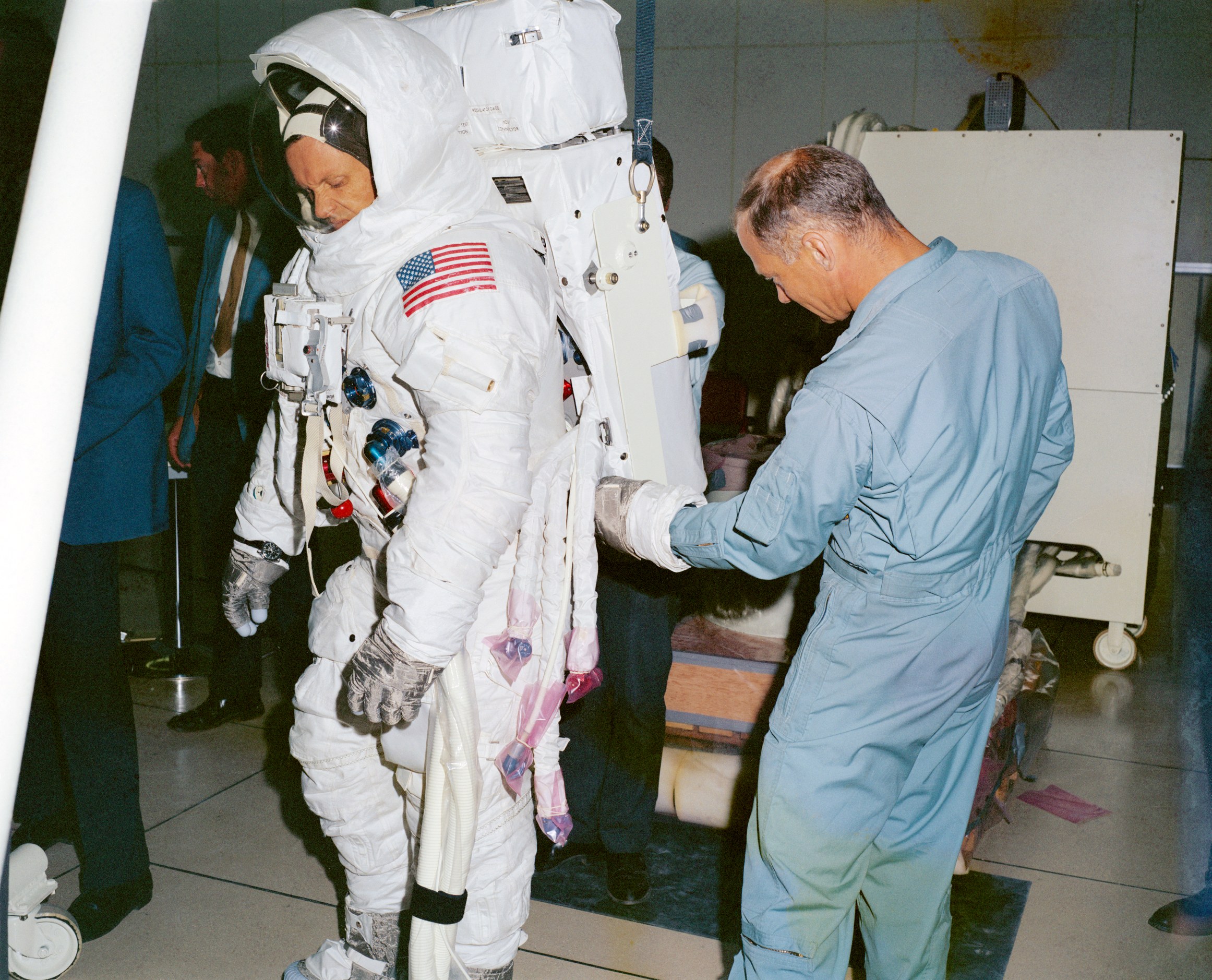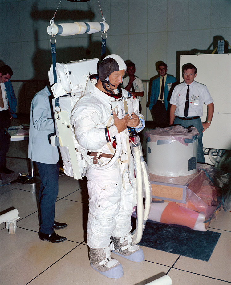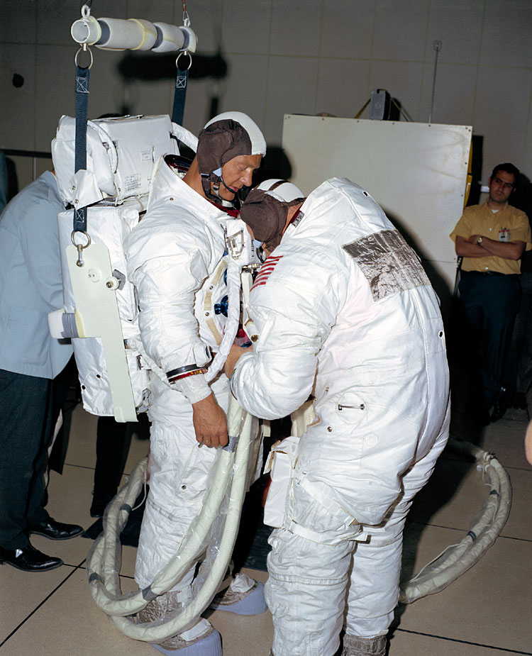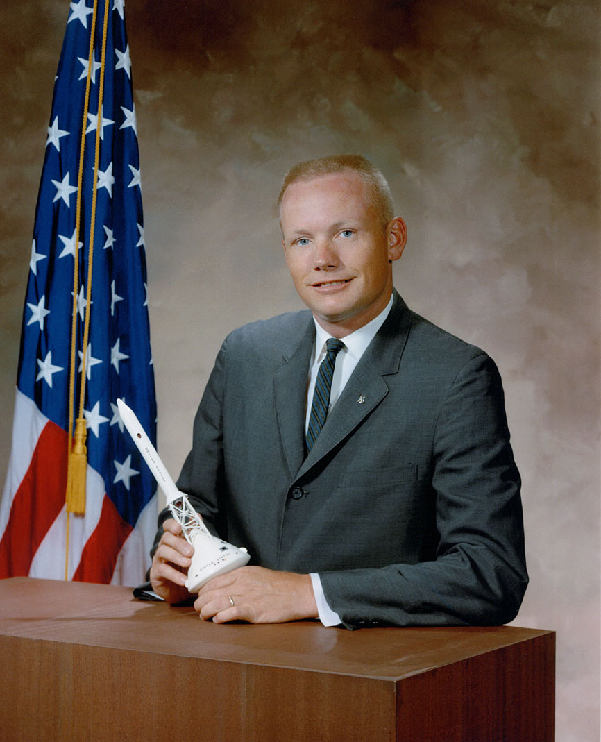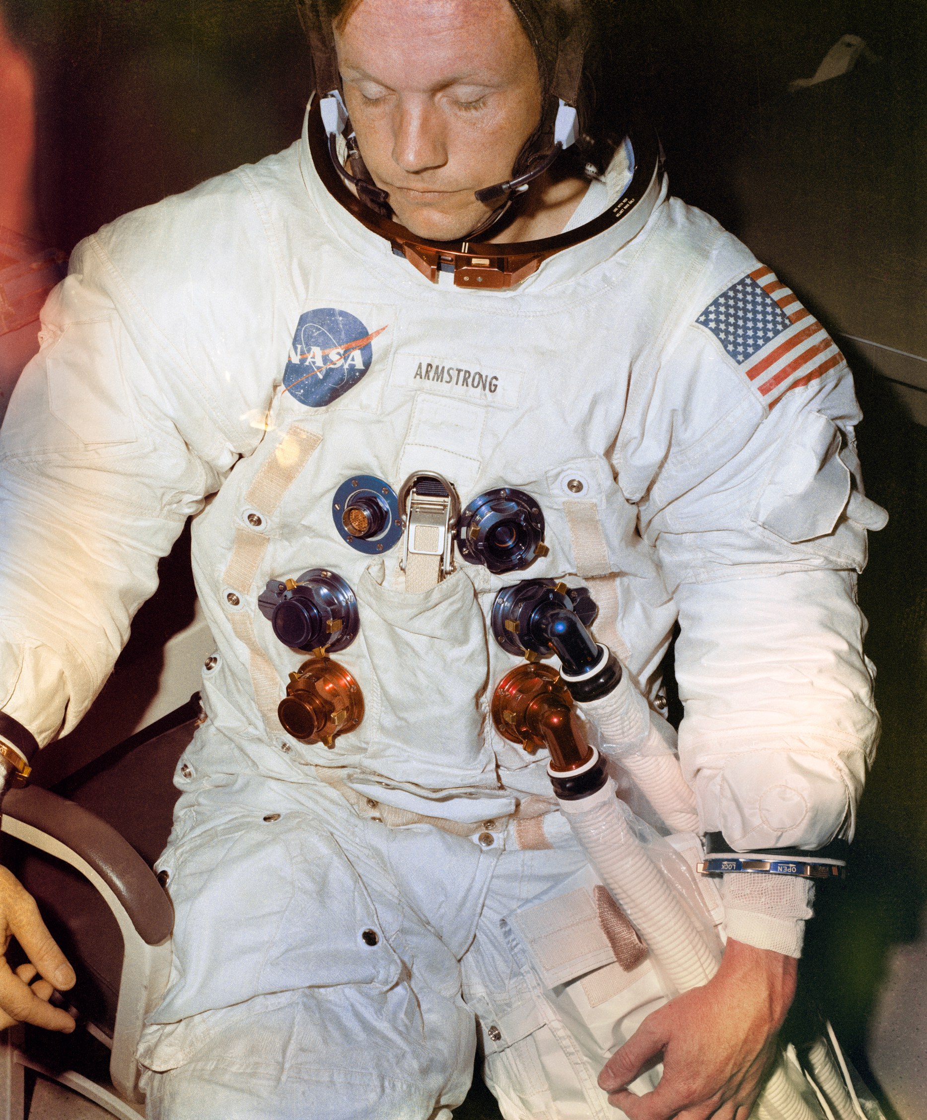 The fact that Neil is wearing his "Hornet Plus Three" badge suggests that this photo was taken on-board the recovery ship. Unknown photographer. Scan courtsey Connie Moore/NASA HQ.S69-40210 ( 1.1 Mb )
