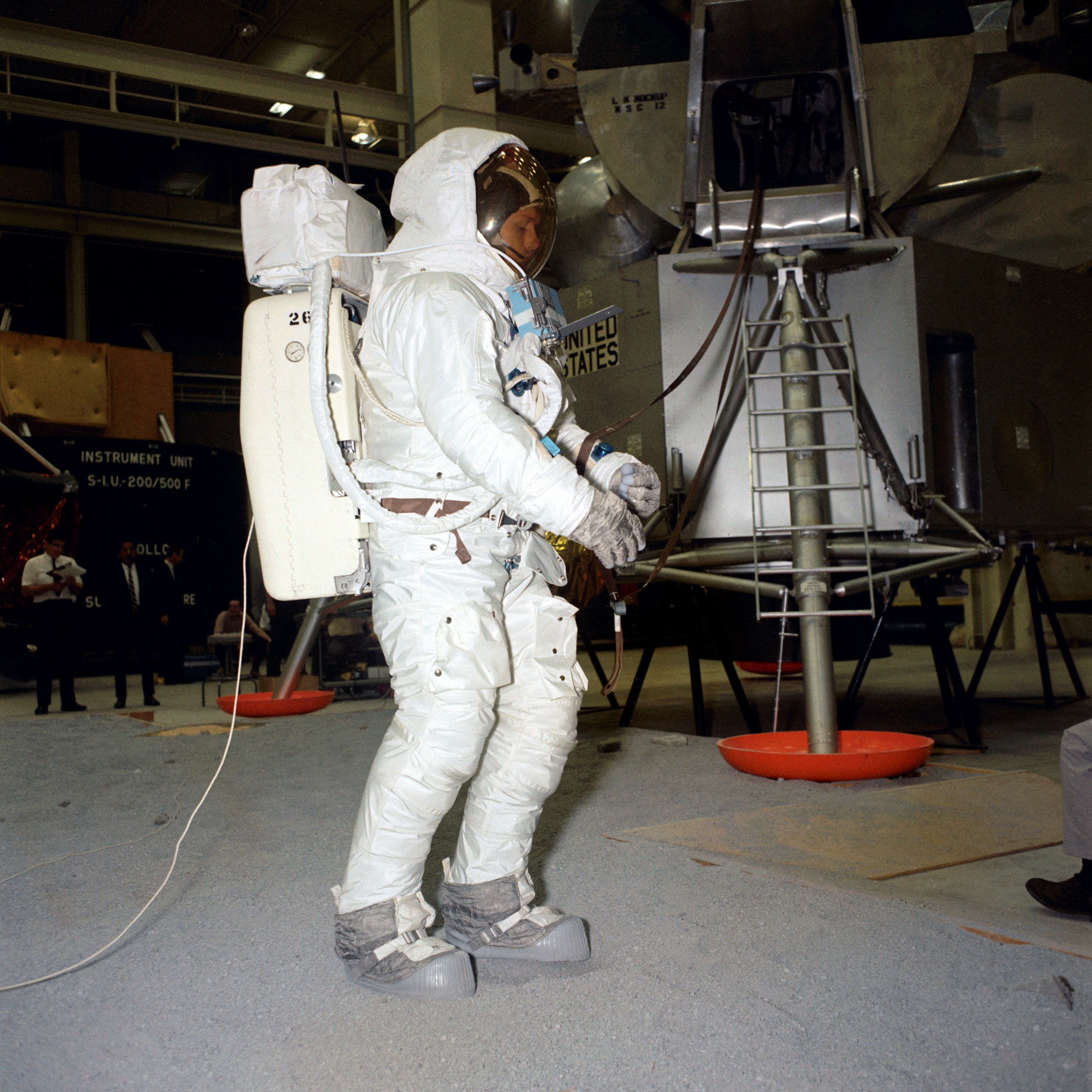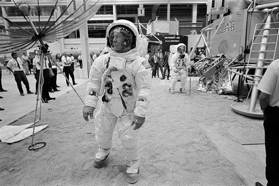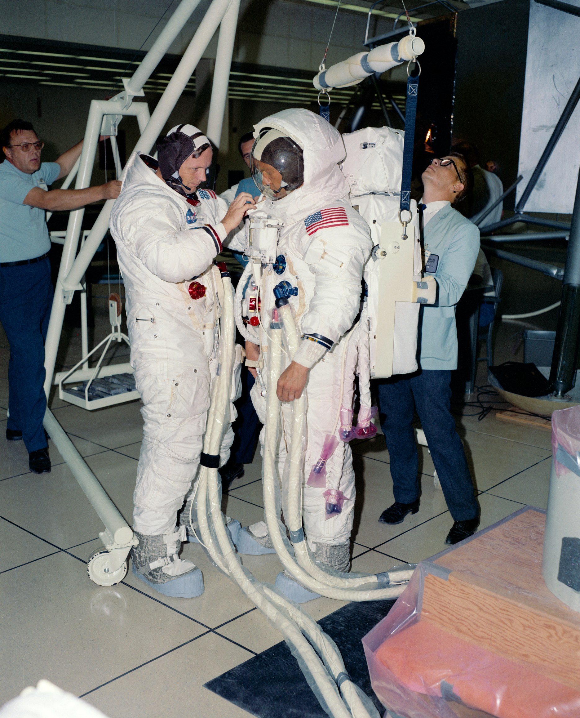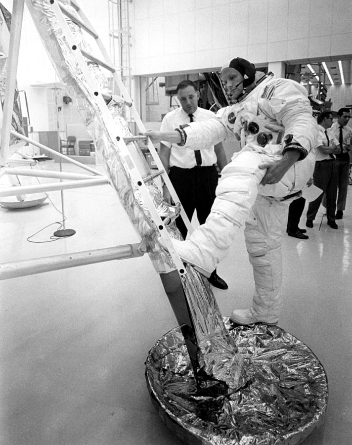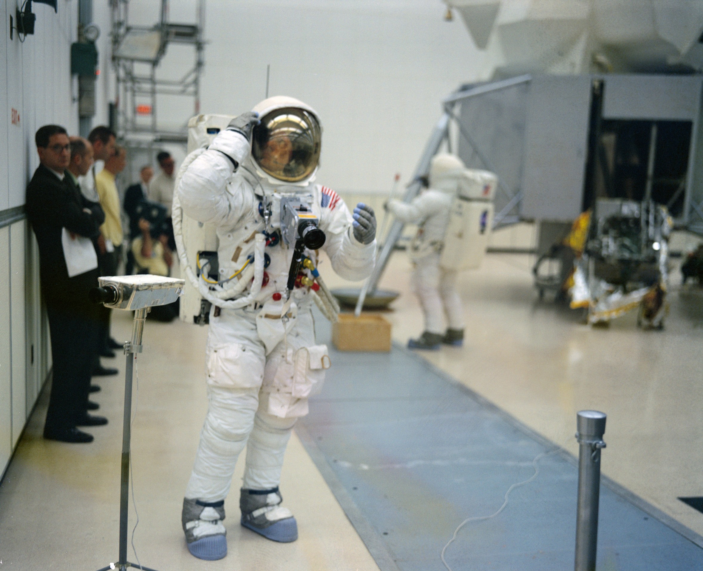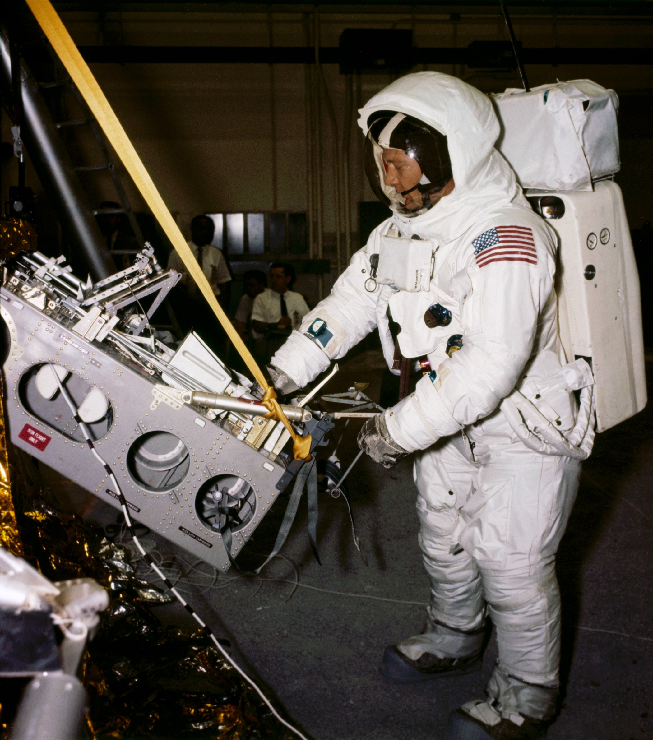 The fact that Neil is wearing his "Hornet Plus Three" badge suggests that this photo was taken on-board the recovery ship. Unknown photographer. Scan courtsey Connie Moore/NASA HQ.S69-40210 ( 1.1 Mb )