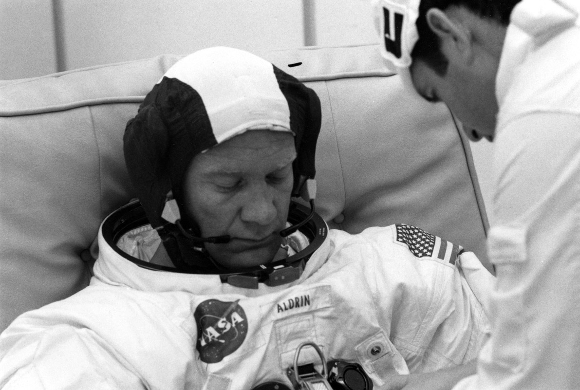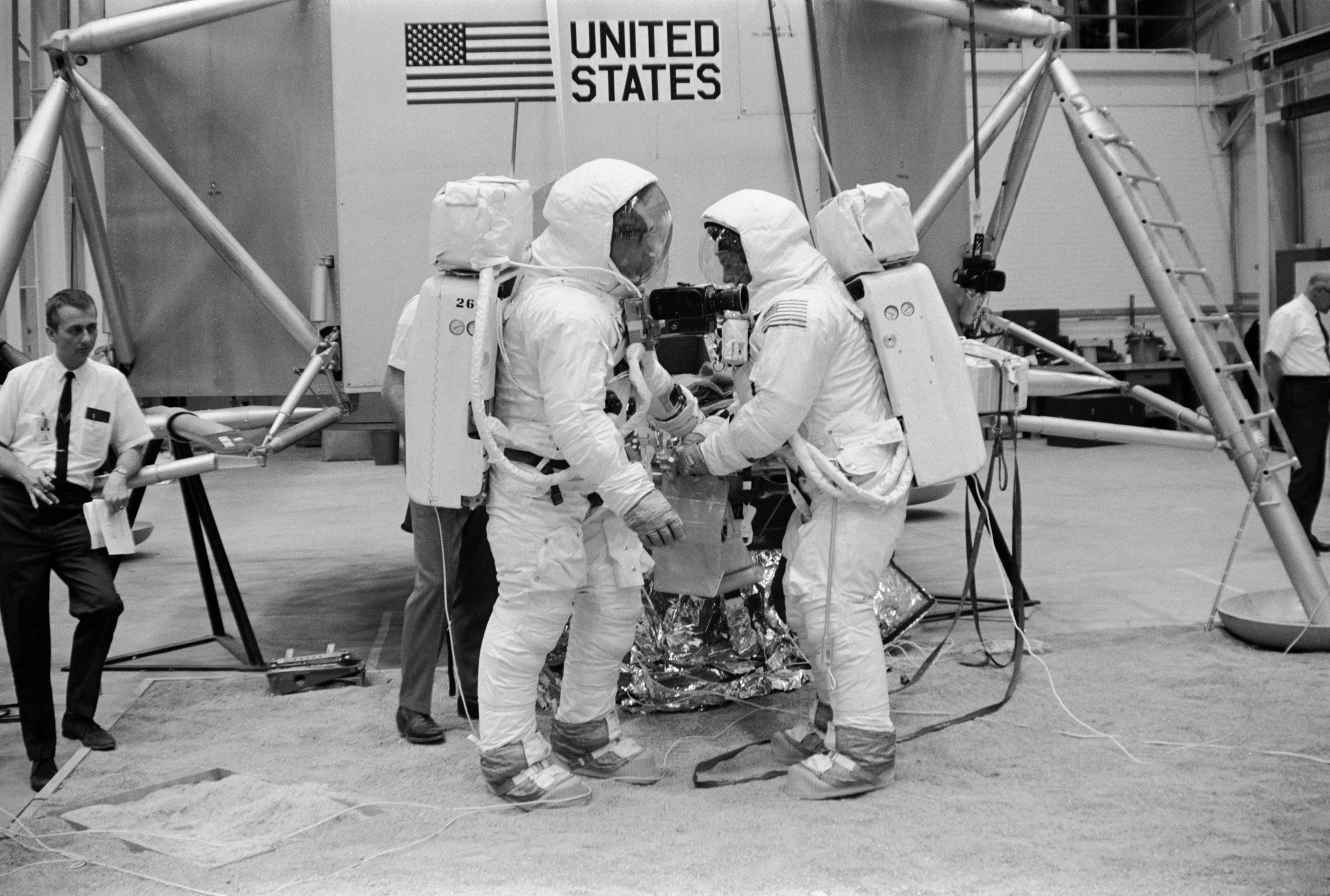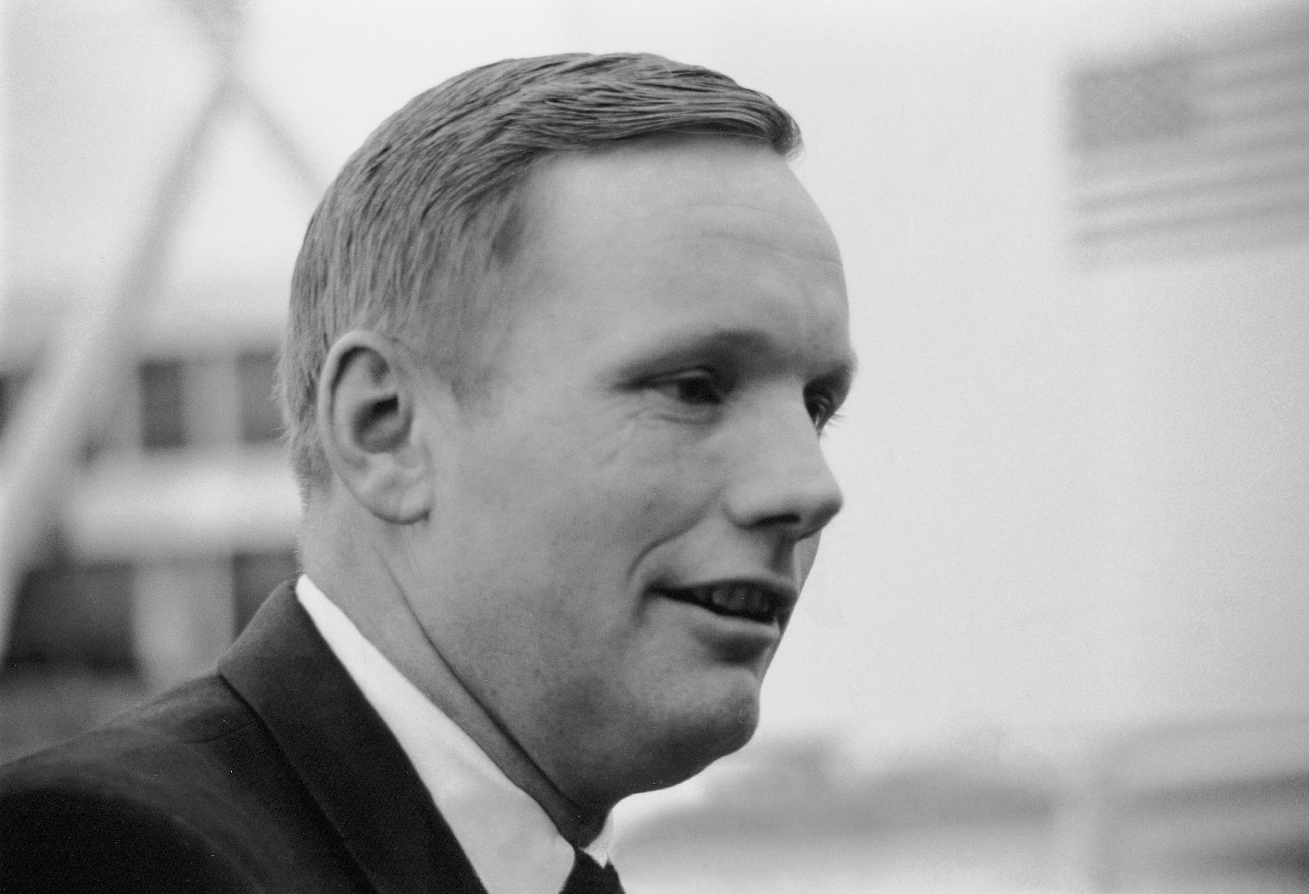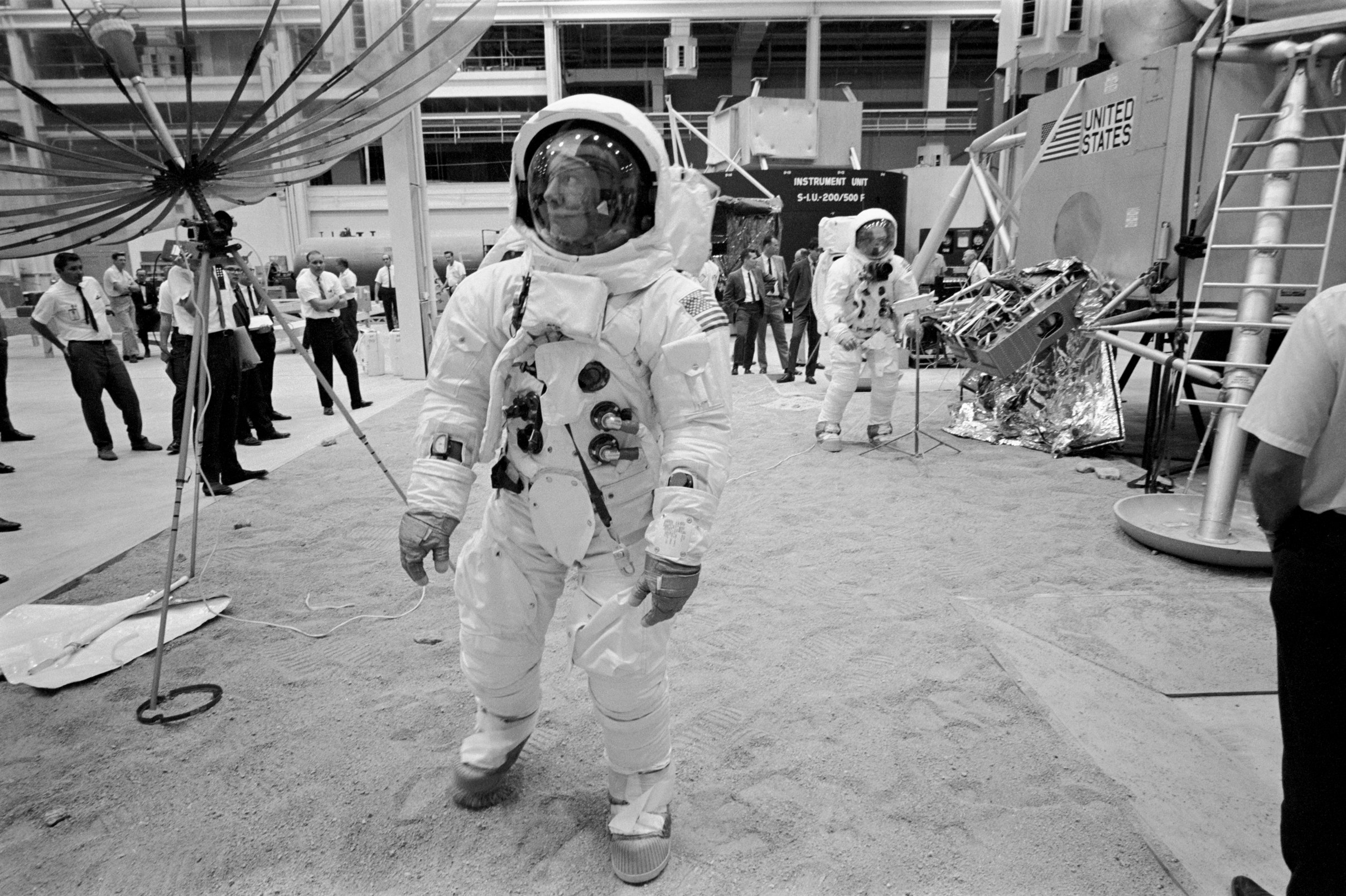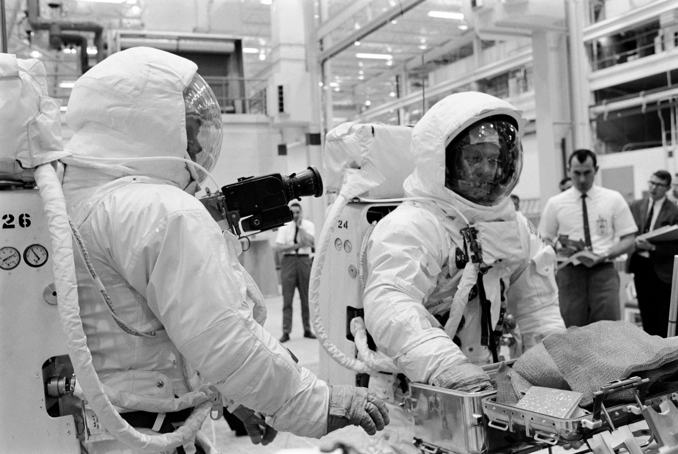 The fact that Neil is wearing his "Hornet Plus Three" badge suggests that this photo was taken on-board the recovery ship. Unknown photographer. Scan courtsey Connie Moore/NASA HQ.S69-40210 ( 1.1 Mb )