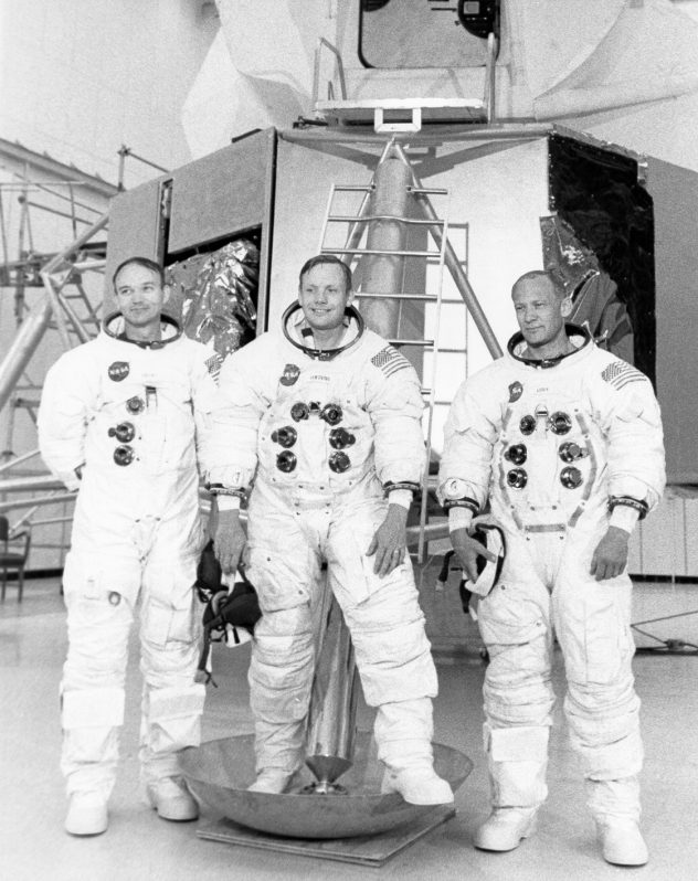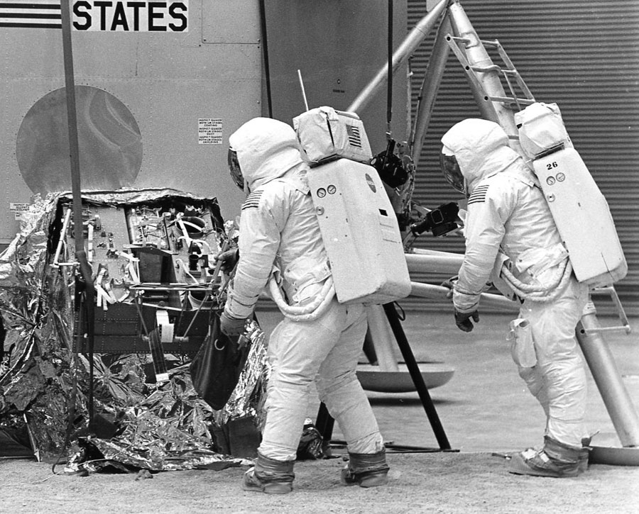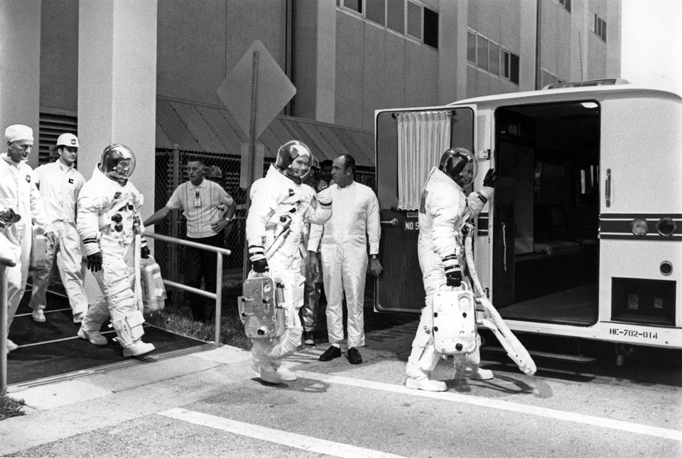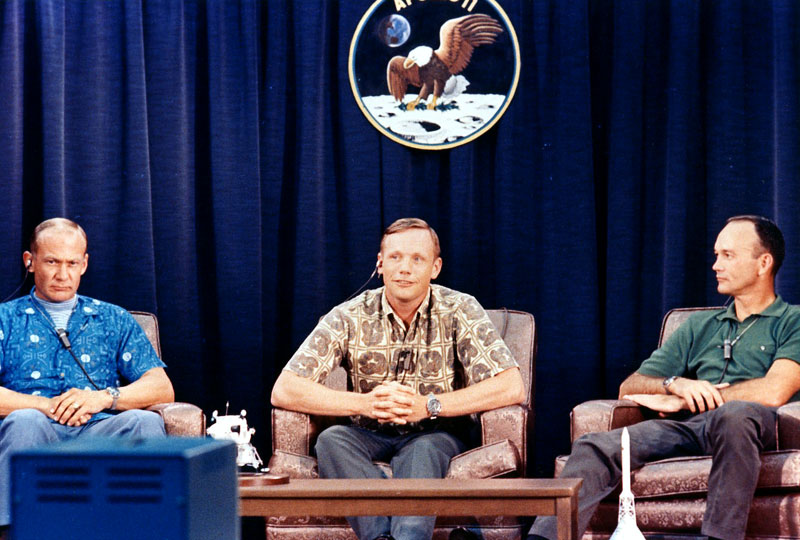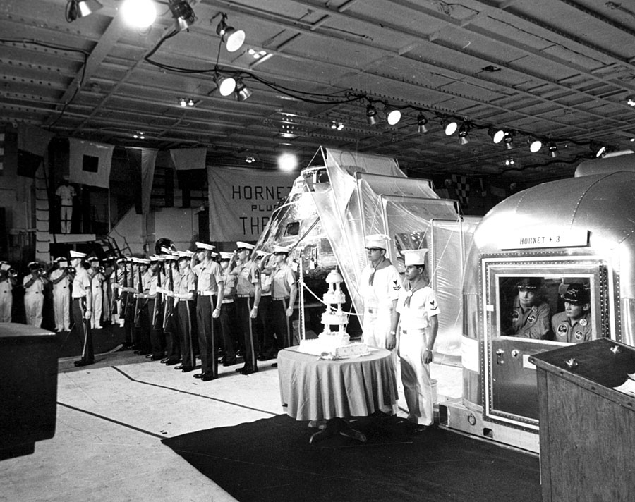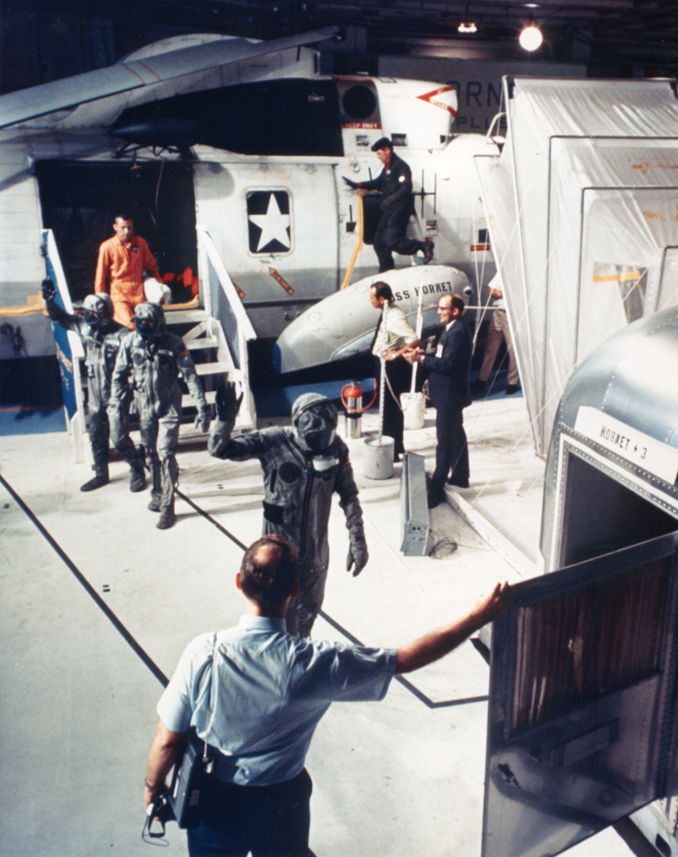 The Apollo 11 crewmen, wearing biological isolation garments, arrive aboard the U.S.S. Hornet during recovery operations in the central Pacific. 24 July 1969. Scan by Ed Hengeveld.USS Hornet Patch ( 143k )