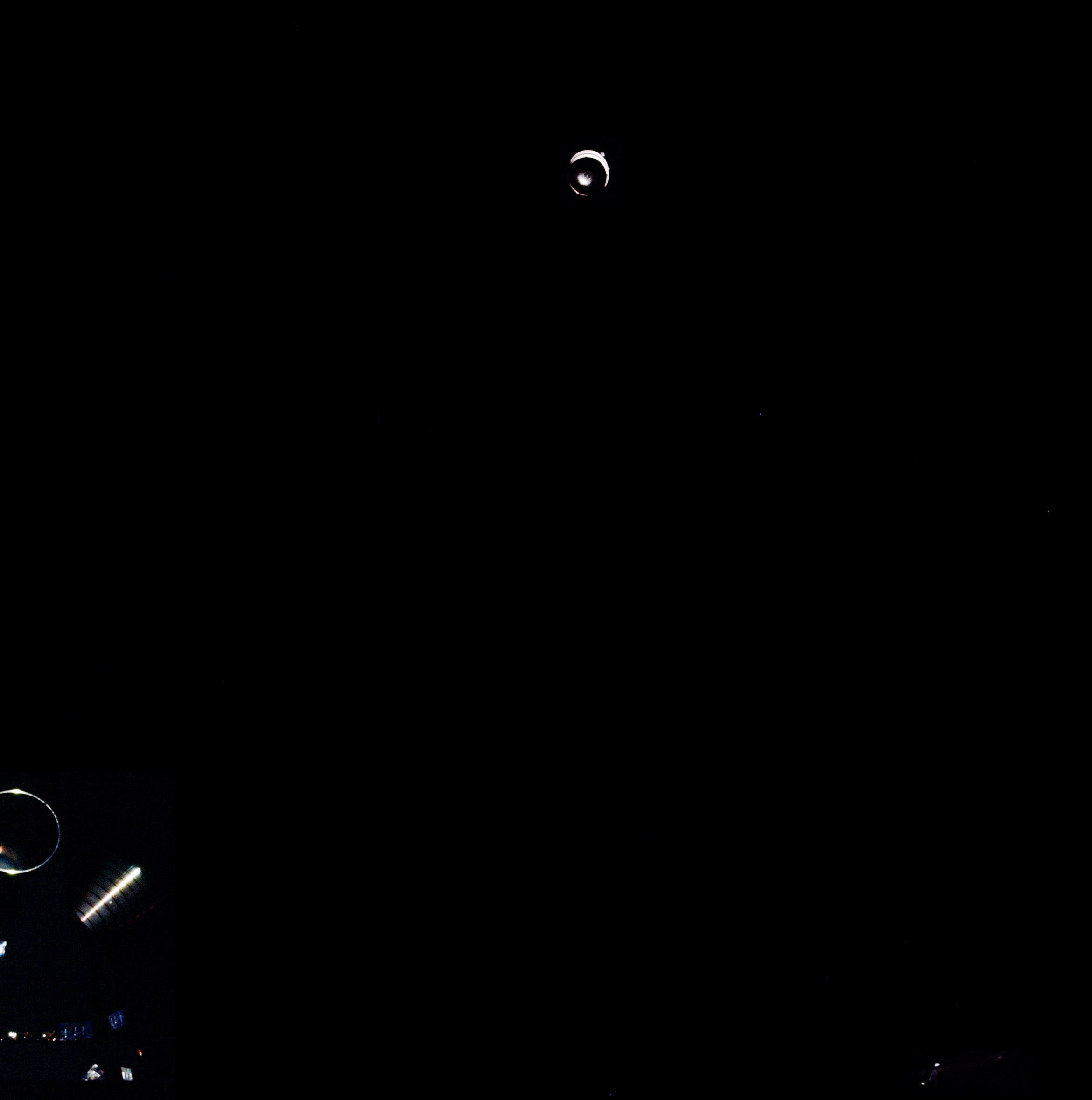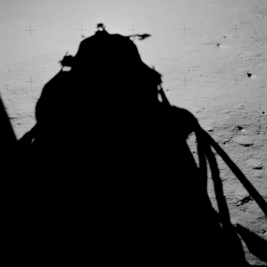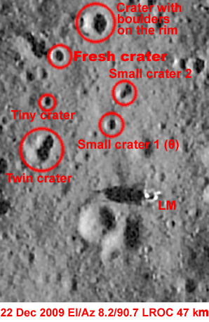 Sunset view of the landing site with primarily crater rims and the body of the LM descent stage illuminated. A 3x detail shows the descent stage shadow overlapping Little West Crater. The raw LROC file is M132678405R. The landing site lat/long is 0.67N/23.47E. The LRO spacecraft was at 0.6N/23.38E.29 July 2010 08:53:03 UTC First Pass; Solar El/Az 28.9/268.8; LRO altitude 46 km. (3.8 Mb)Deconvolved, 0.25 m/pixel (2.3 Mb TIF) and 0.5 m/pixel (3.9 Mb TIF) versions by GoneToPlaid.