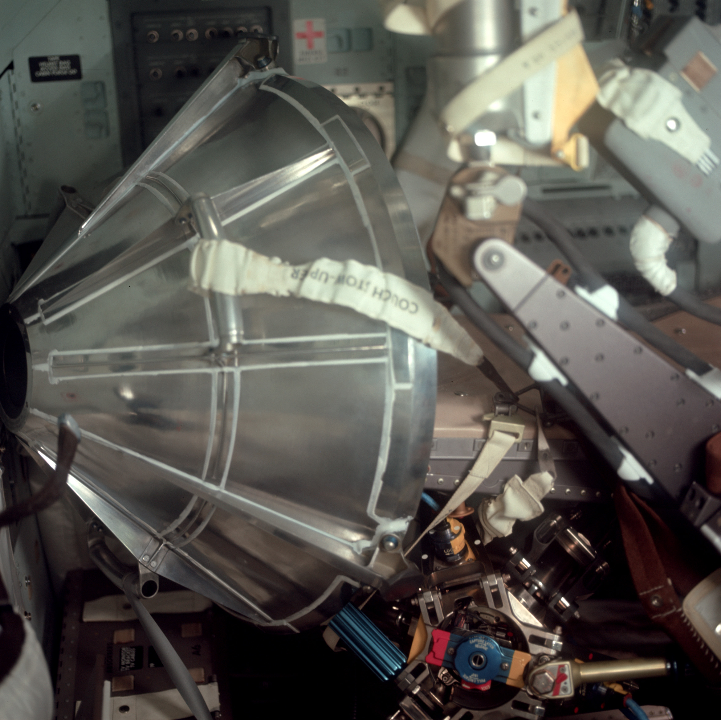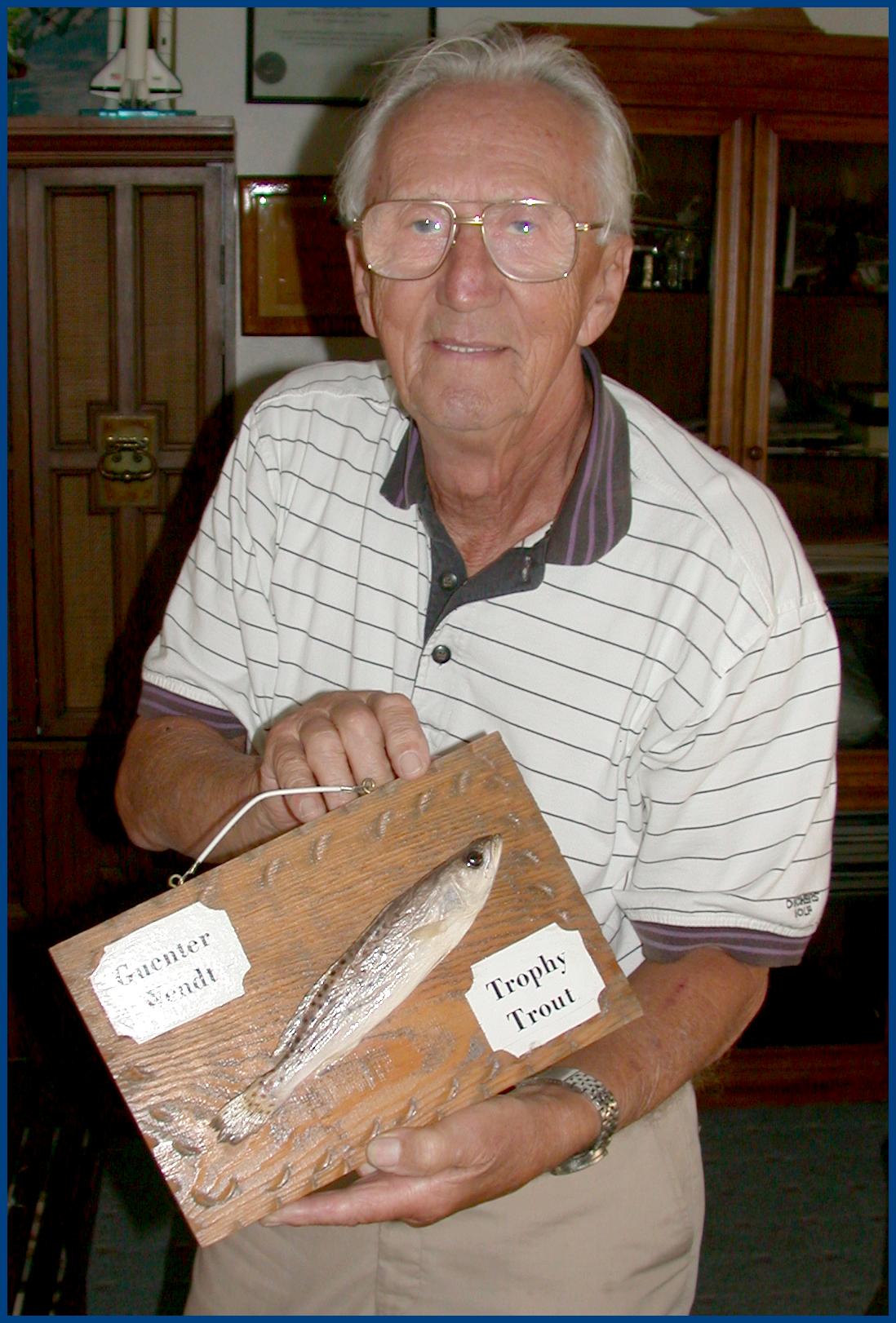 In 2002, Guenter Wendt holds the trout trophy presented to him by Mike Collins just prior to the Apollo 11 launch. Collins and Wendt spent quite a bit of time fishing together and the full story of the trophy can be found on page 132 in Wendt's 2001 autobiography "The Unbroken Chain". Photo and scan courtesy Ulrich Lotzmann.Command Module Columbia with Sextant and Telescope Aperatures Labelled (90k)