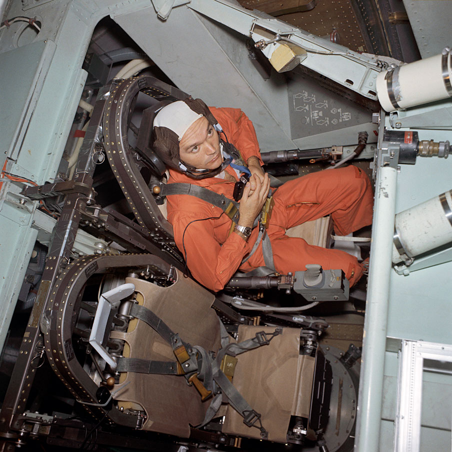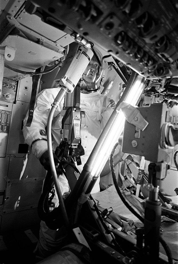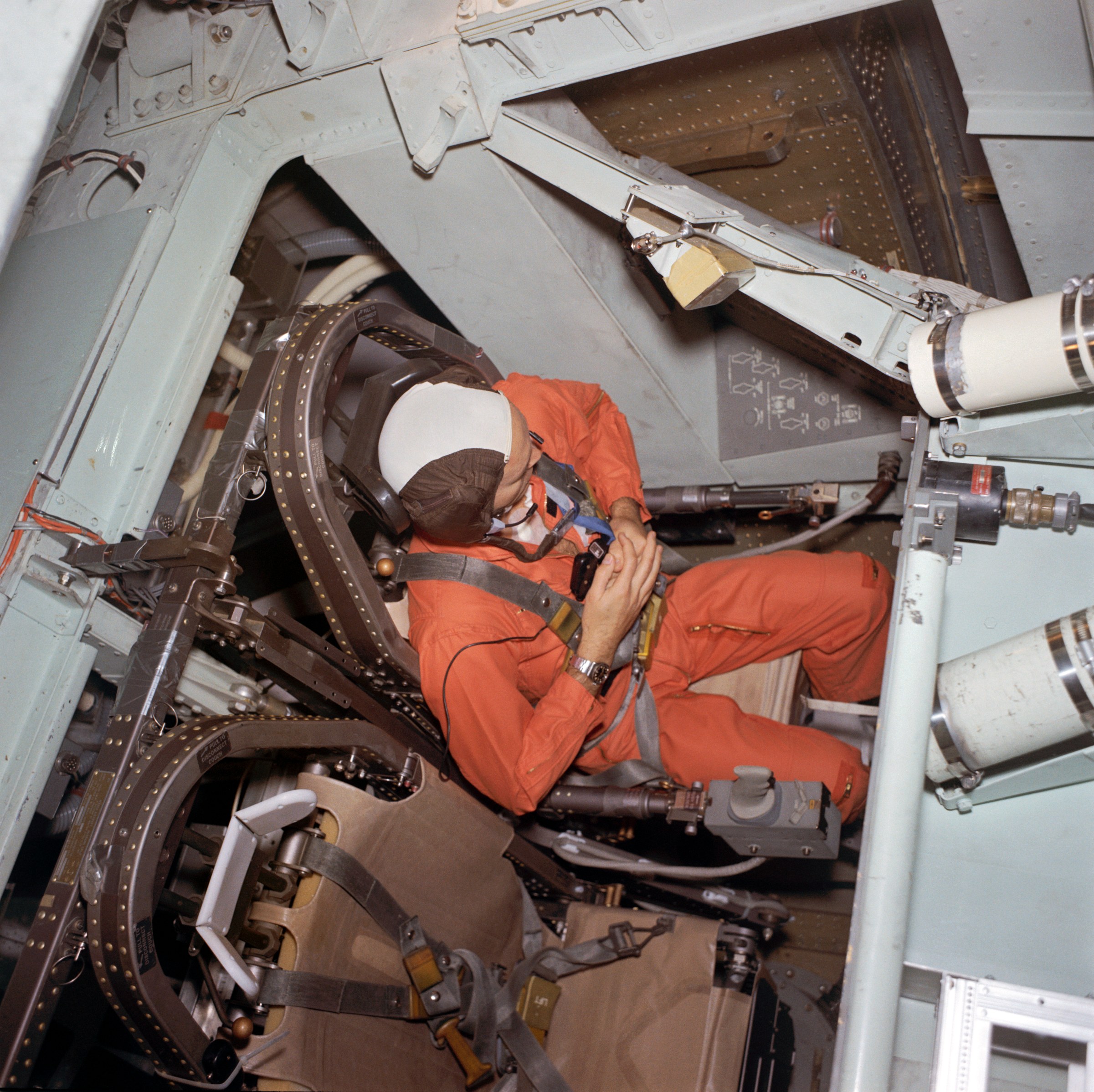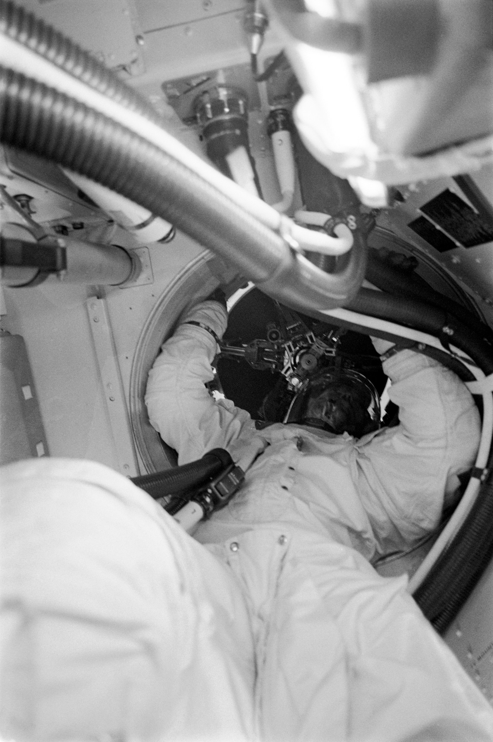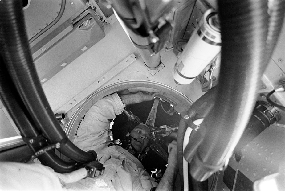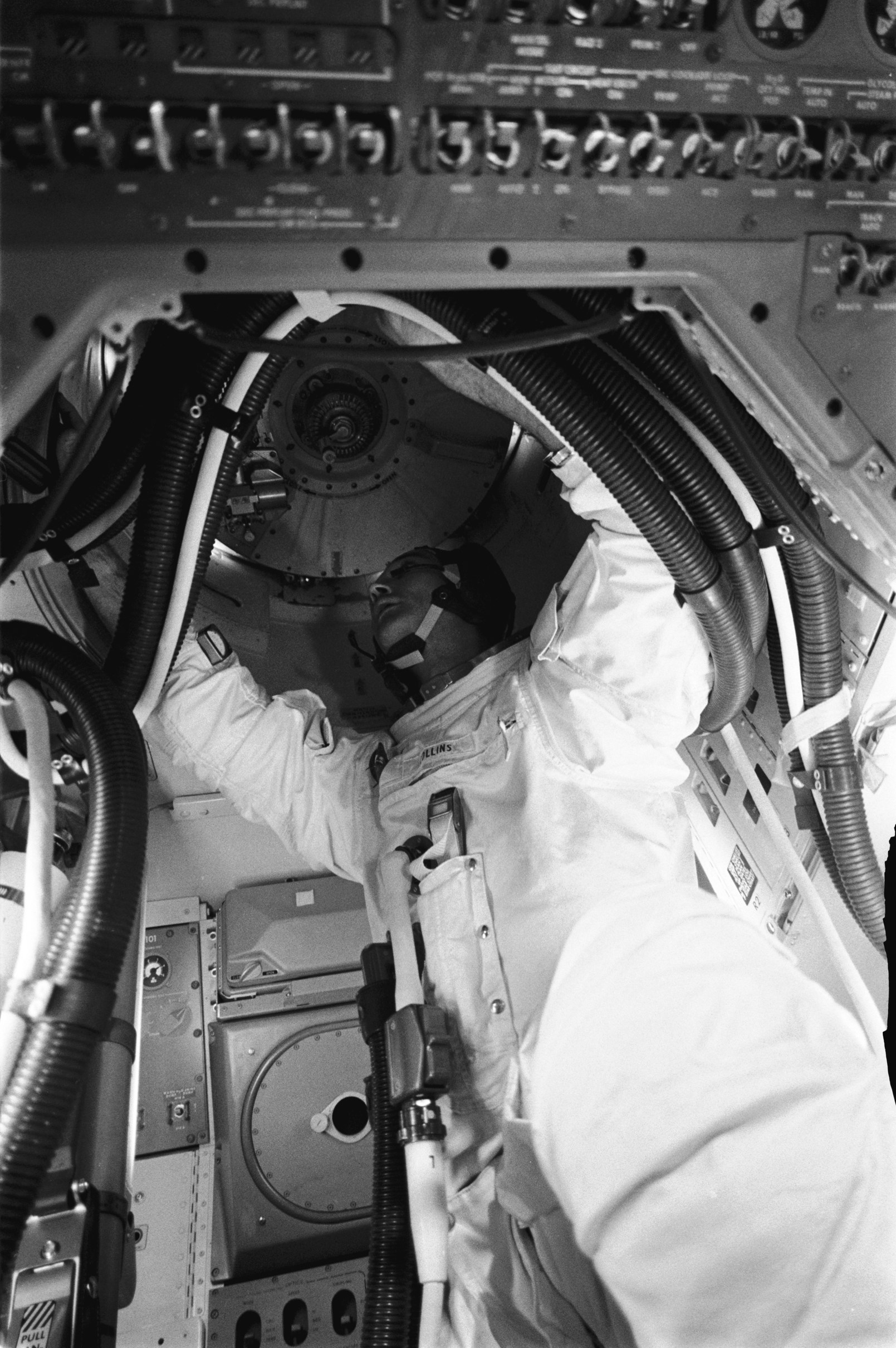 Mike Collins sits in hatch of Apollo 11 Command Module after its return to the Lunar Receiving Laboratory for detailed examination. Scan by J.L Pickering.69-H-1421 ( 136k )
