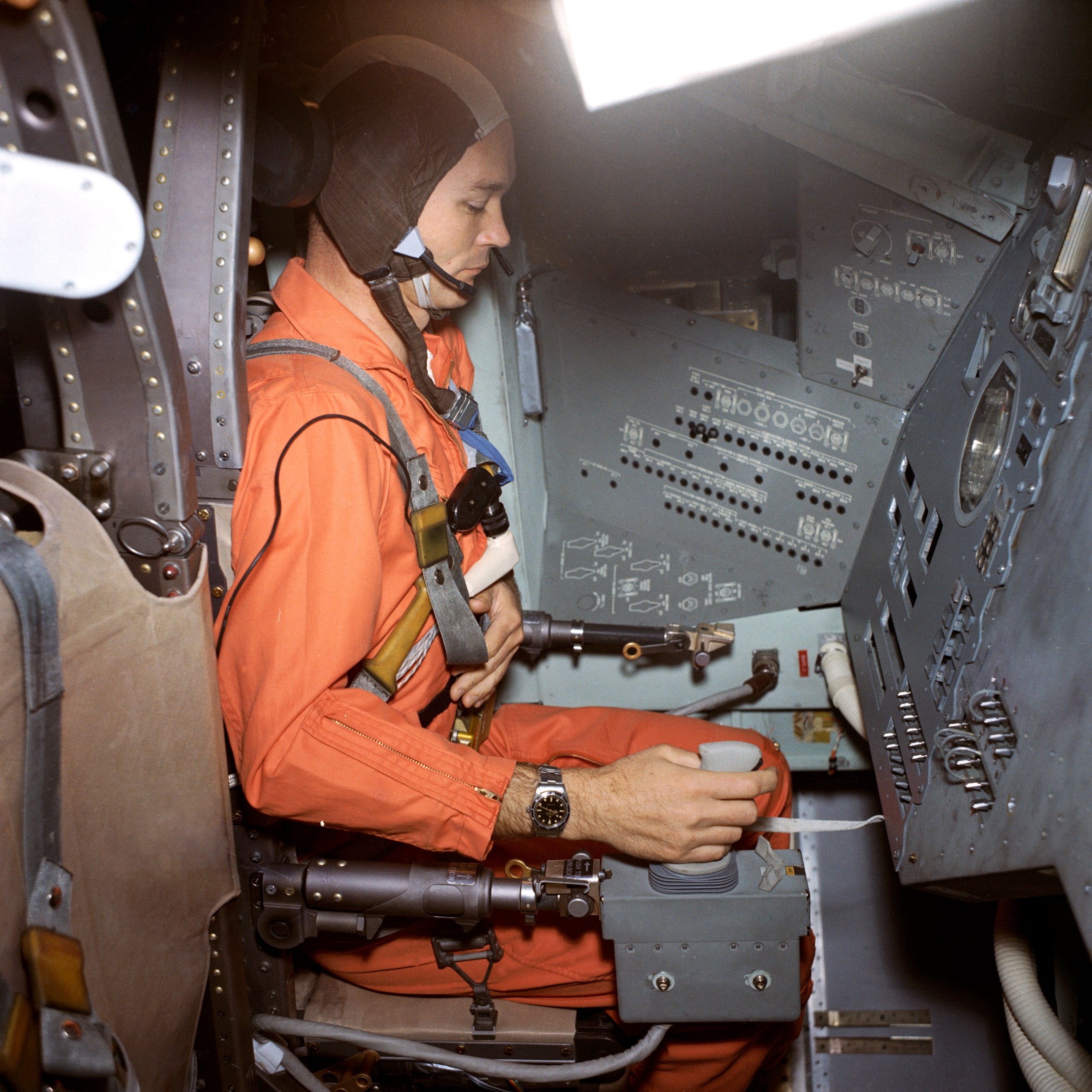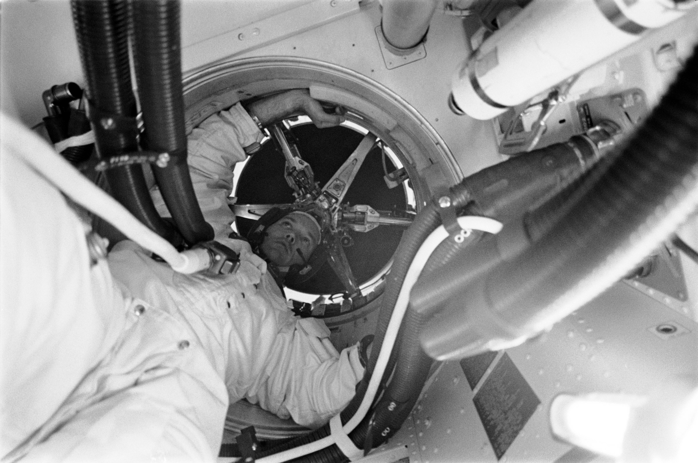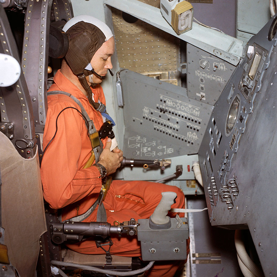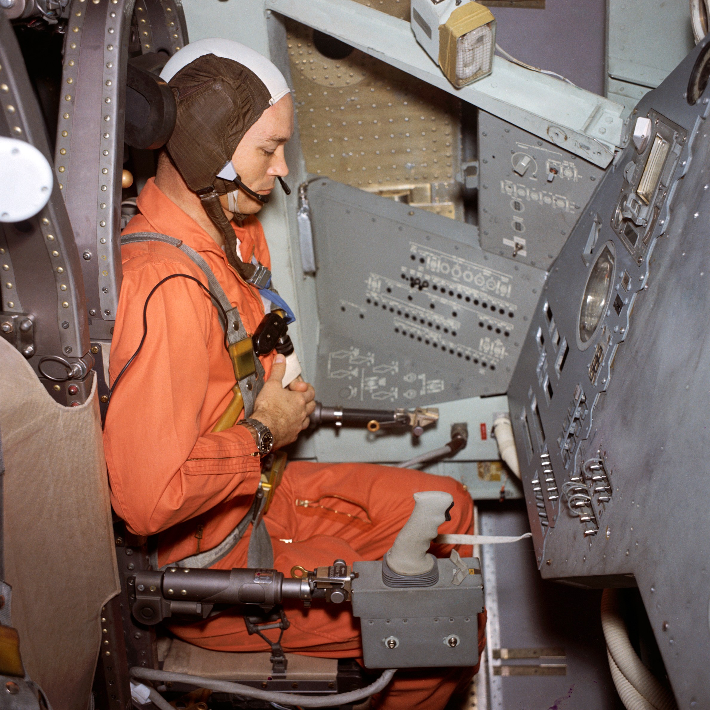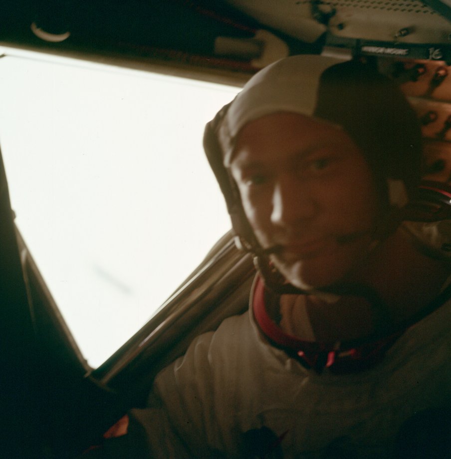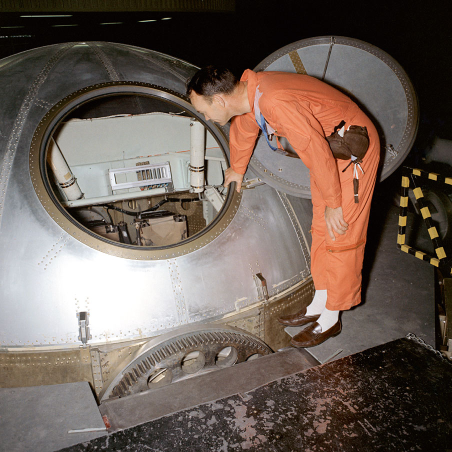 Mike Collins sits in hatch of Apollo 11 Command Module after its return to the Lunar Receiving Laboratory for detailed examination. Scan by J.L Pickering.69-H-1421 ( 136k )