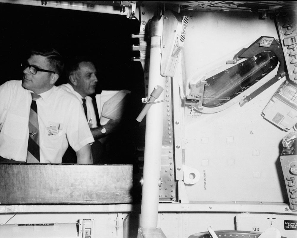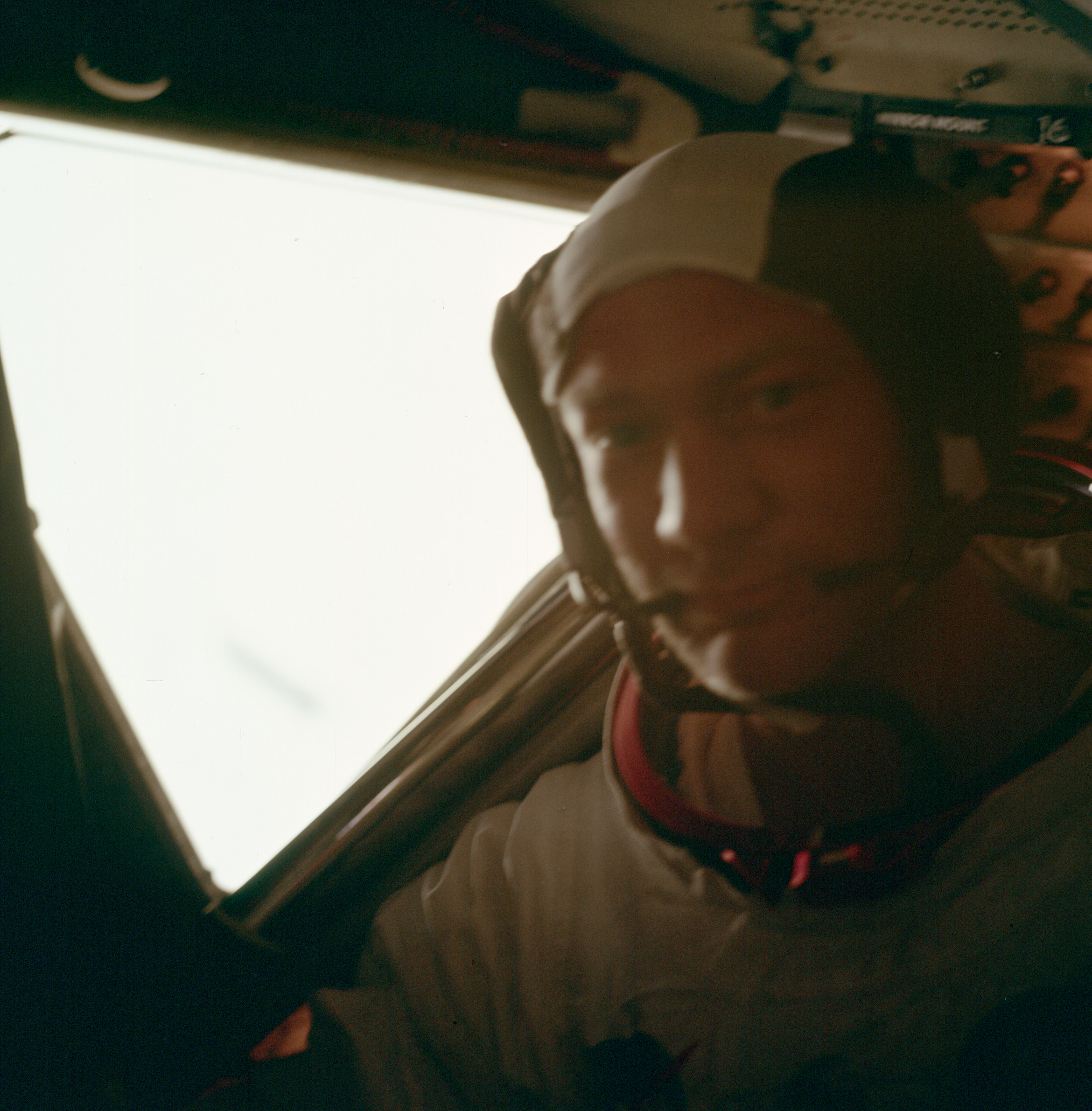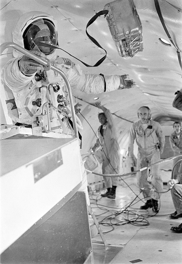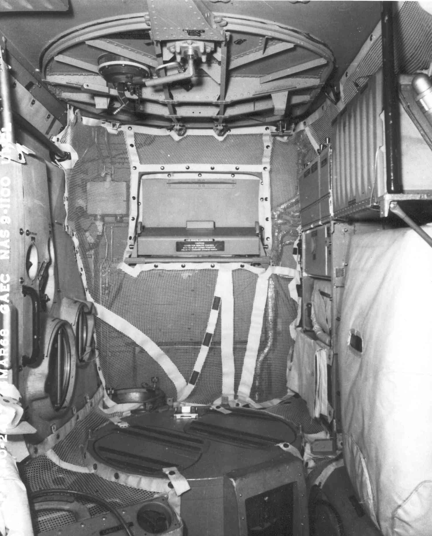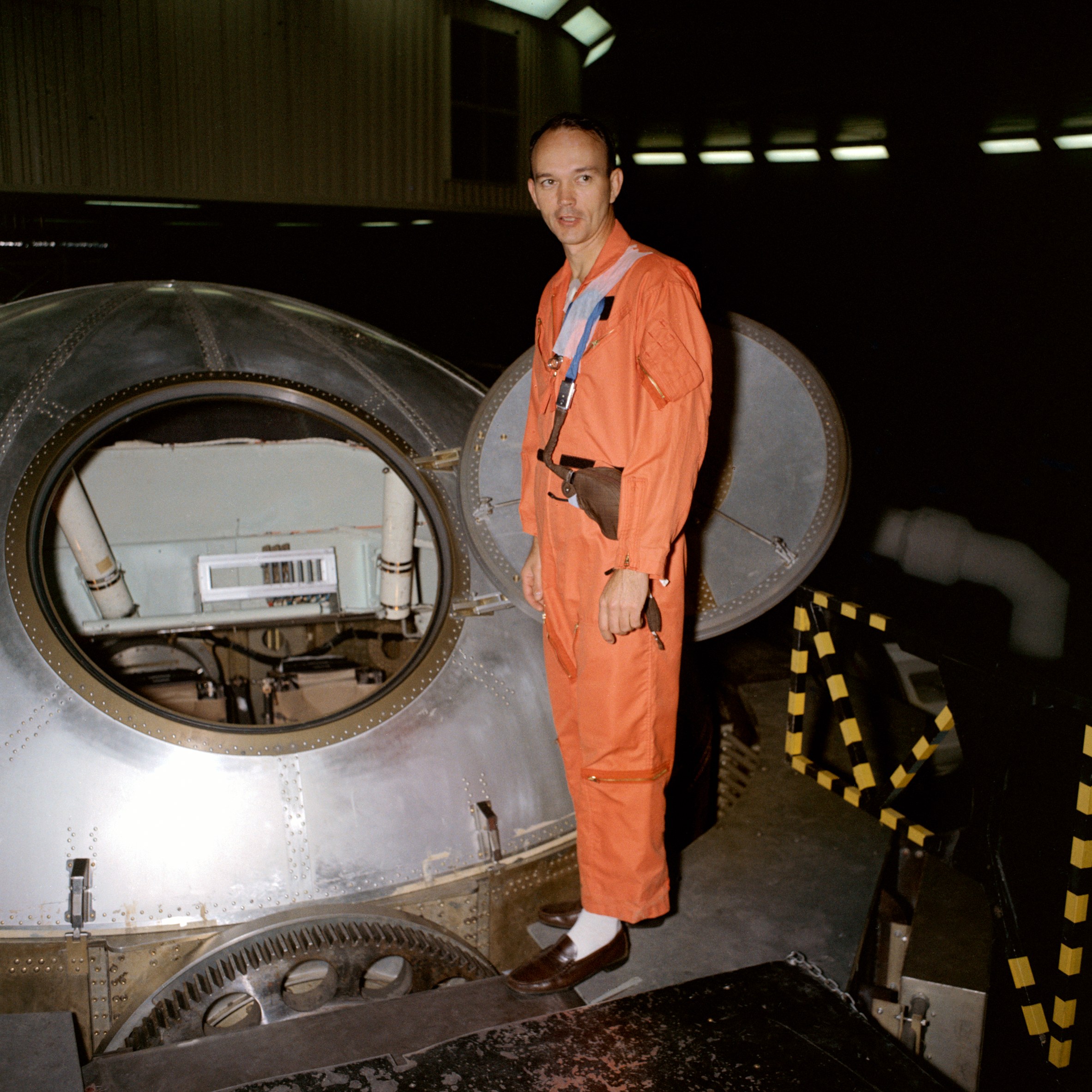 Mike Collins sits in hatch of Apollo 11 Command Module after its return to the Lunar Receiving Laboratory for detailed examination. Scan by J.L Pickering.69-H-1421 ( 136k )