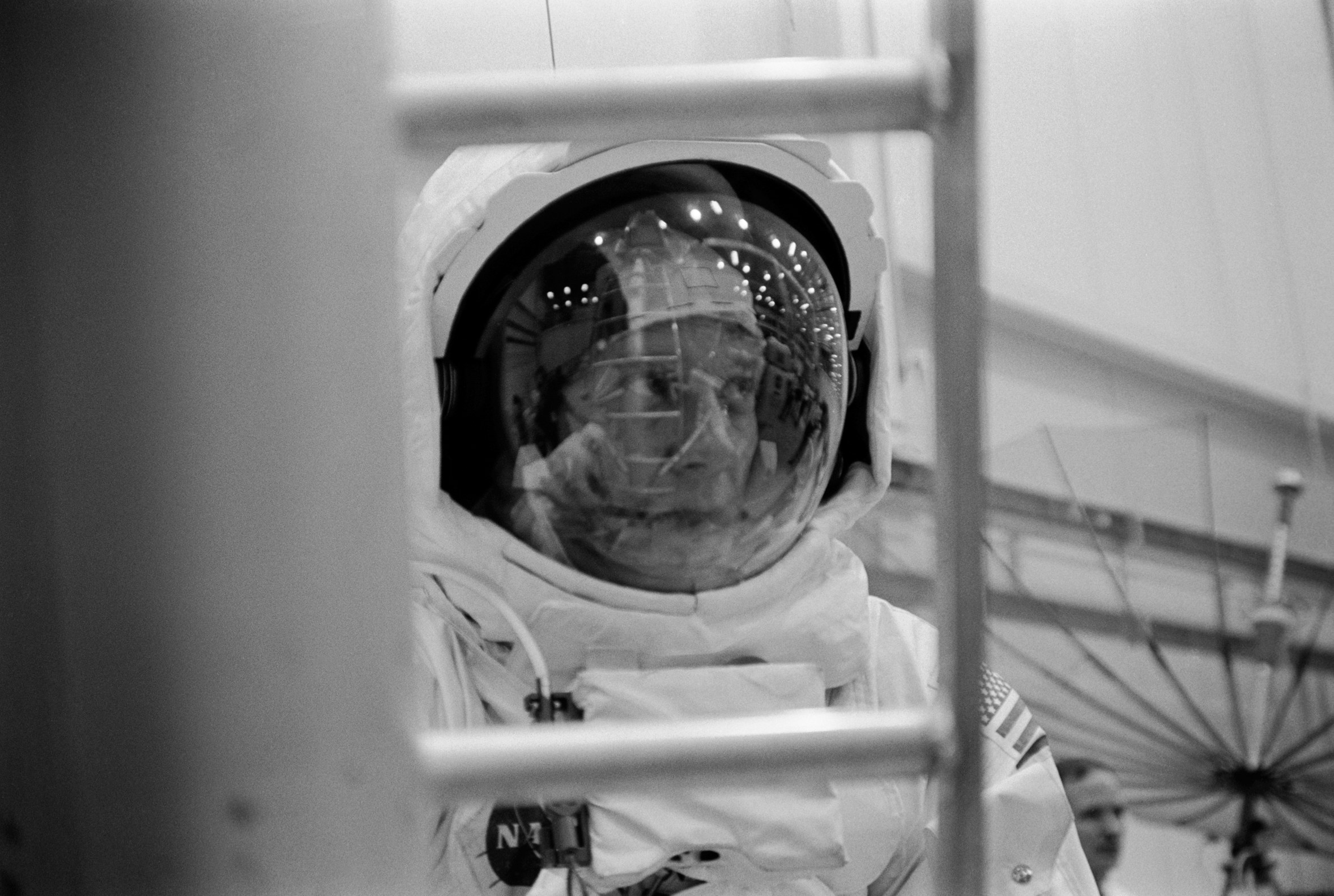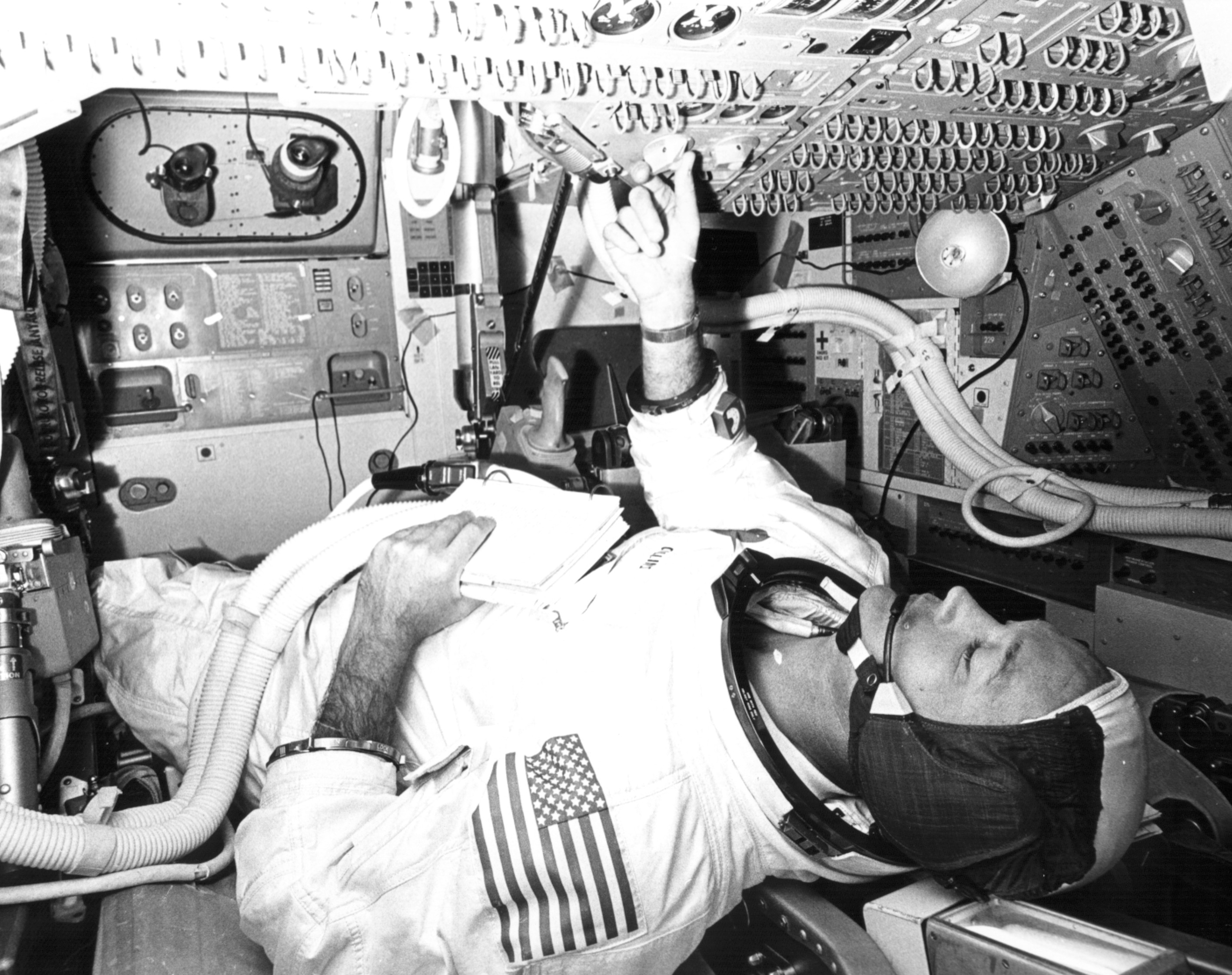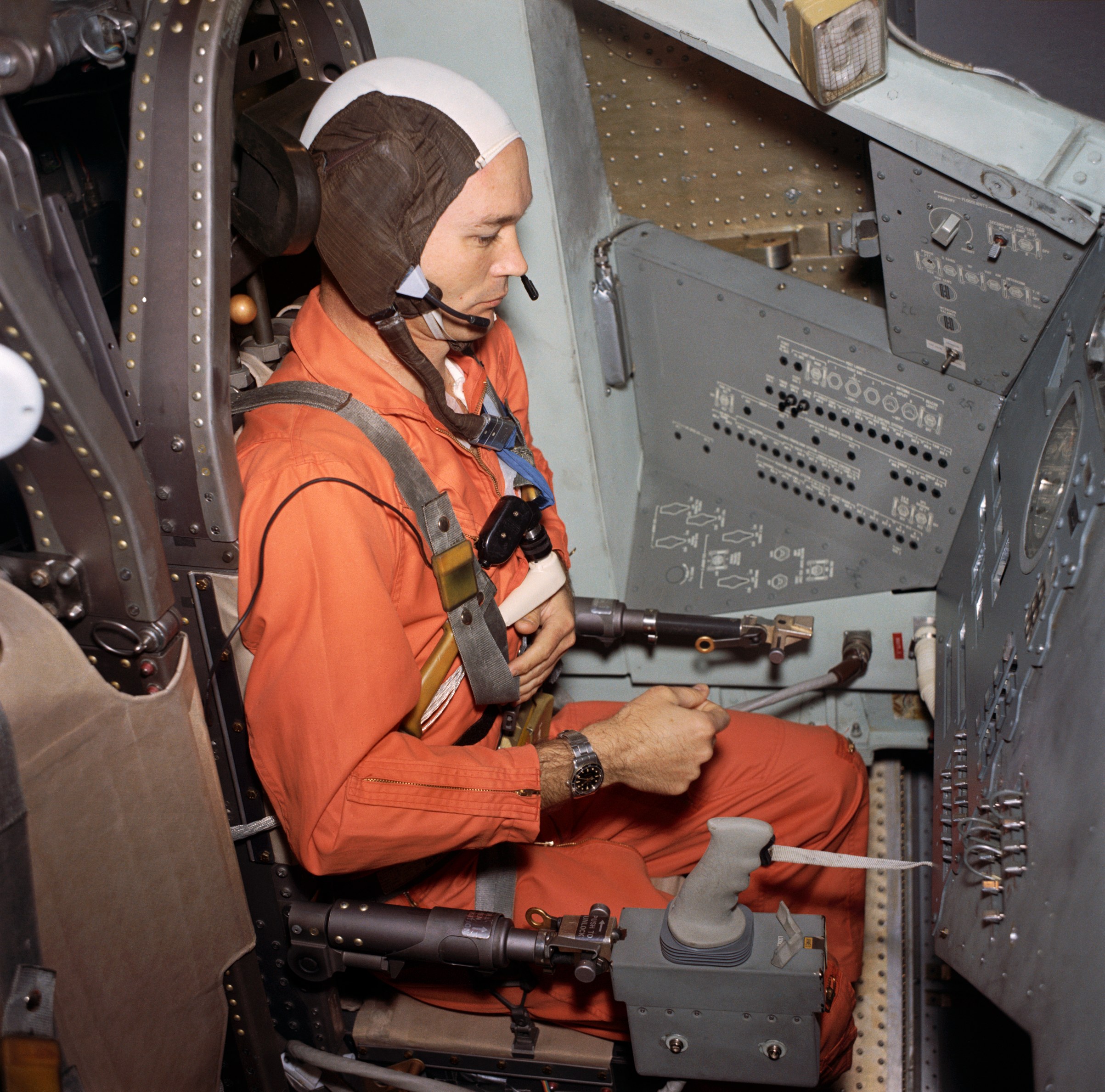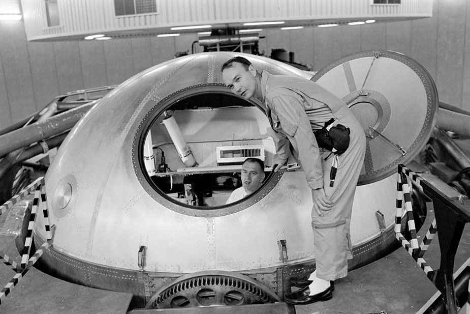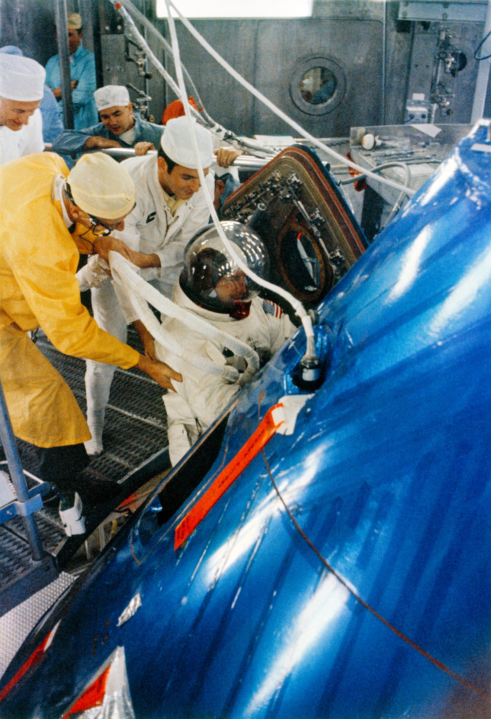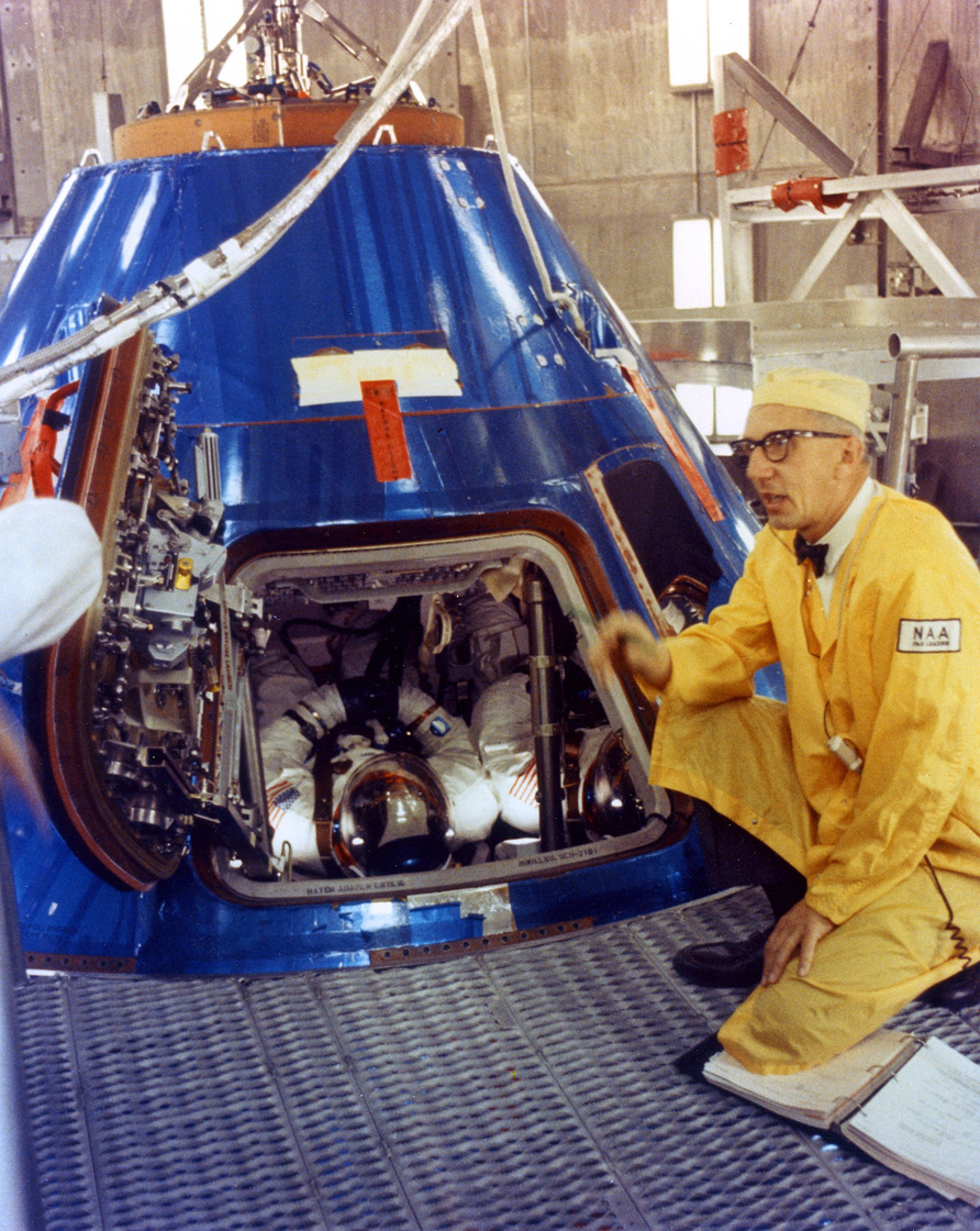 Mike Collins sits in hatch of Apollo 11 Command Module after its return to the Lunar Receiving Laboratory for detailed examination. Scan by J.L Pickering.69-H-1421 ( 136k )