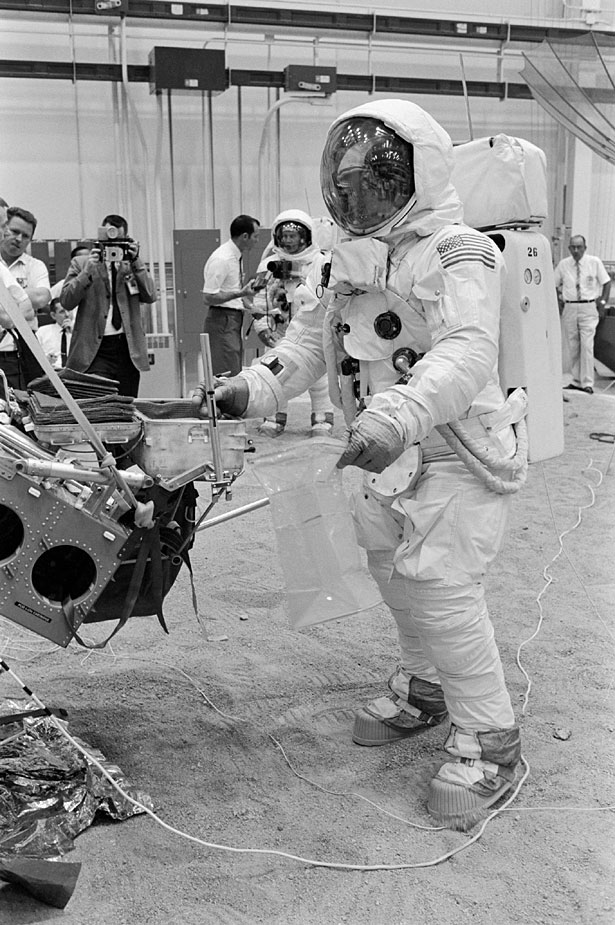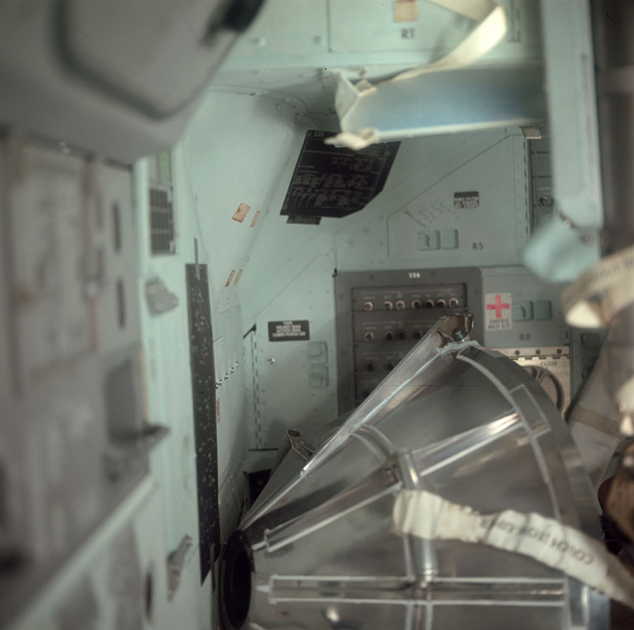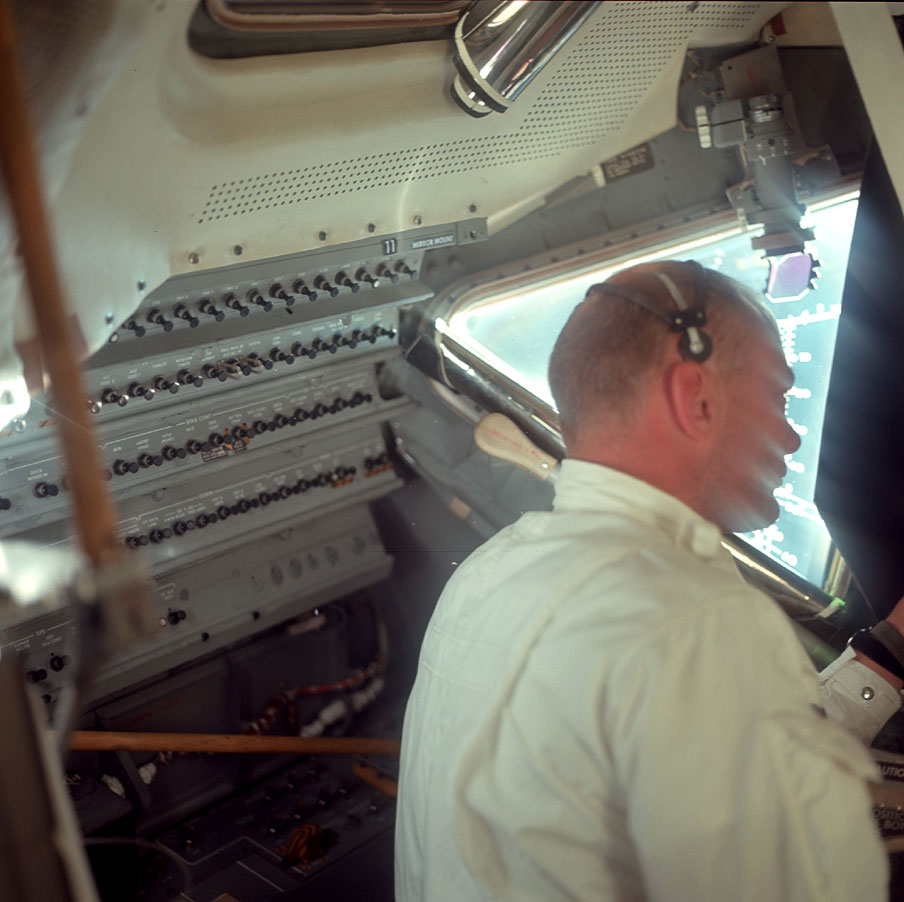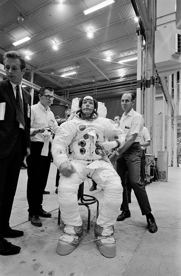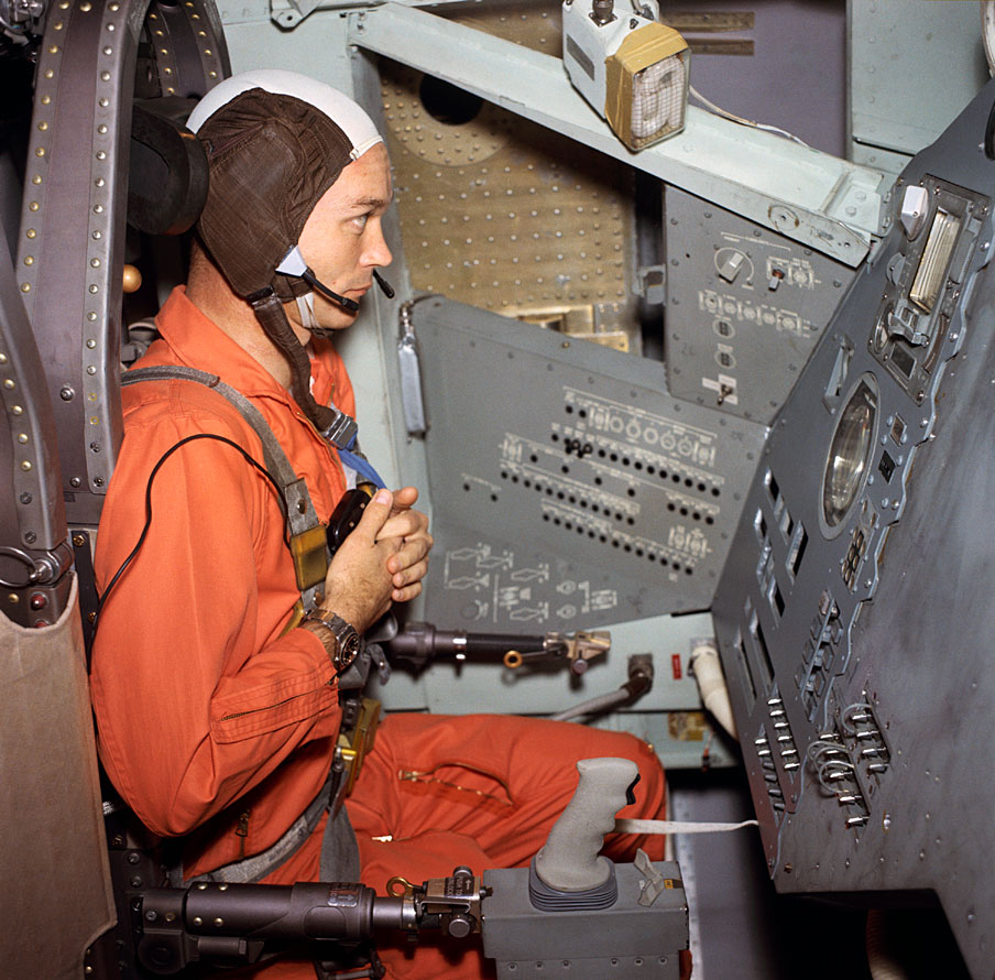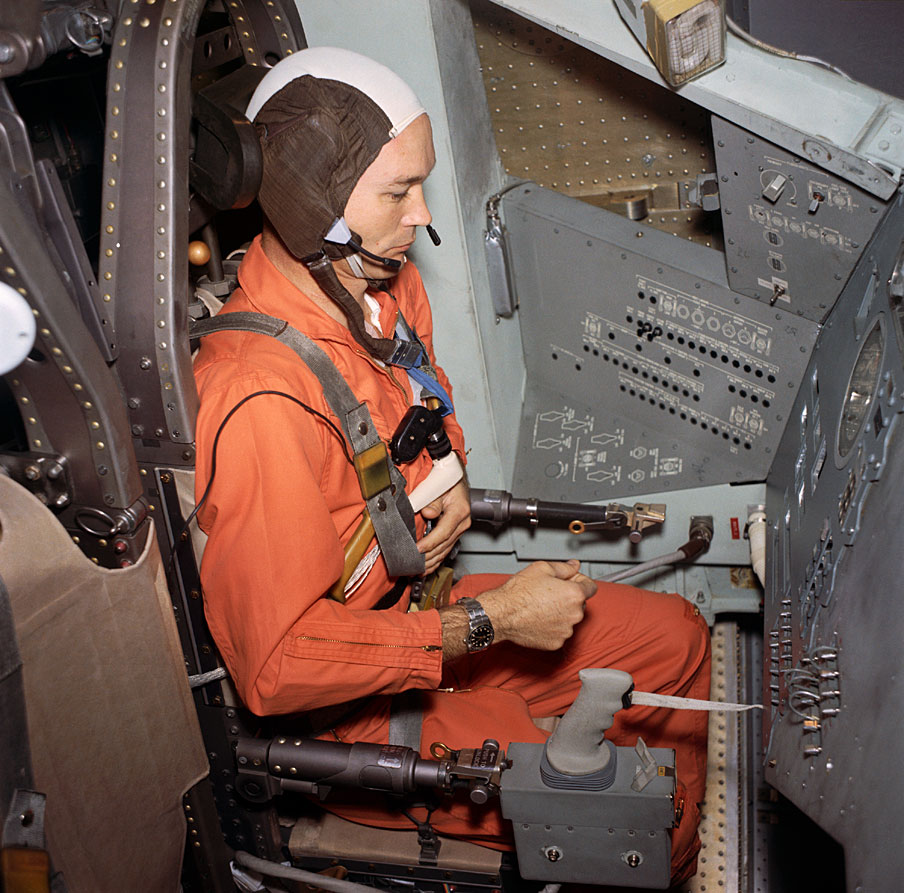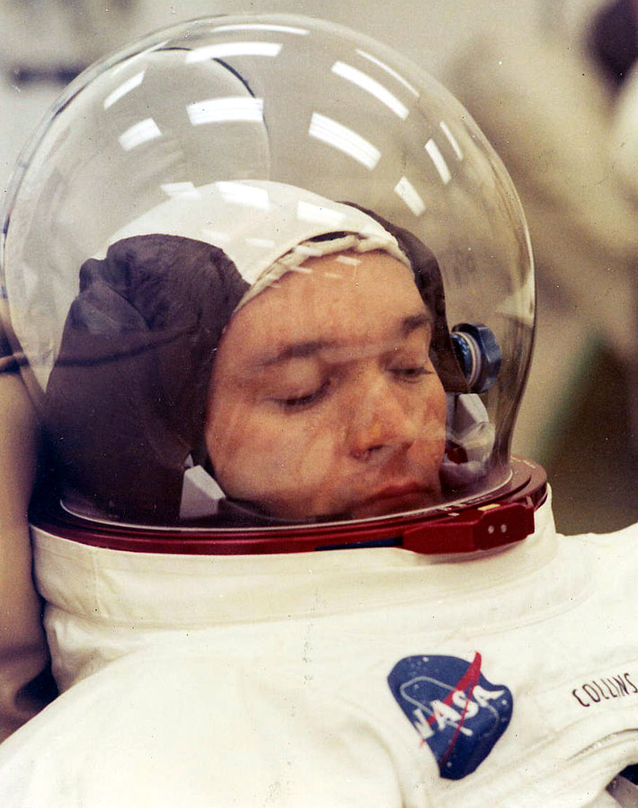 Mike Collins sits in hatch of Apollo 11 Command Module after its return to the Lunar Receiving Laboratory for detailed examination. Scan by J.L Pickering.69-H-1421 ( 136k )