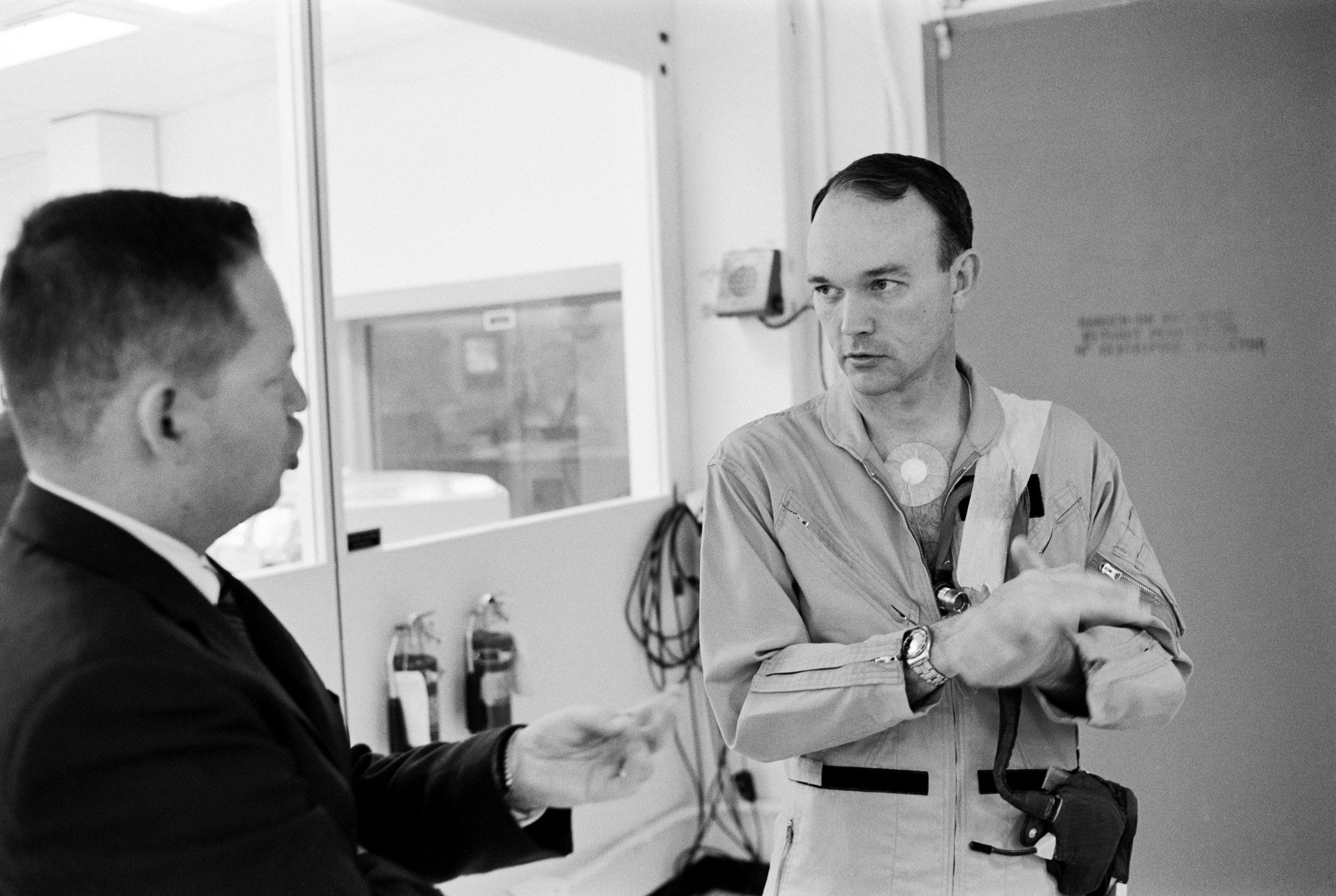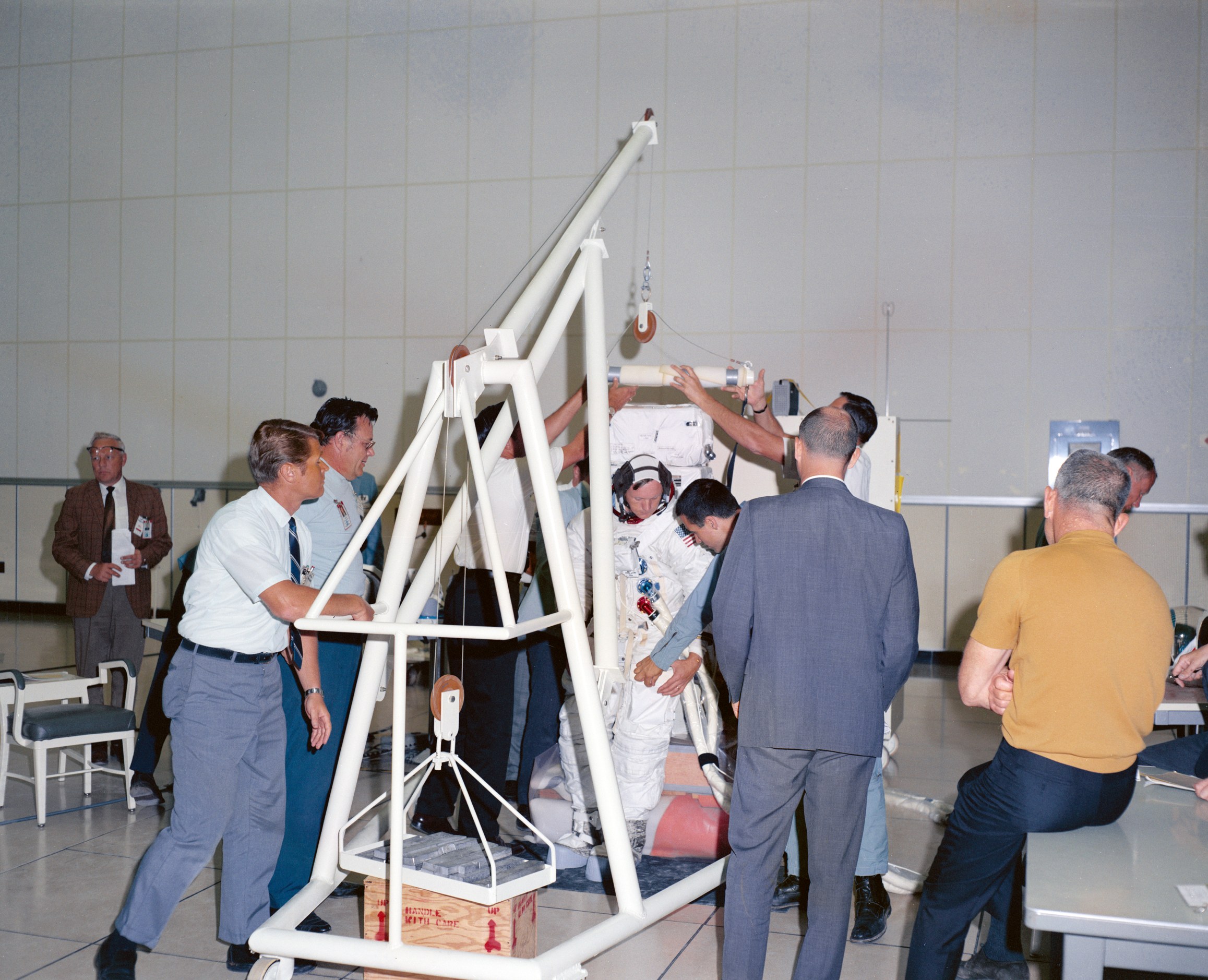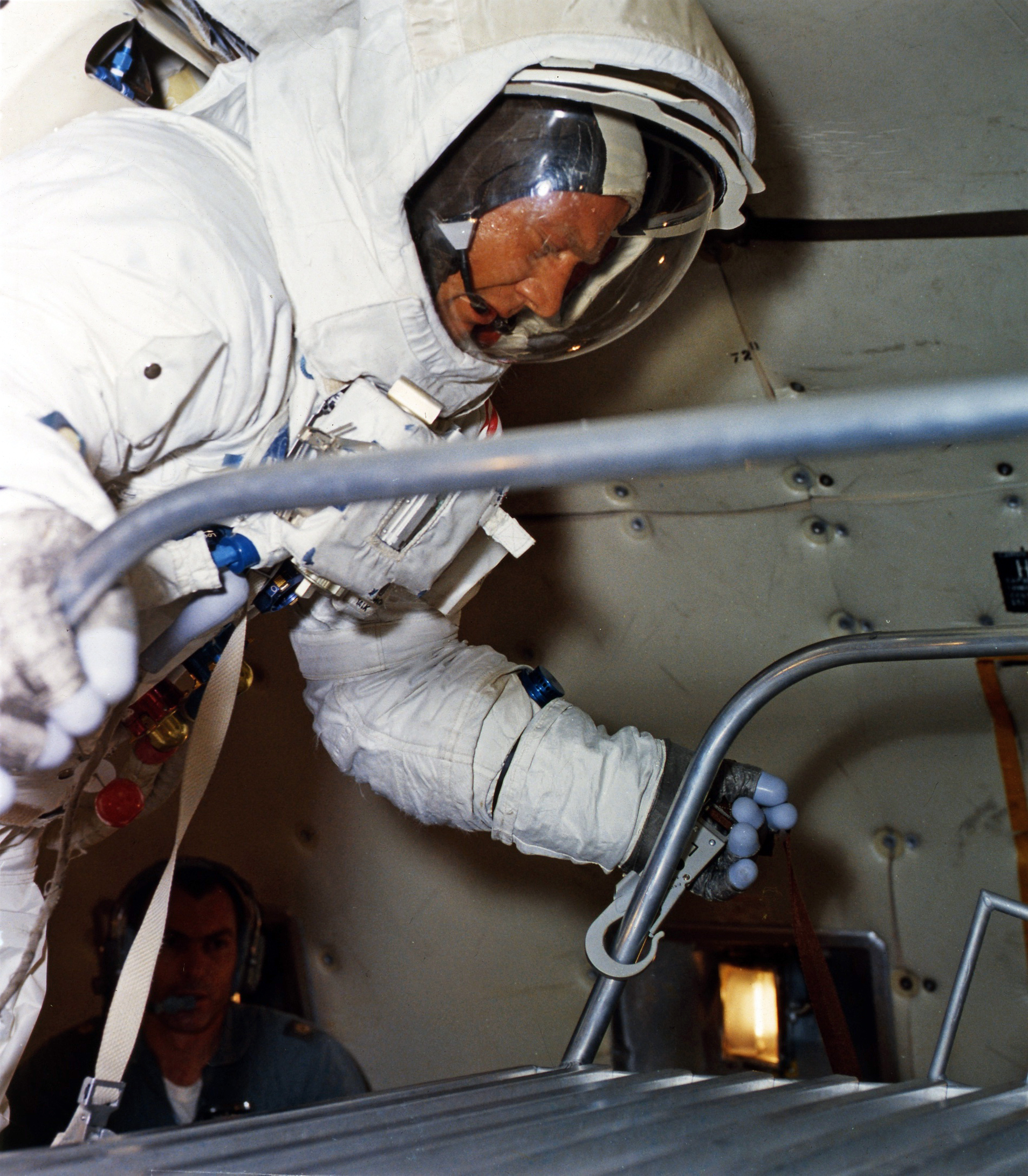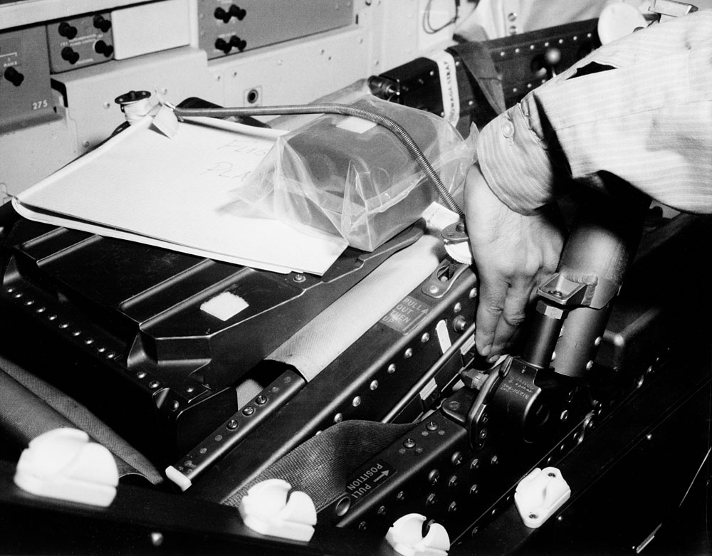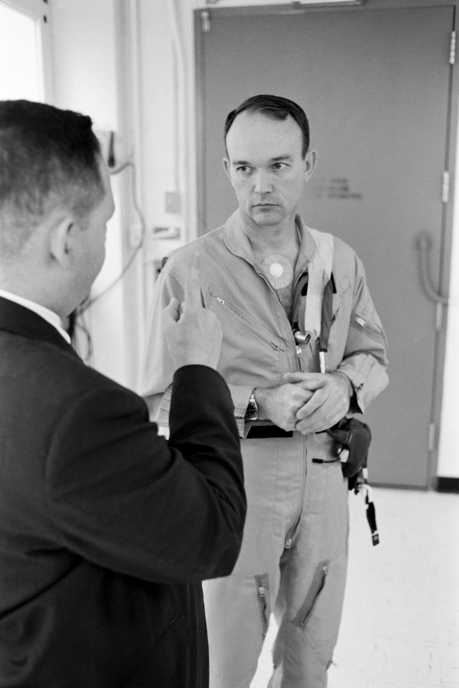 Mike Collins sits in hatch of Apollo 11 Command Module after its return to the Lunar Receiving Laboratory for detailed examination. Scan by J.L Pickering.69-H-1421 ( 136k )
