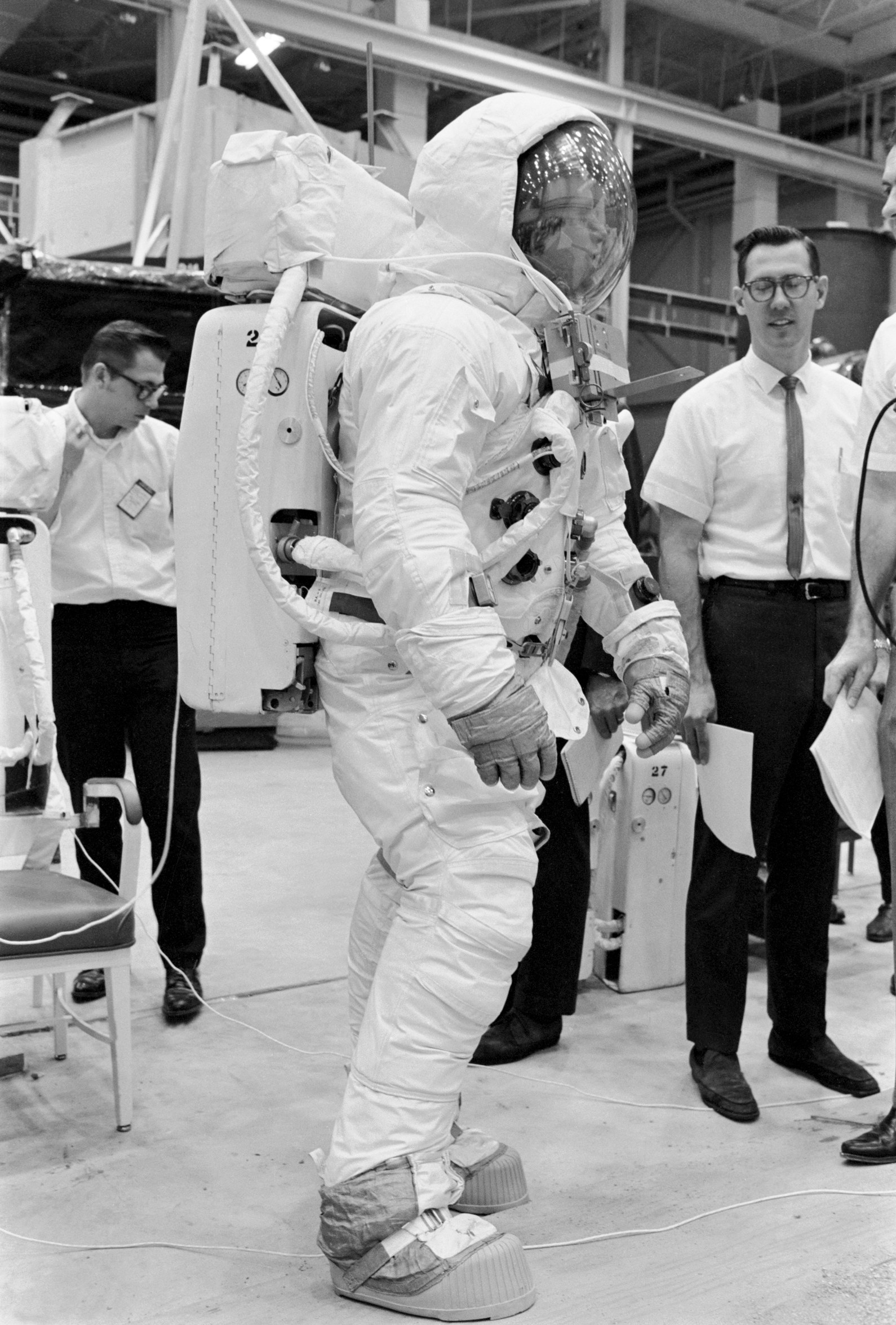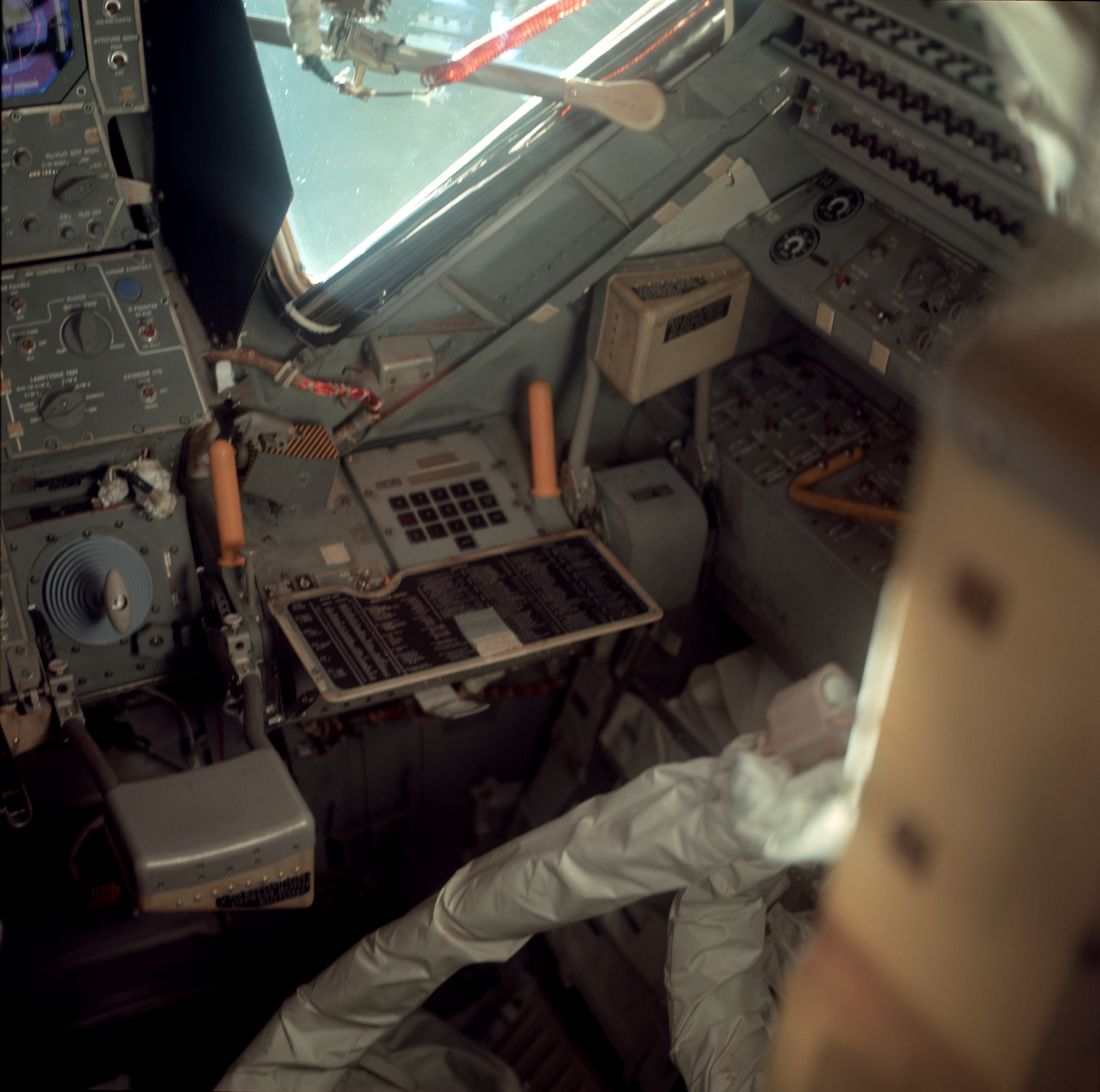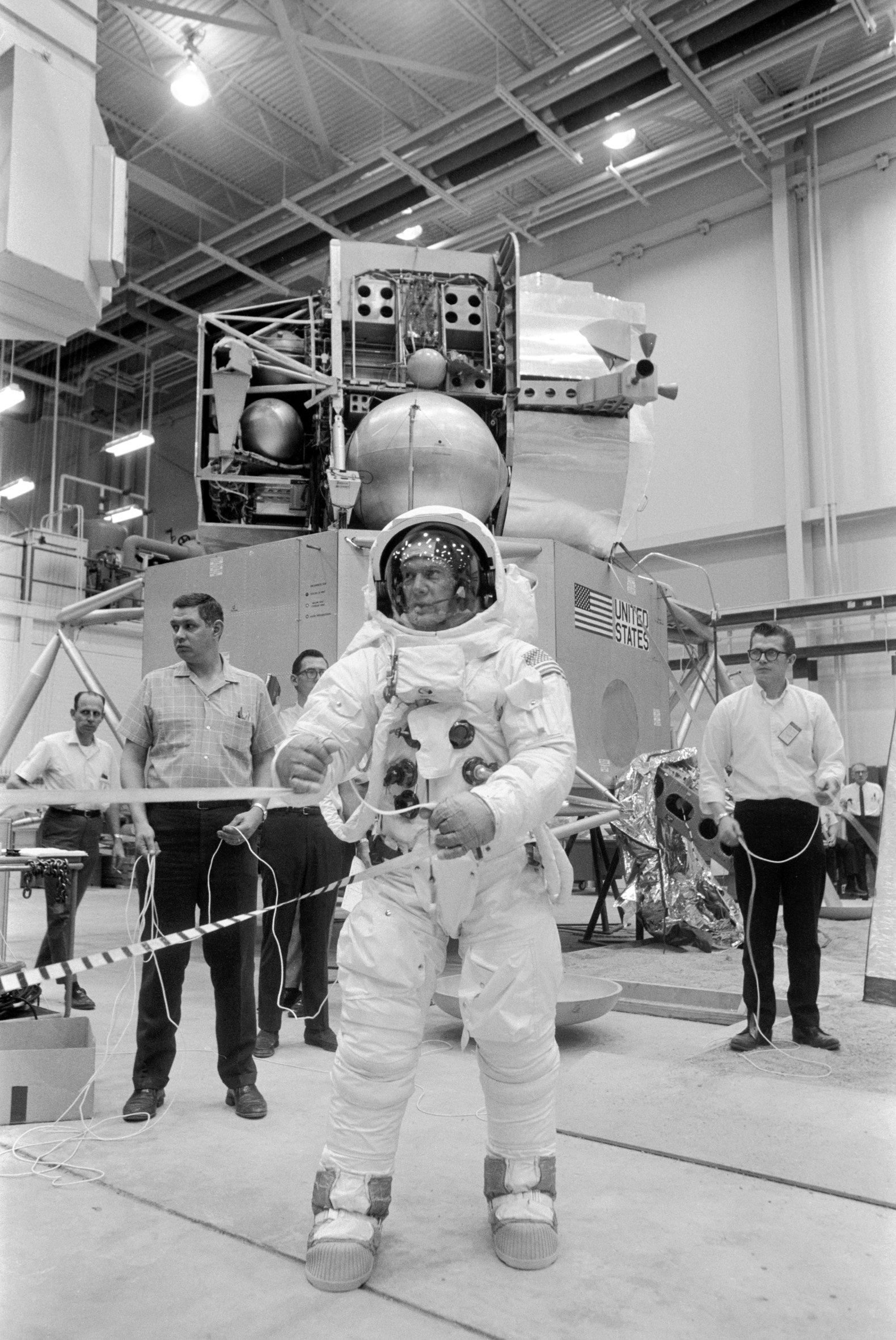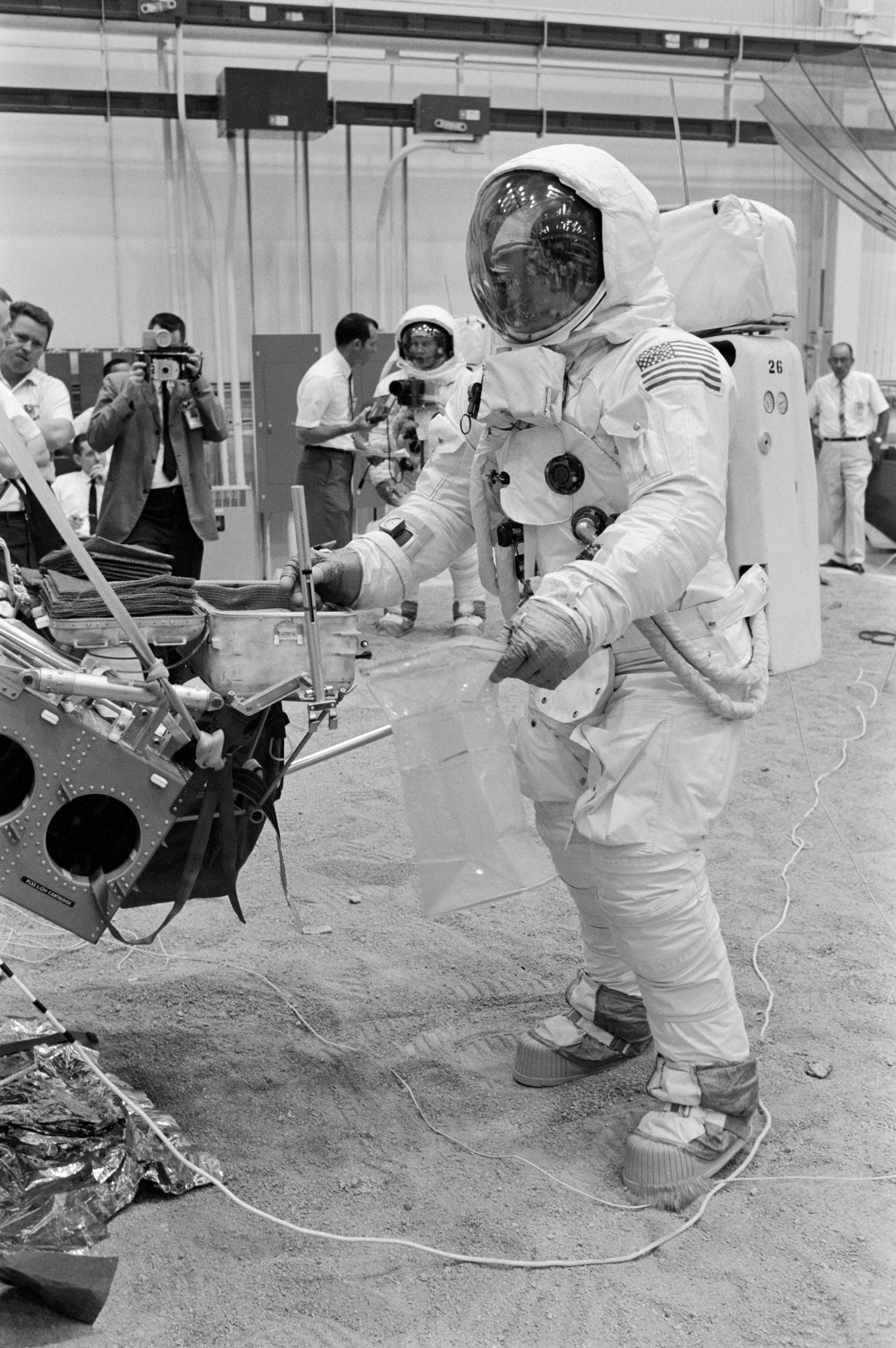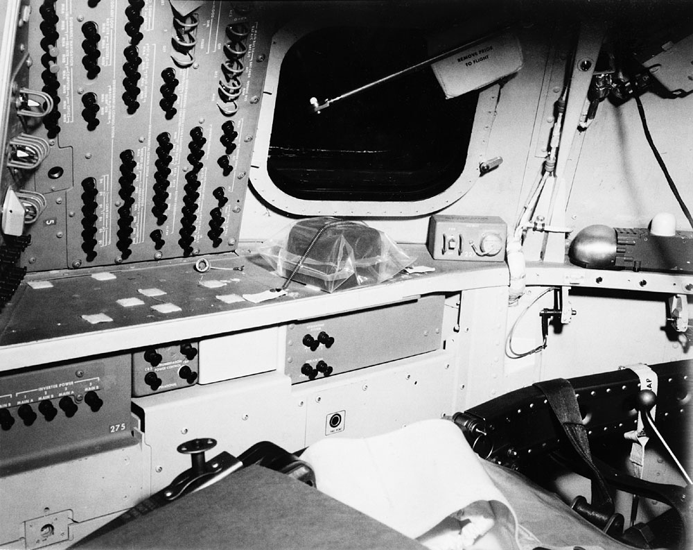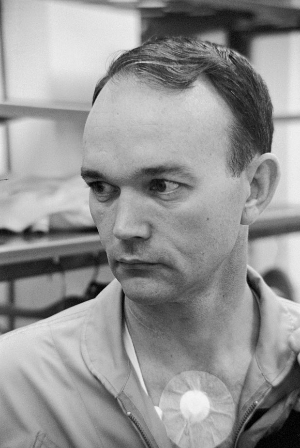 Mike Collins sits in hatch of Apollo 11 Command Module after its return to the Lunar Receiving Laboratory for detailed examination. Scan by J.L Pickering.69-H-1421 ( 136k )