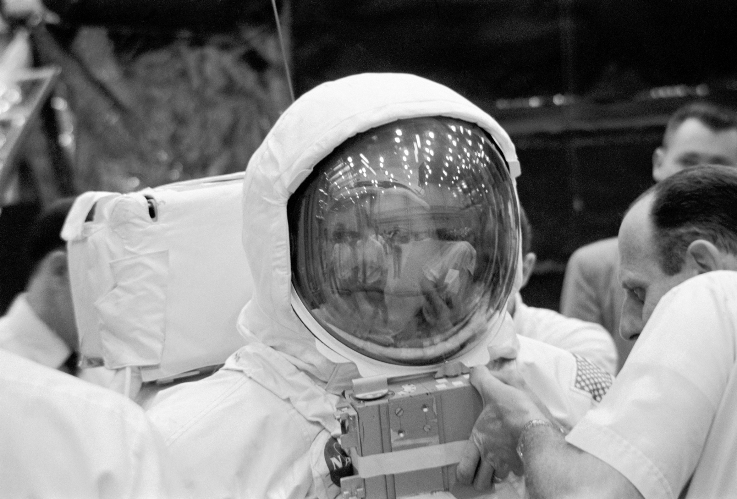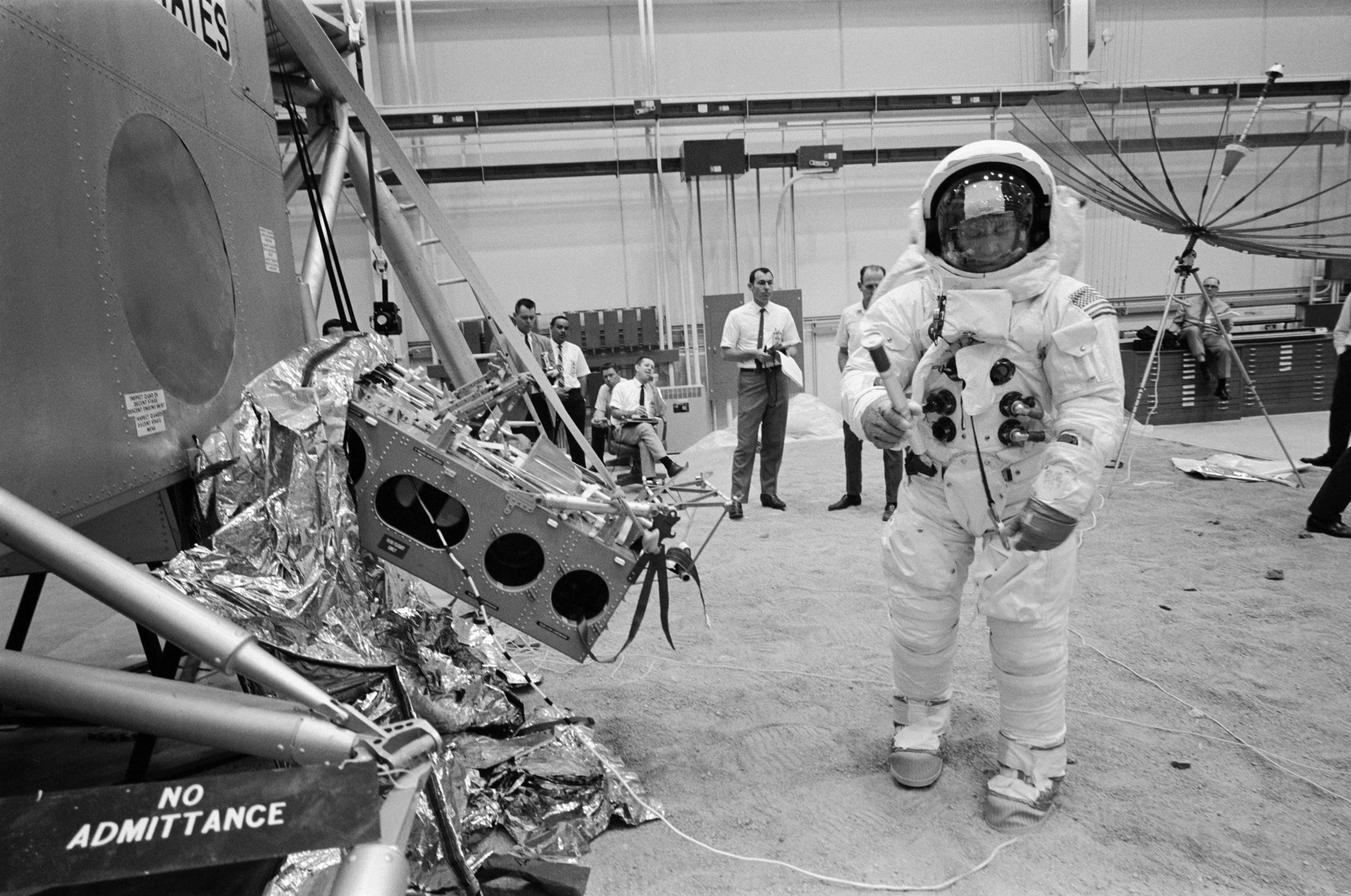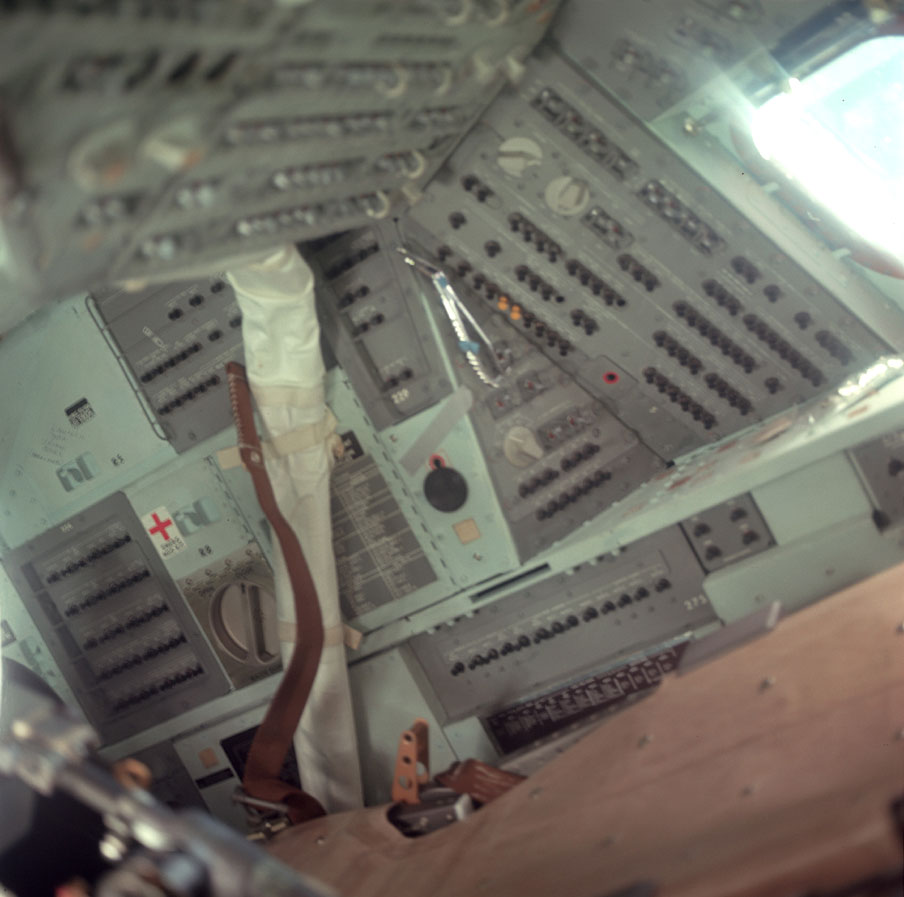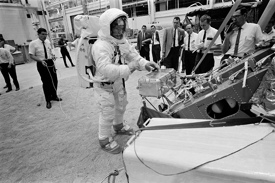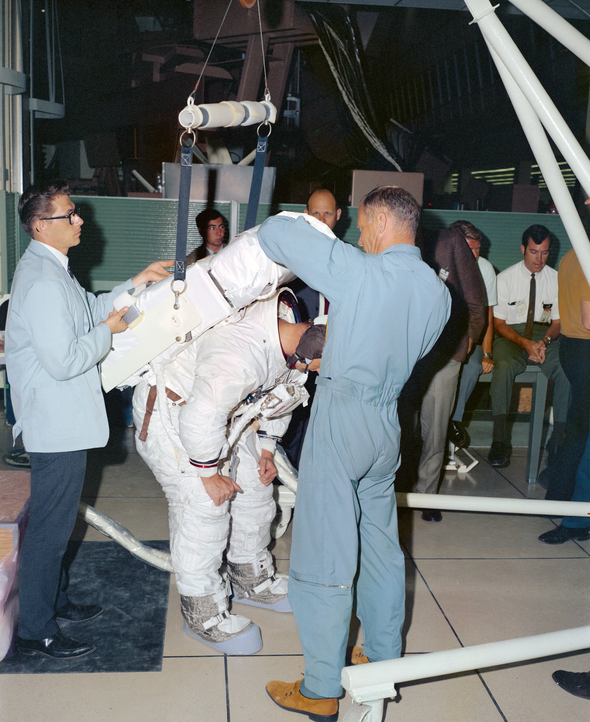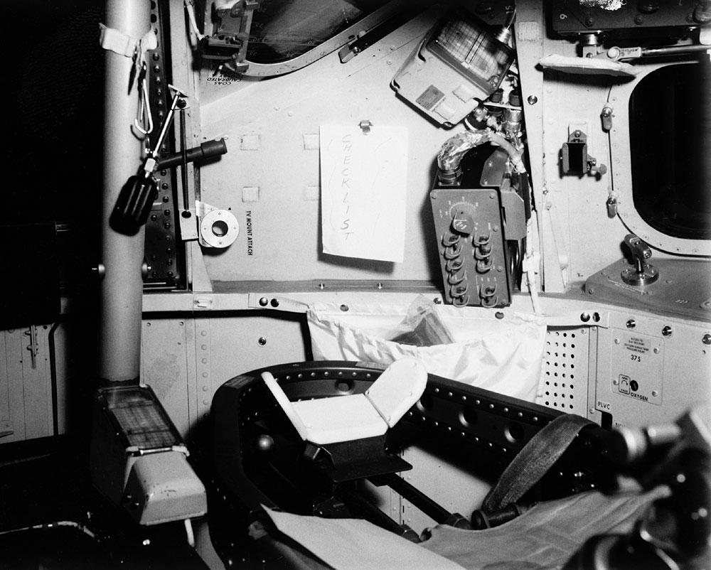 Mike Collins sits in hatch of Apollo 11 Command Module after its return to the Lunar Receiving Laboratory for detailed examination. Scan by J.L Pickering.69-H-1421 ( 136k )