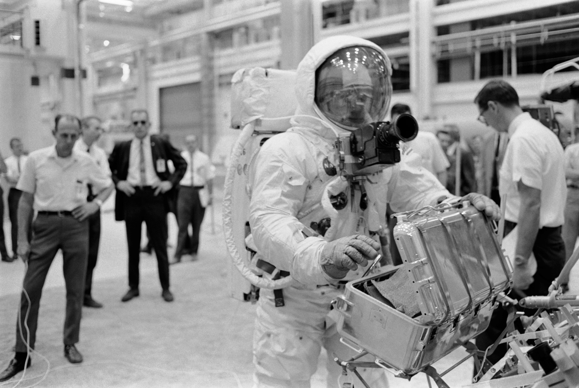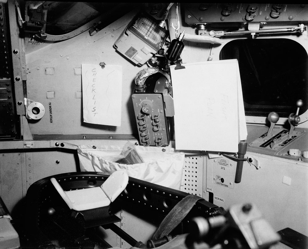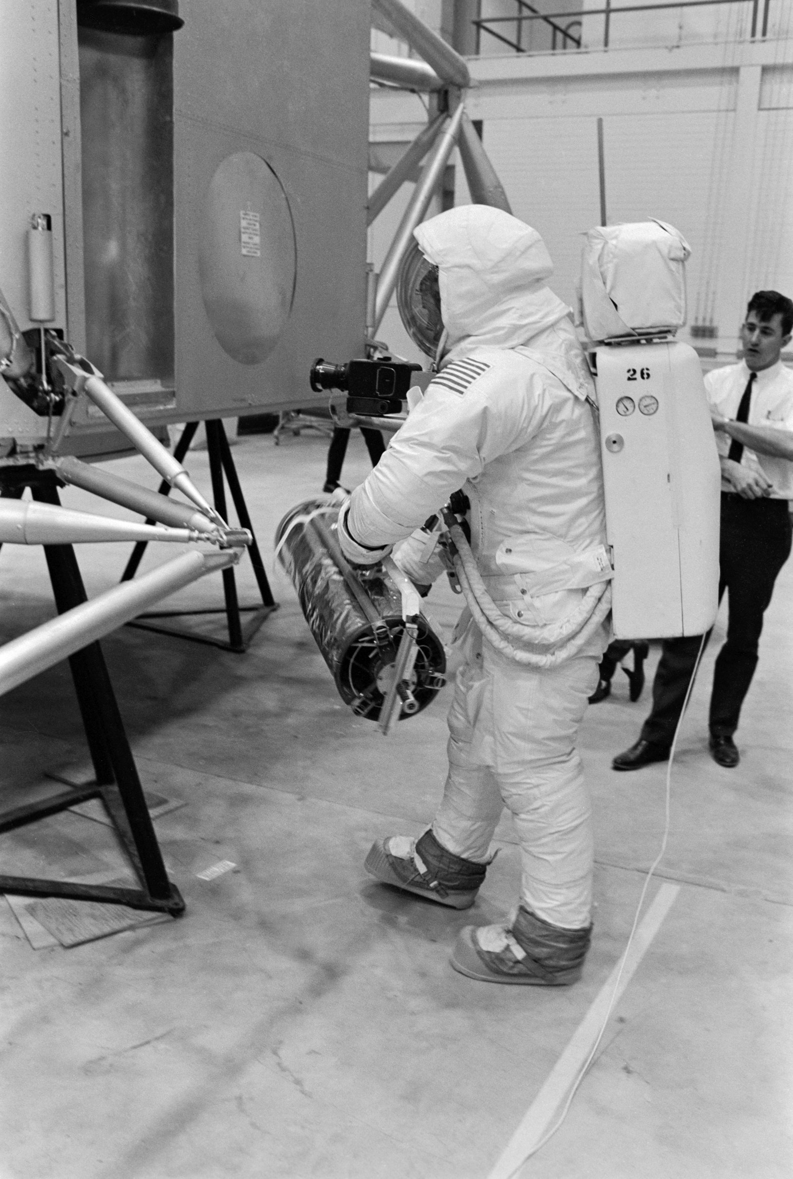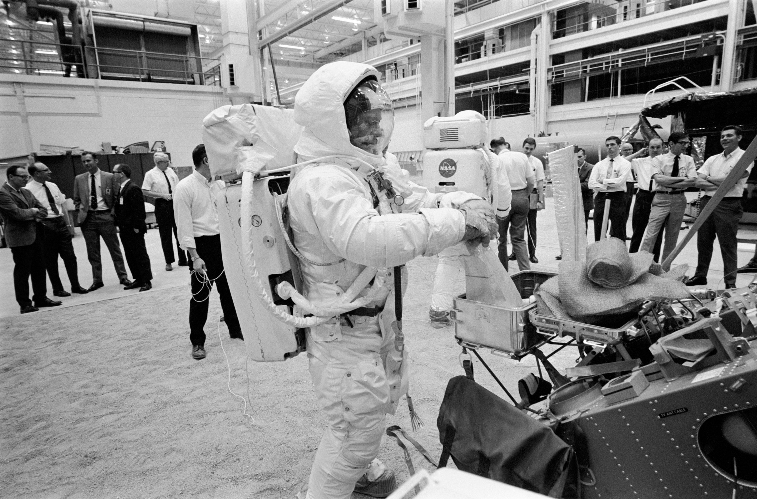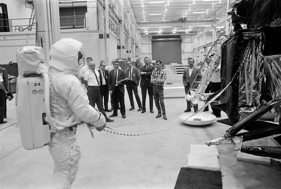 Mike Collins sits in hatch of Apollo 11 Command Module after its return to the Lunar Receiving Laboratory for detailed examination. Scan by J.L Pickering.69-H-1421 ( 136k )