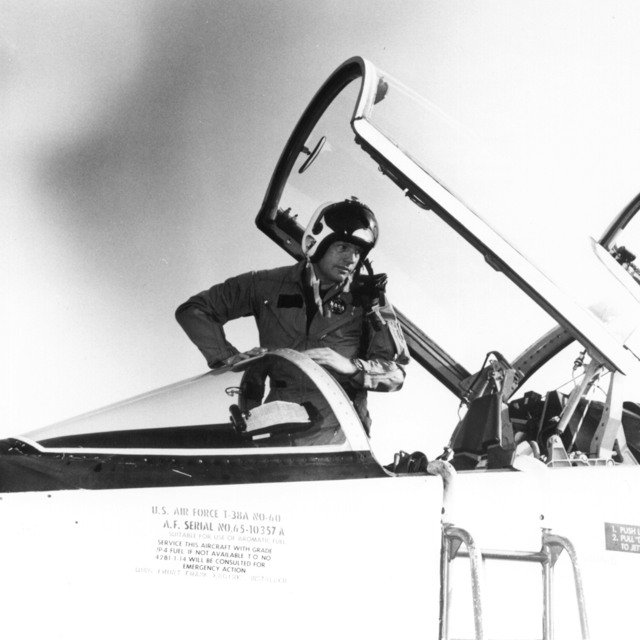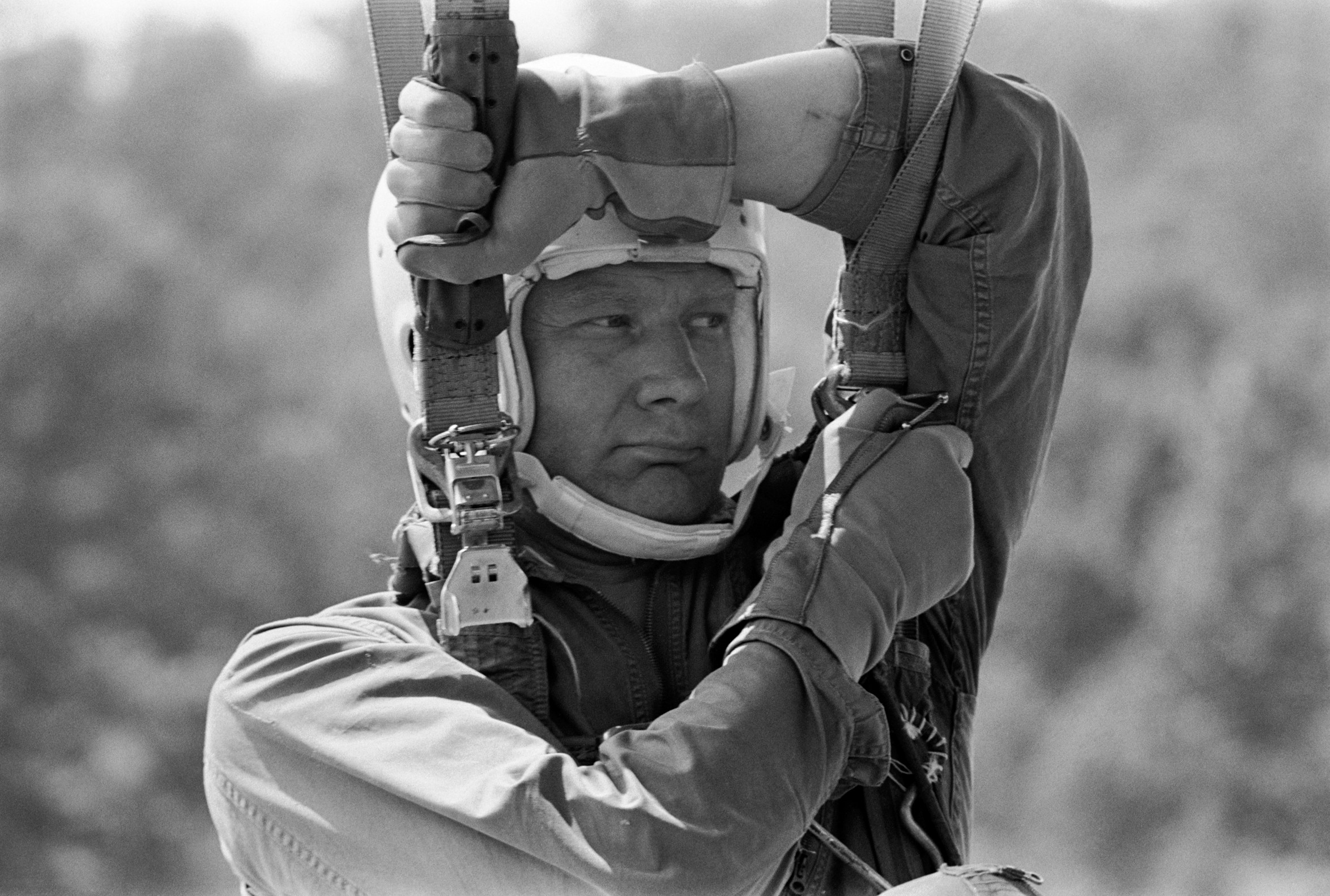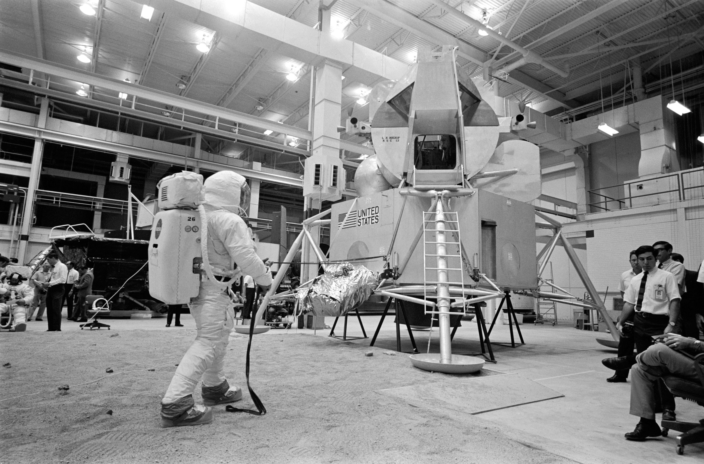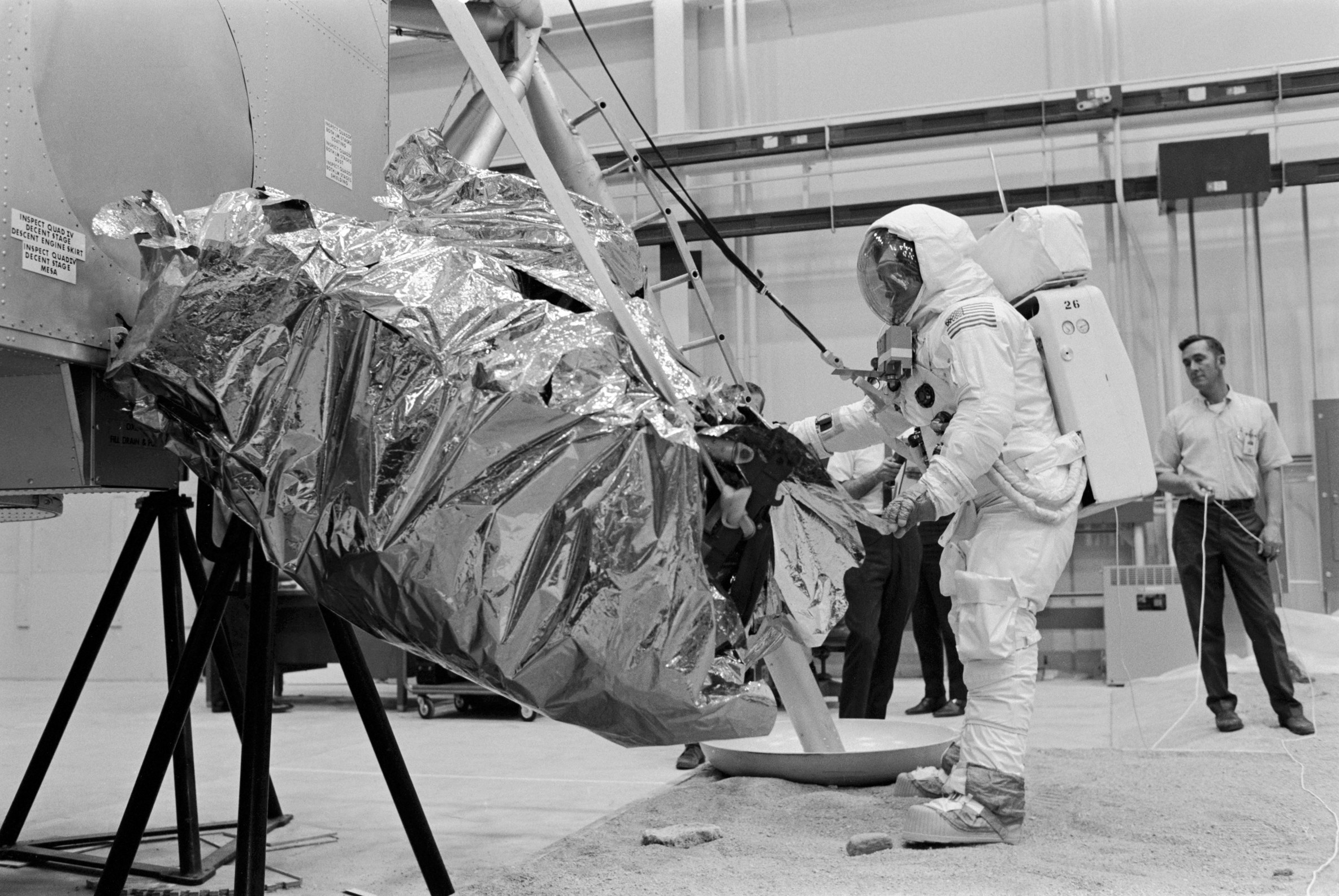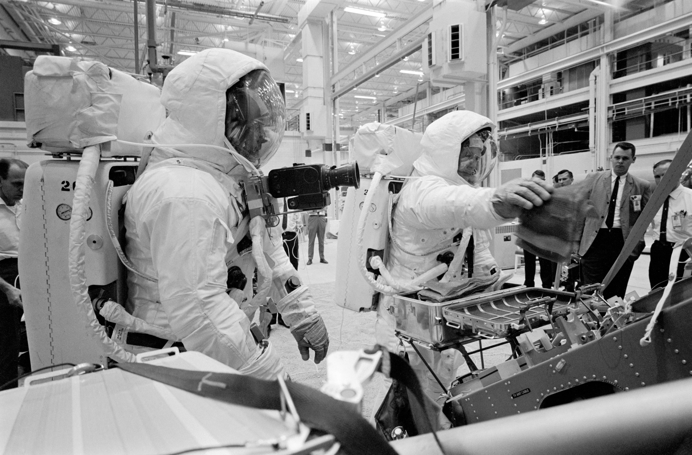 Mike Collins sits in hatch of Apollo 11 Command Module after its return to the Lunar Receiving Laboratory for detailed examination. Scan by J.L Pickering.69-H-1421 ( 136k )