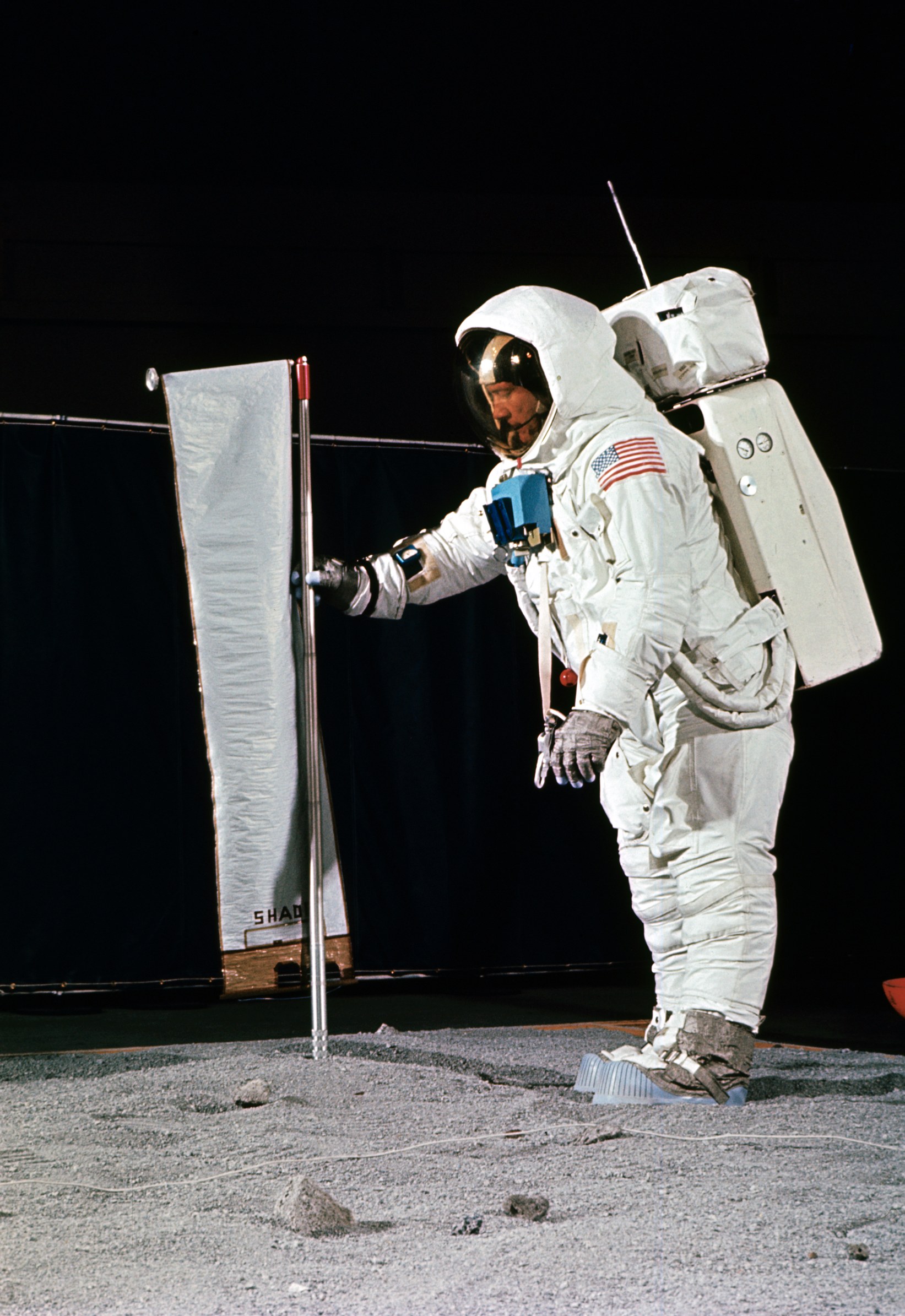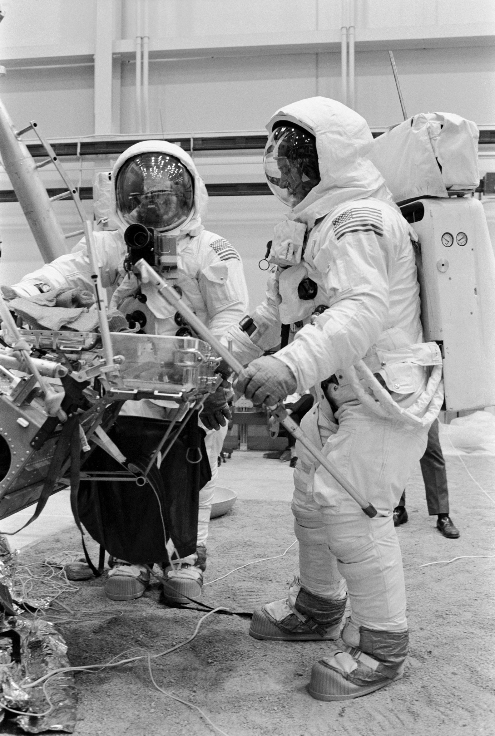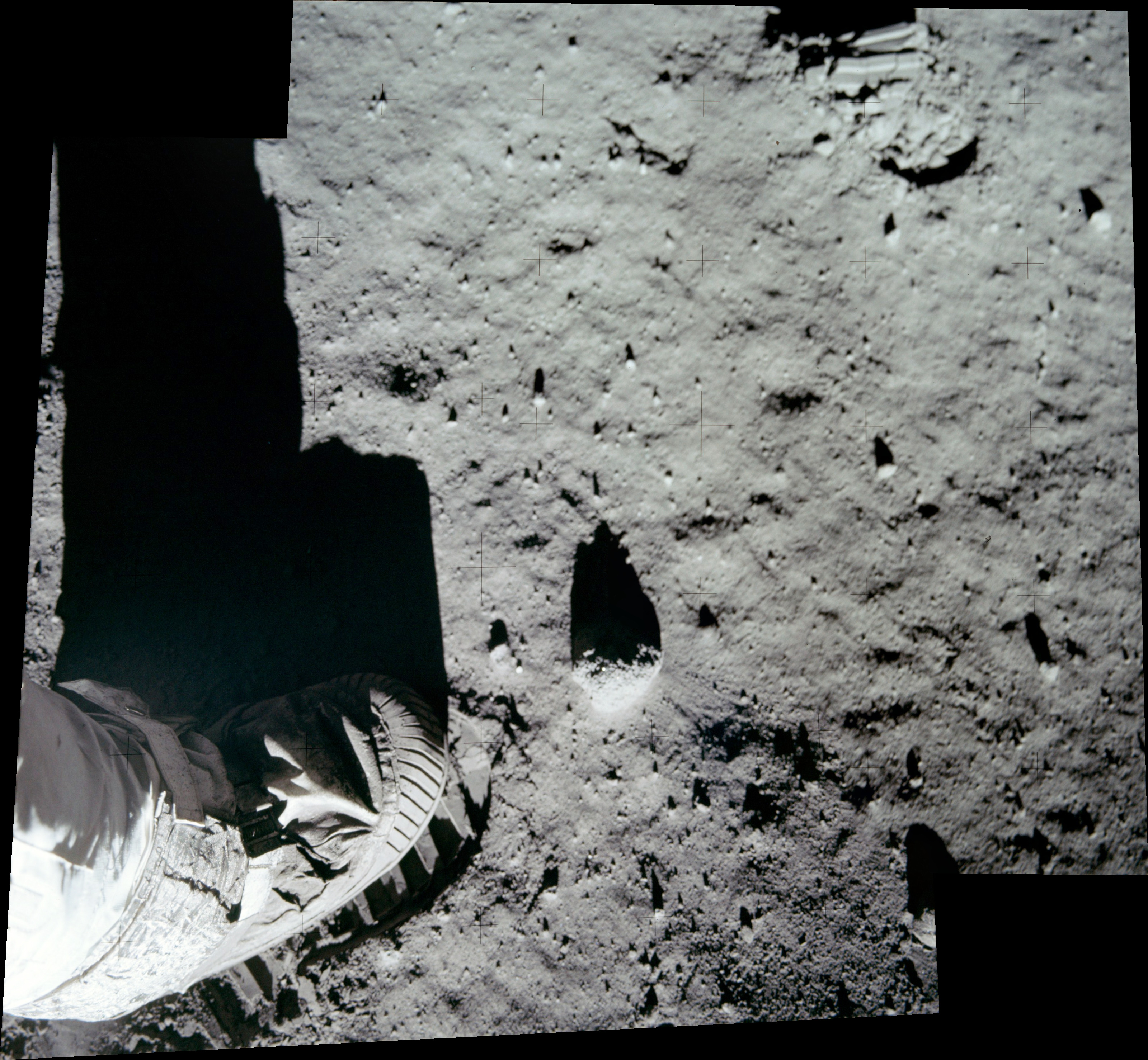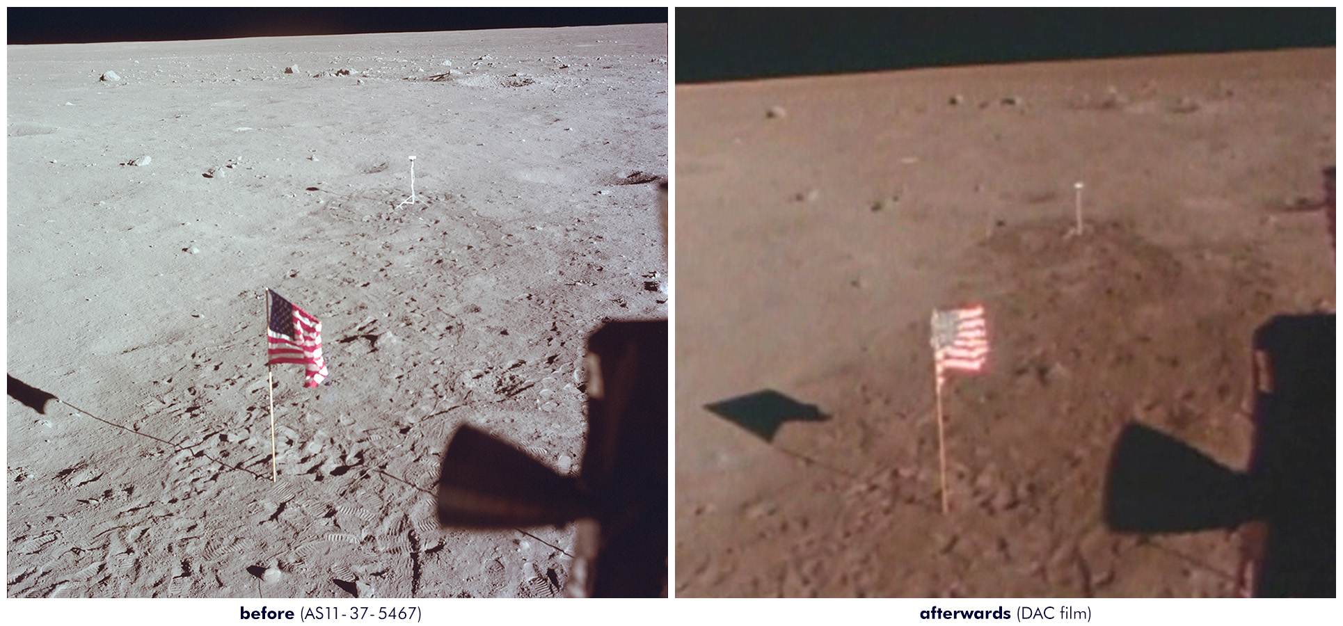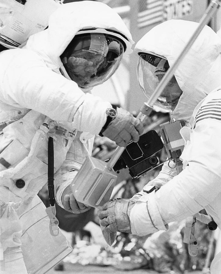 Many of the scans of photos taken during the missions were done from the original film. These scans are being done by NASA Johnson, with some post-processing by Kipp Teague. The film is scanned at 4096 x 4096 pixels per image. (See a discussion from Arizona State University about the scanning process.) Kipp reduced each digital image to approximately 2350 x 2350 pixels (equivalent to 300 dpi) and did minor adjustments of levels to ensure that (1) brightly lit areas of lunar soil were neutral grey, (2) objects with known colors (such as the CDR stripes or the LCRU blankets) looked right, and (3) information in bright or dark areas was not lost. These images from original film are indicated by the notation 'OF300' in the image description. In each case, a 900 x 900 pixel version is also provided.