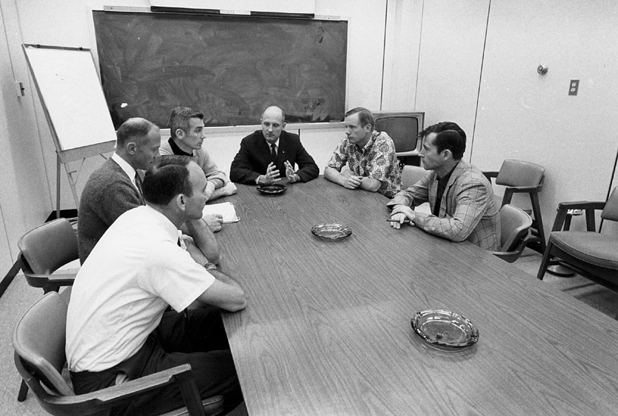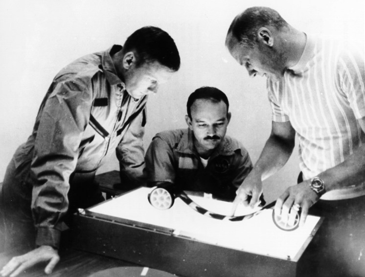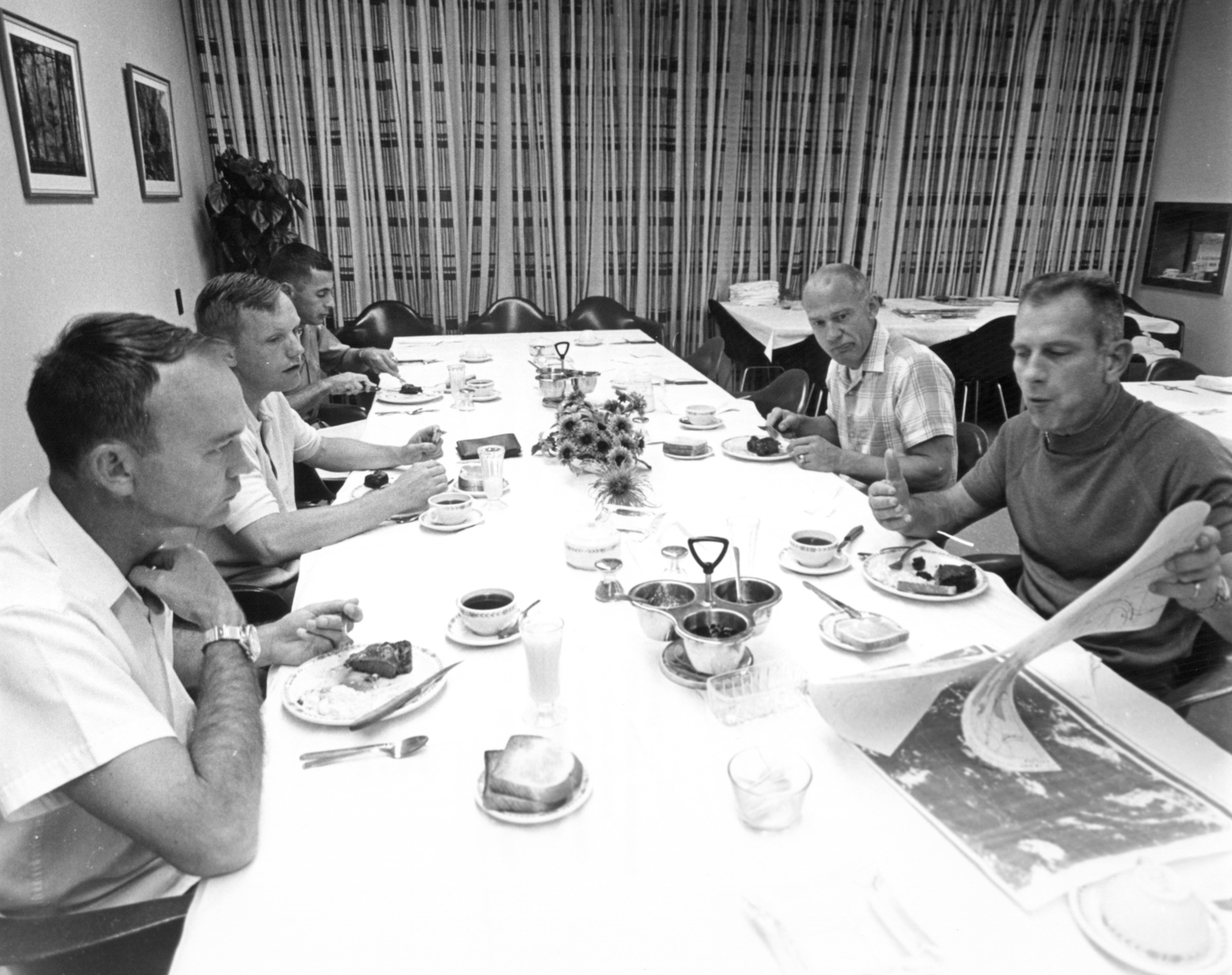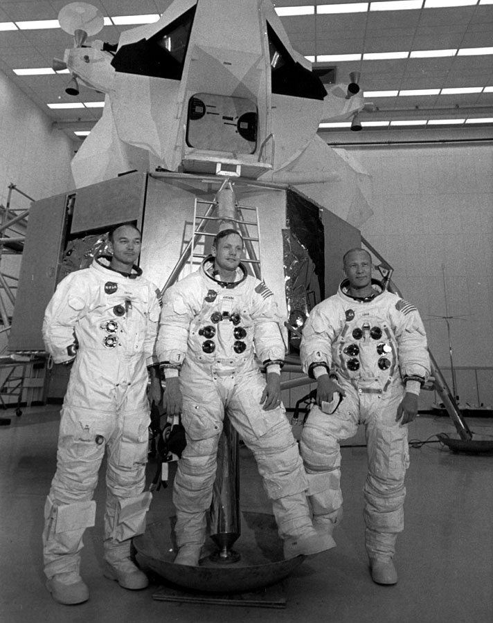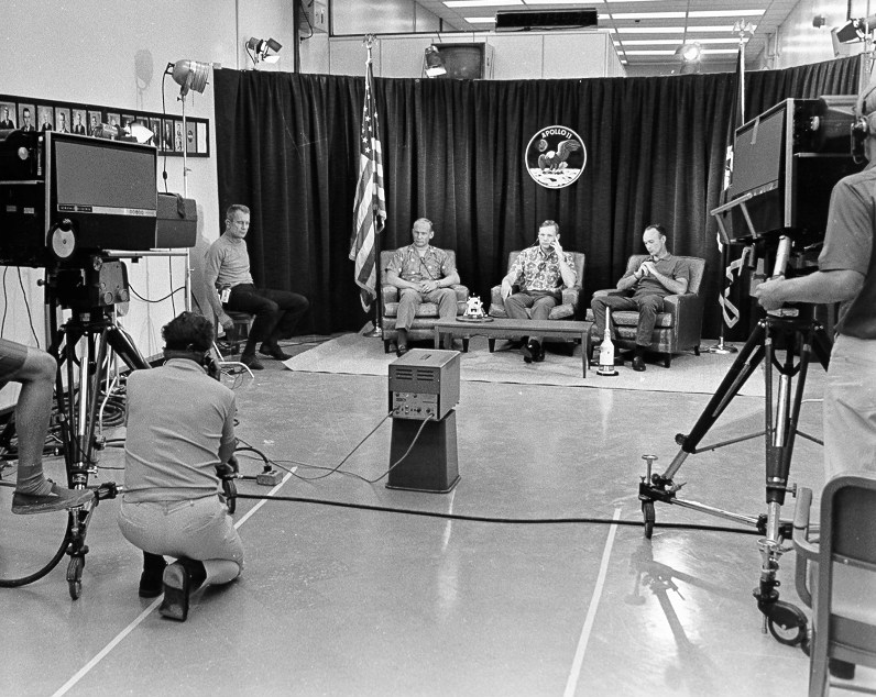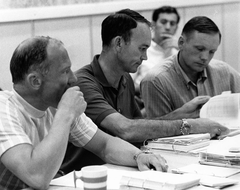 Armstrong, Collins, Aldrin (left to right) examining mission photos, apparently out-the-window photos of the LM shadow area. Photo filed 3 August 1969. Scan by Kipp Teague.S69-47292 ( 60k or 6.1Mb )