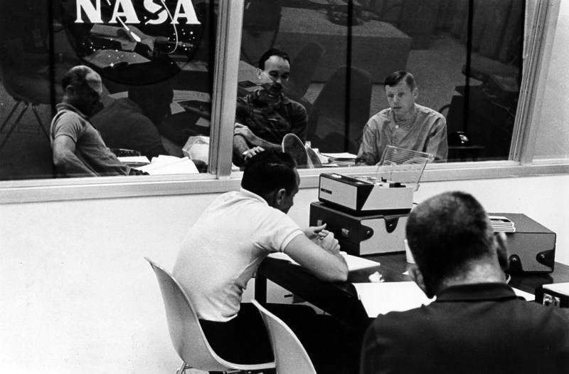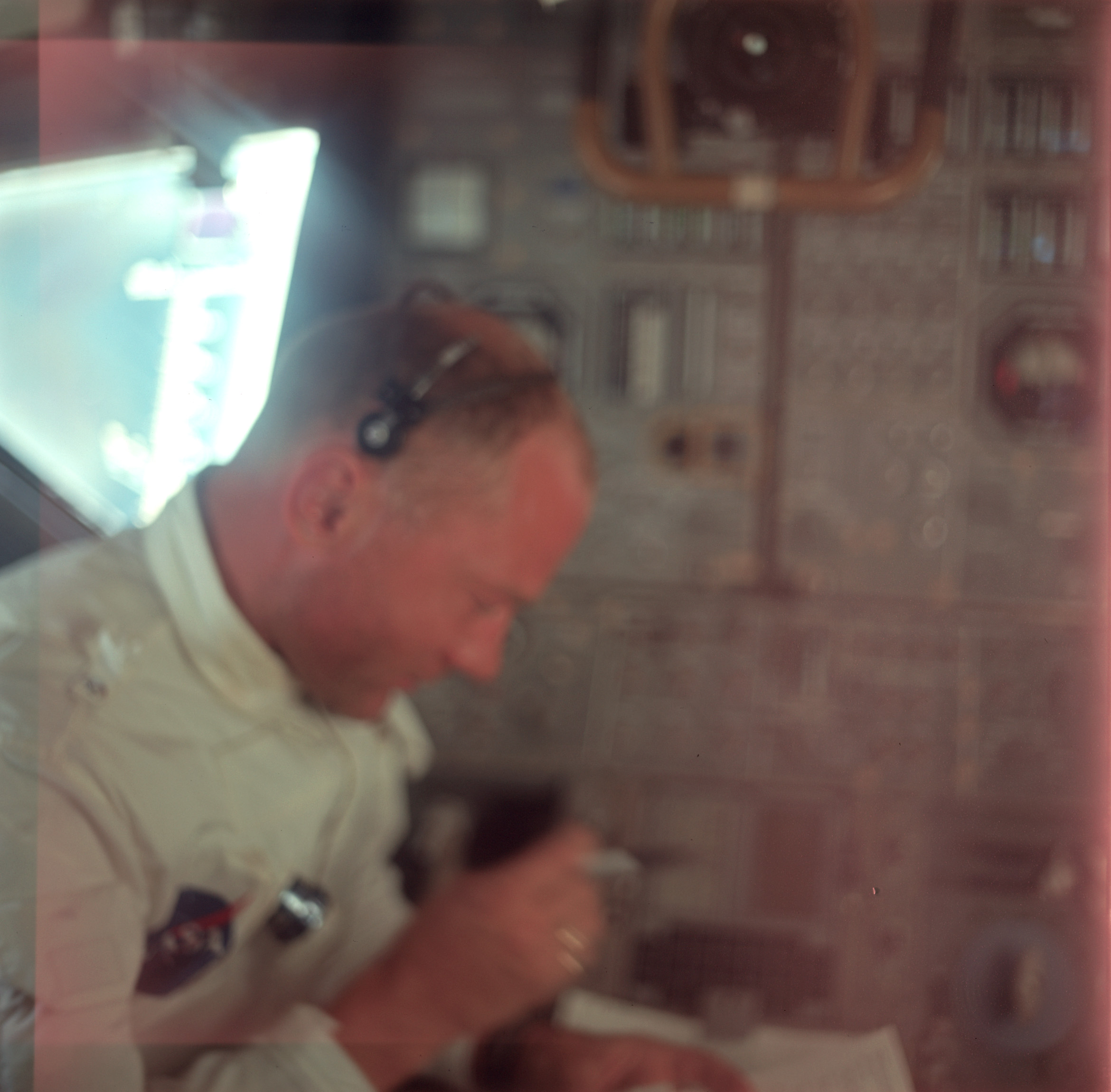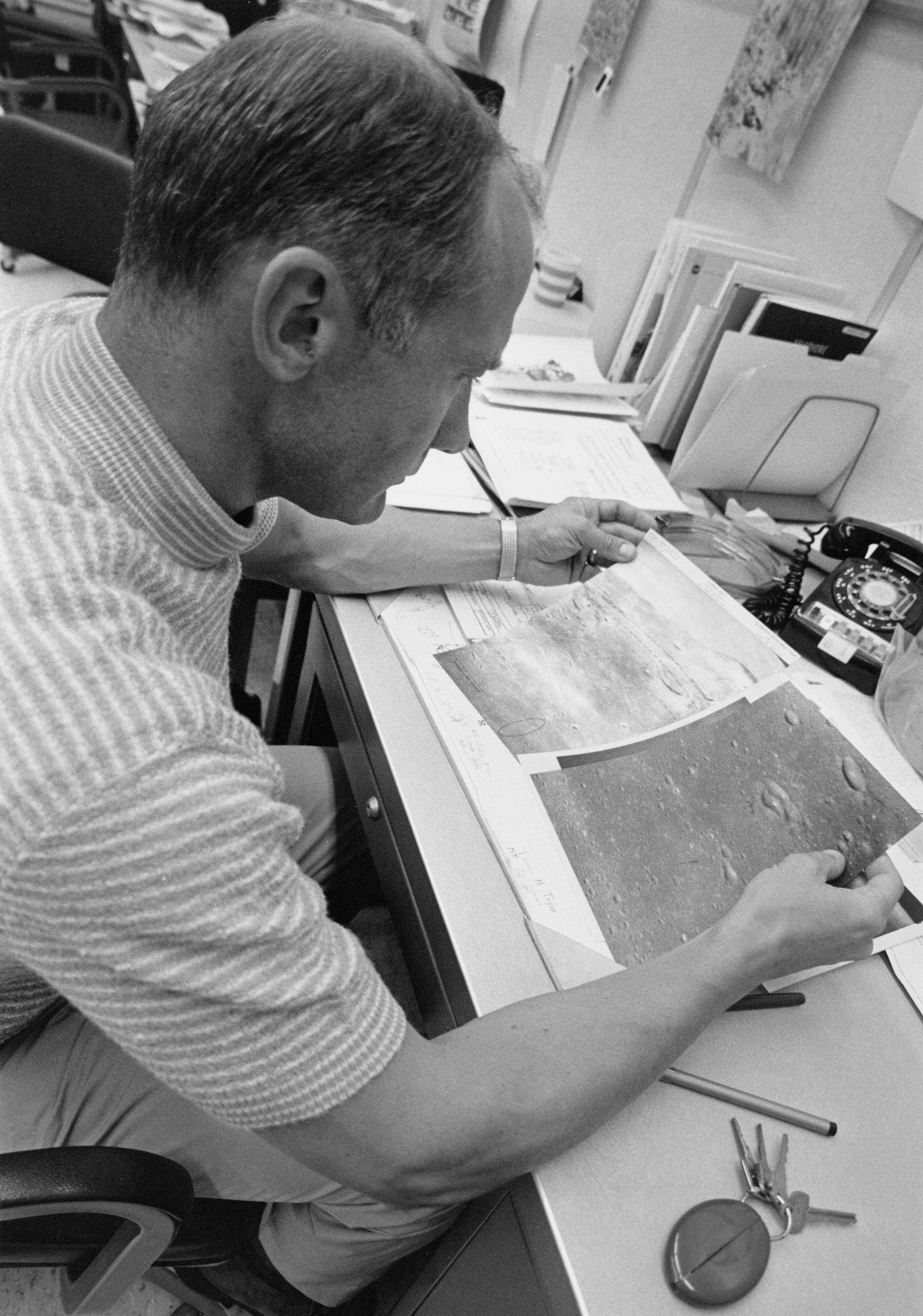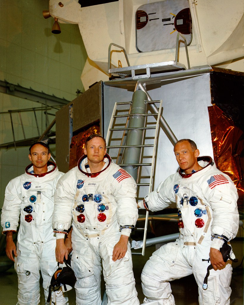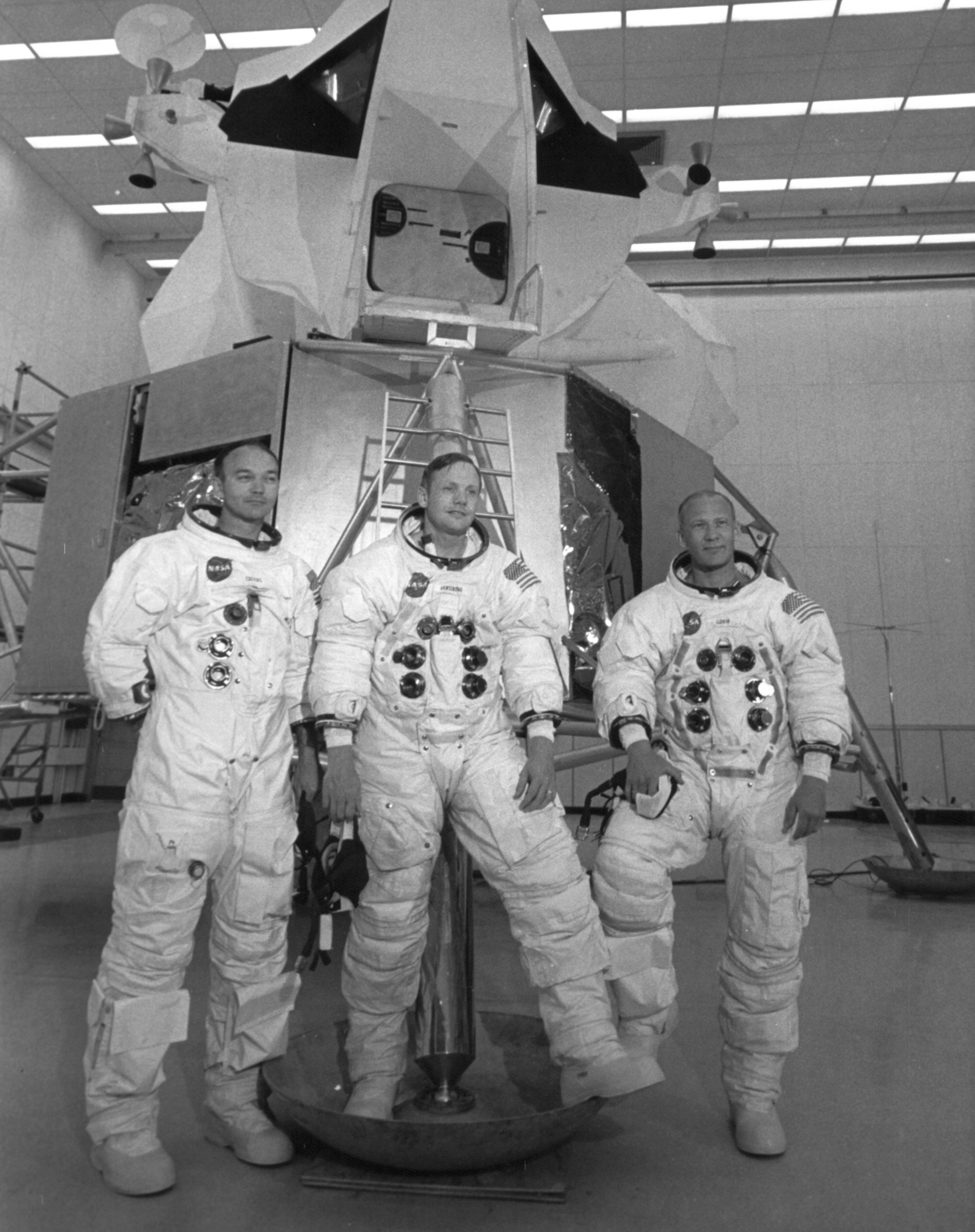 Armstrong, Collins, Aldrin (left to right) examining mission photos, apparently out-the-window photos of the LM shadow area. Photo filed 3 August 1969. Scan by Kipp Teague.S69-47292 ( 60k or 6.1Mb )