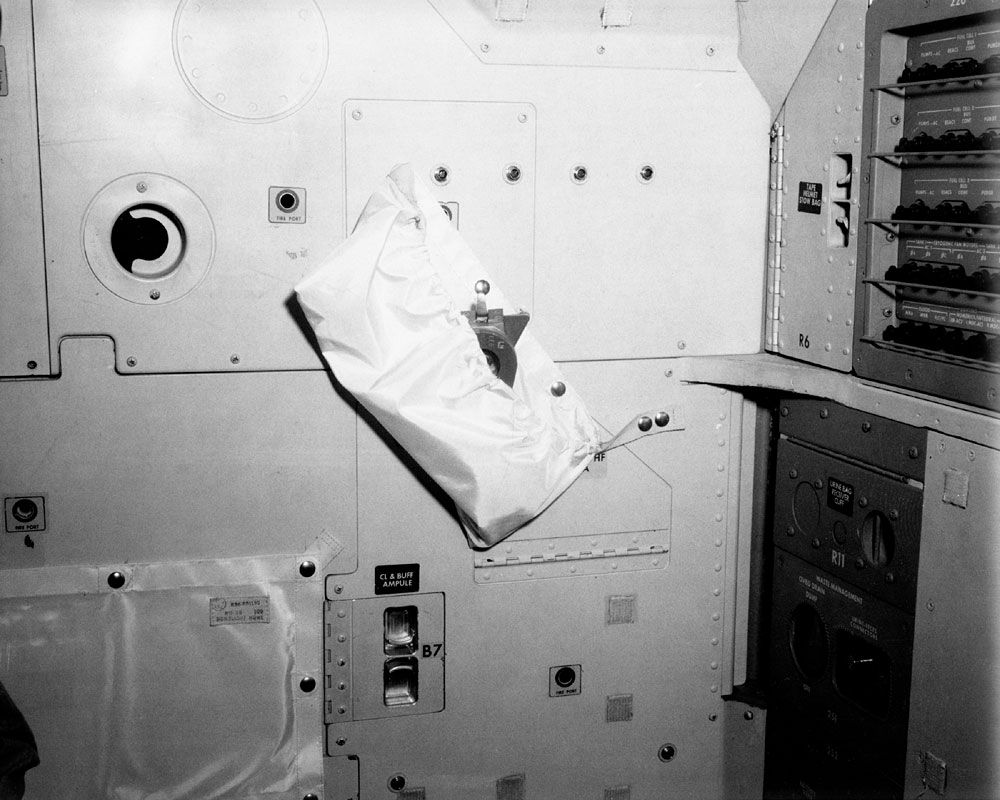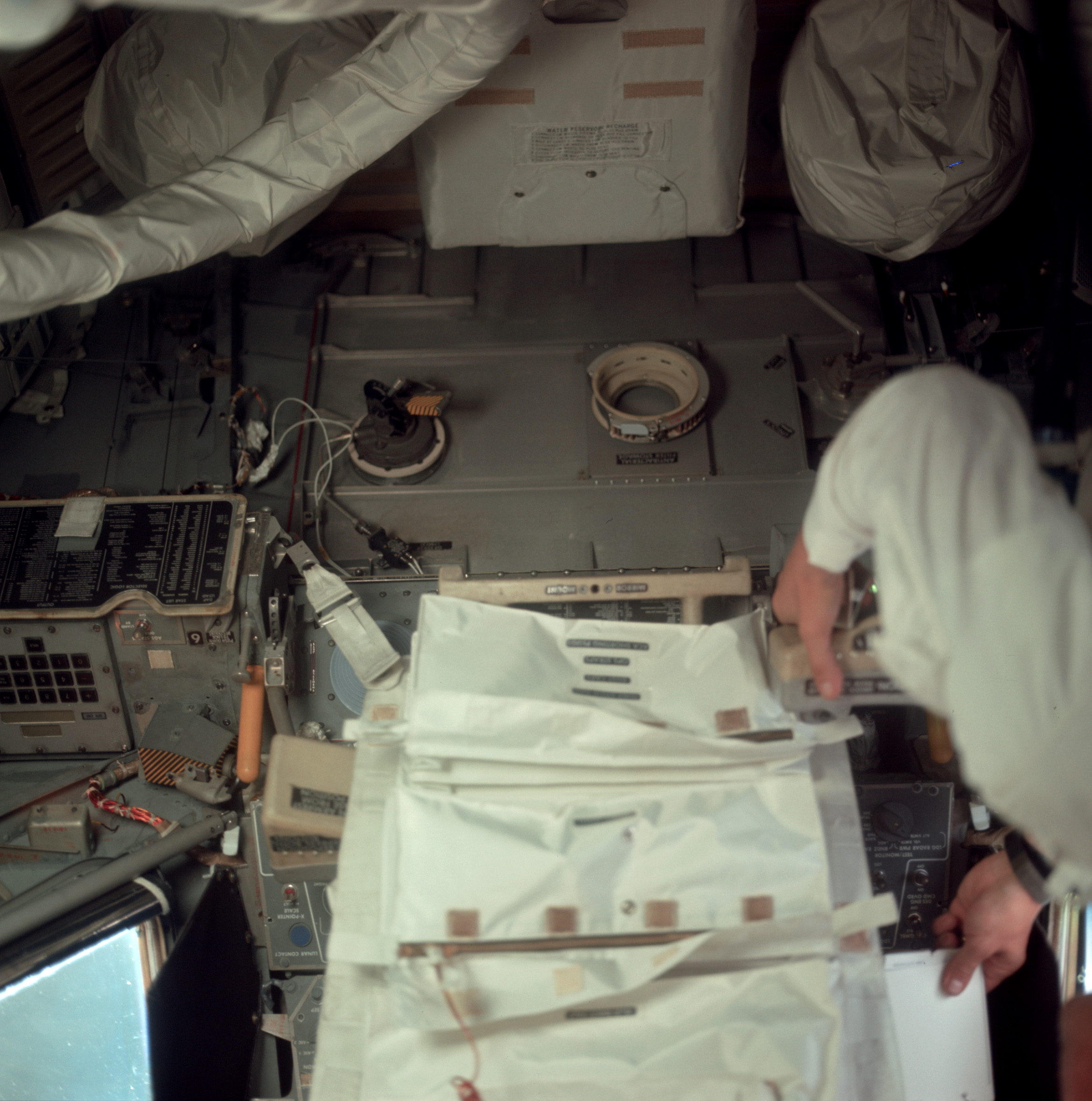 This is the second rock box Neil filled on the lunar surface. It is the Documented Sample Apollo Lunar Sample Retrun Container and contains approximately 20 grab samples weighing a total of 5.5 kilograms. Neil collected these in about 3 1/2 minutes before starting closeout activities. As he used the tongs to collect a representative sampling of rocks, he put them in a 'weigh bag' made of teflon film. Once he was done, he put the entire weigh bag in the rockbox. In the photo, we see that the weigh bag has been torn open to reveal the rocks. Neil also packed the two core tubes in this box and these can be seen at the upper left. The gloved right hand of the vacuum-chamber operator is at the lower right. 26 July 1969. Scan courtesy NASA Johnson.69-H-1223 ( 134k )