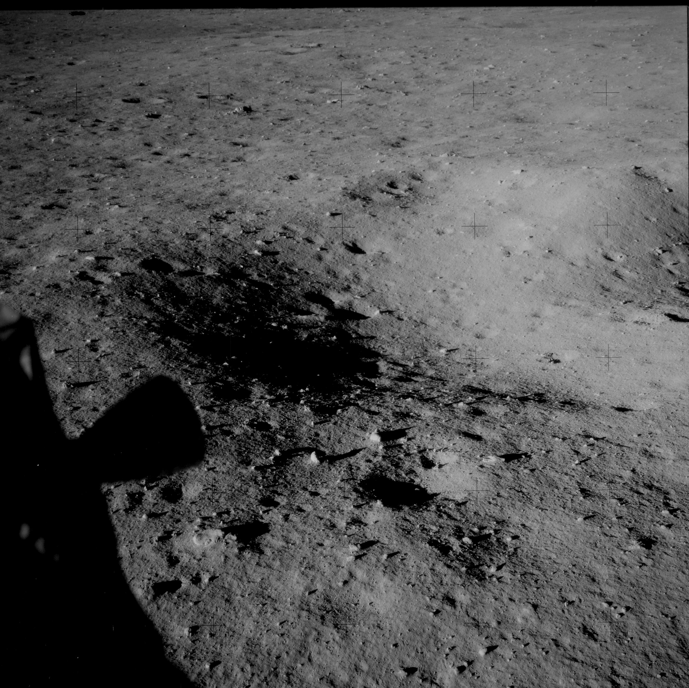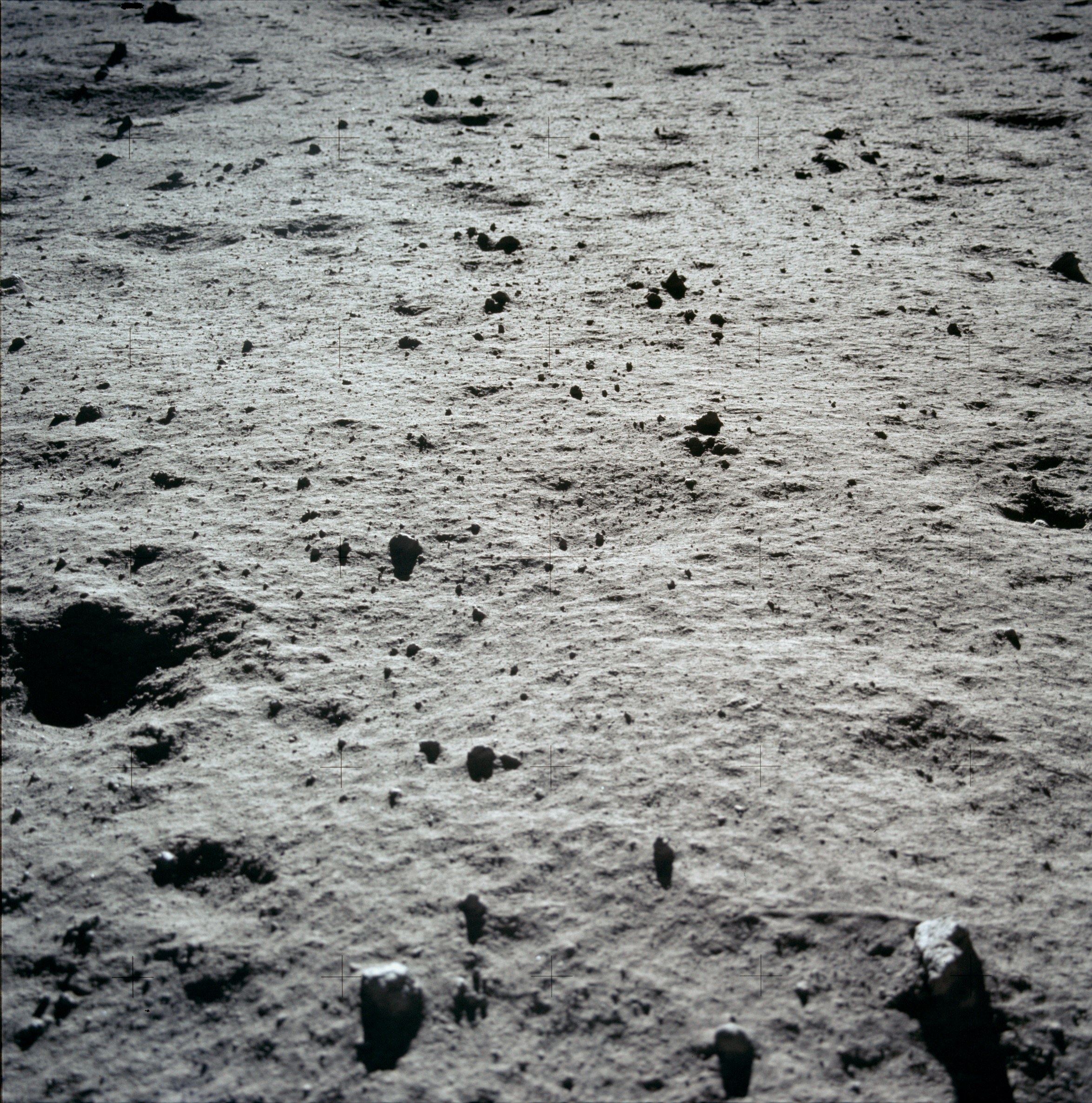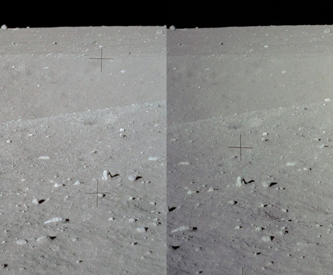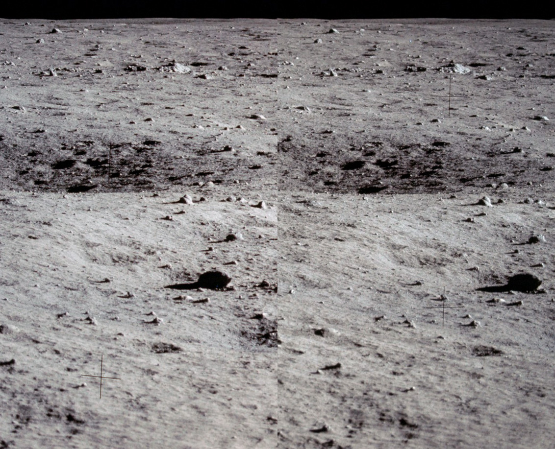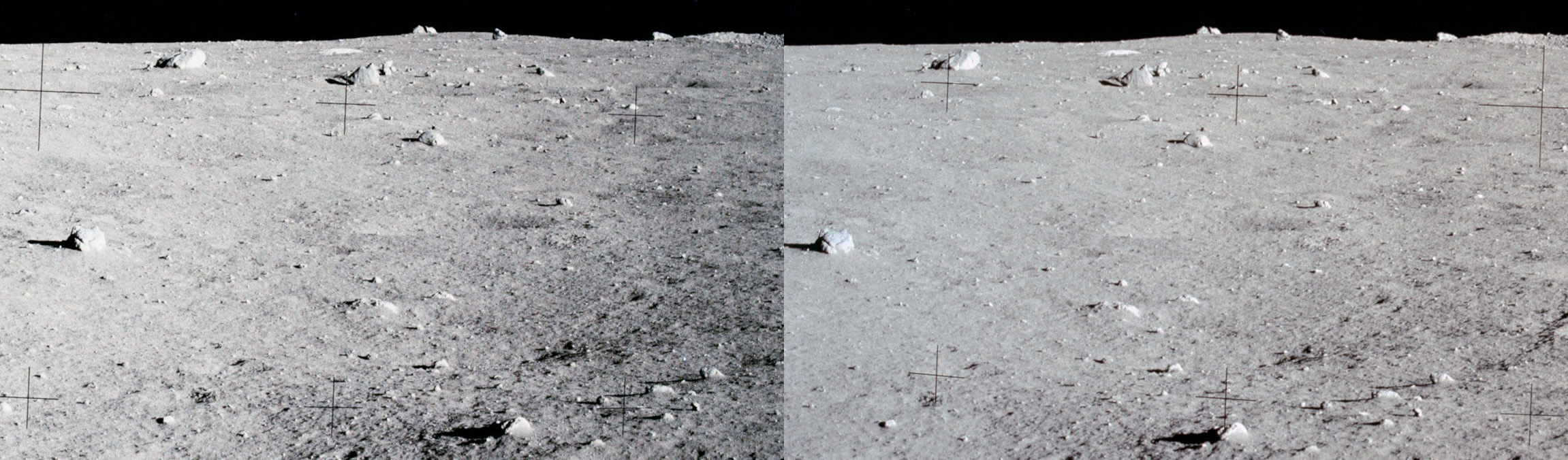 Note what appear to be soil clods at the bottom. Red-blue anaglyph created by Erwin D'Hoore.AS11-45-6705 Wiggle Stereo ( 0.2Mb )