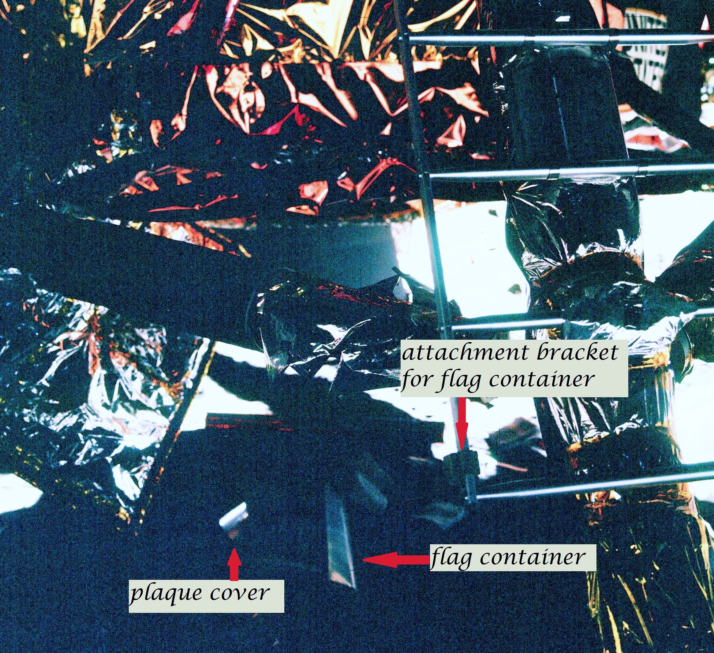 A 3x-enlarged detail shows the EASEP components, with the LRRR cover quite bright with the Sun near the zenith. The landing site lat/long is 0.67N/23.47E. The LRO spacecraft was at 0.62N/23.92E. What may be a piece of mylar blown off the descent stage during ascent stage liftoff is also labelled. The LRRR cover can be seen in its final position in a detail ( 0.2 Mb ) from AS11-37-5548, one of the pictures Neil took out his window after the EVA. A labelled drawing of the PSEP includes dimenions provided by Allan Needell of the National Air and Space Museum. The solar panels face east and west and are oriented 20 degrees off vertical. Labeled versions and a link to the raw file (M109080308R) are available at the LROC website.29 October 2009 08:14:07 UTC; Solar El/Az 63.8/94.9; LRO altitude 49 km. (1.0 Mb)Deconvolved, 0.25 m/pixel (4.7 Mb TIF) and 0.5 m/pixel (2.3 Mb TIF) versions by GoneToPlaid.
