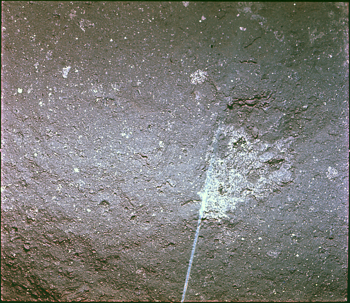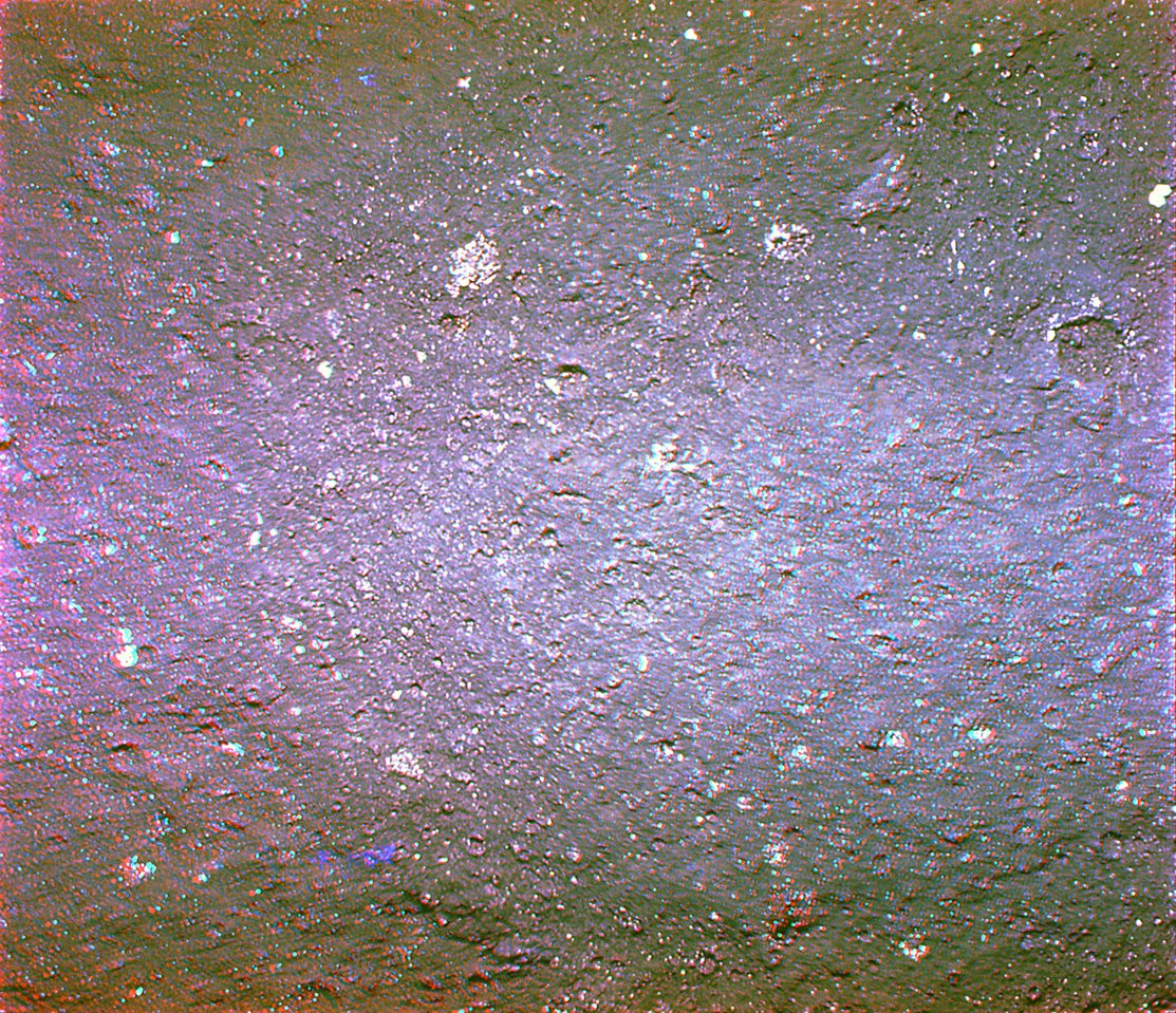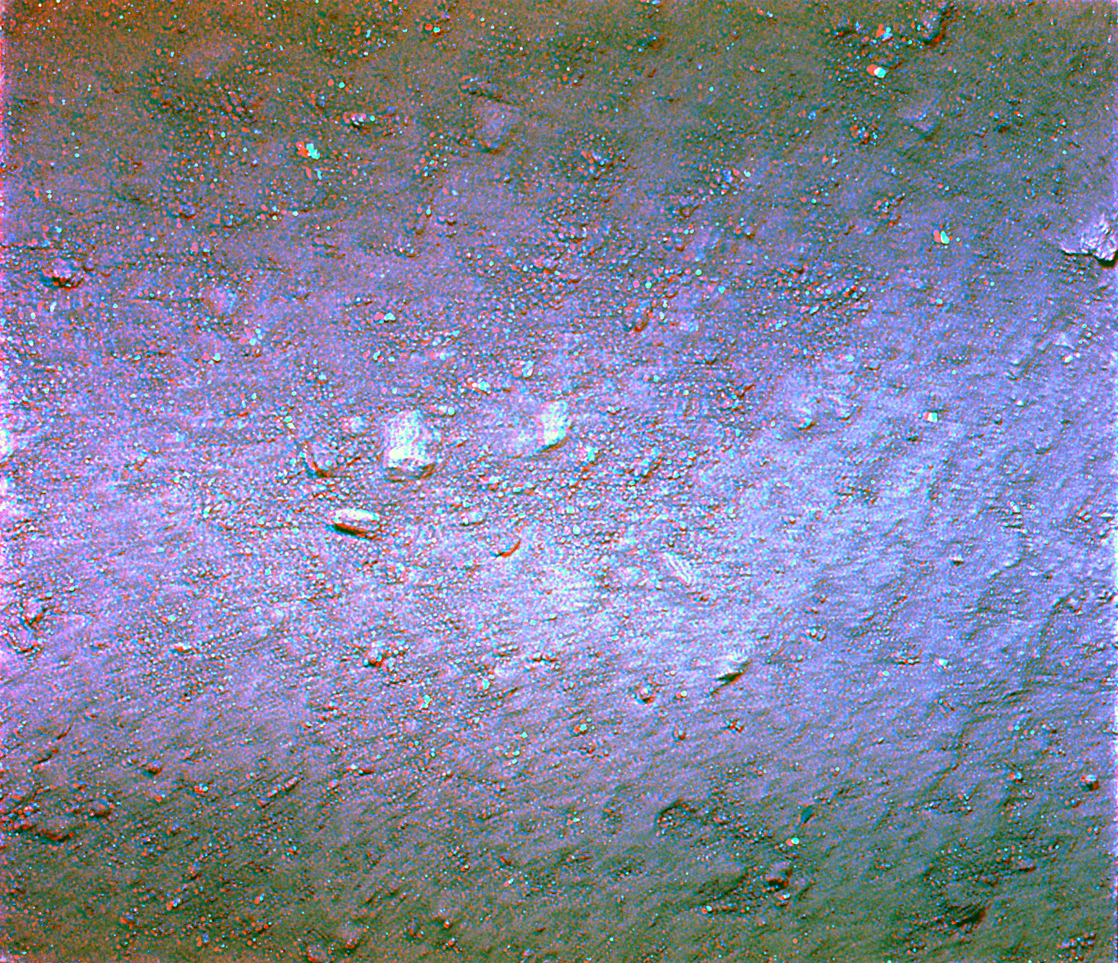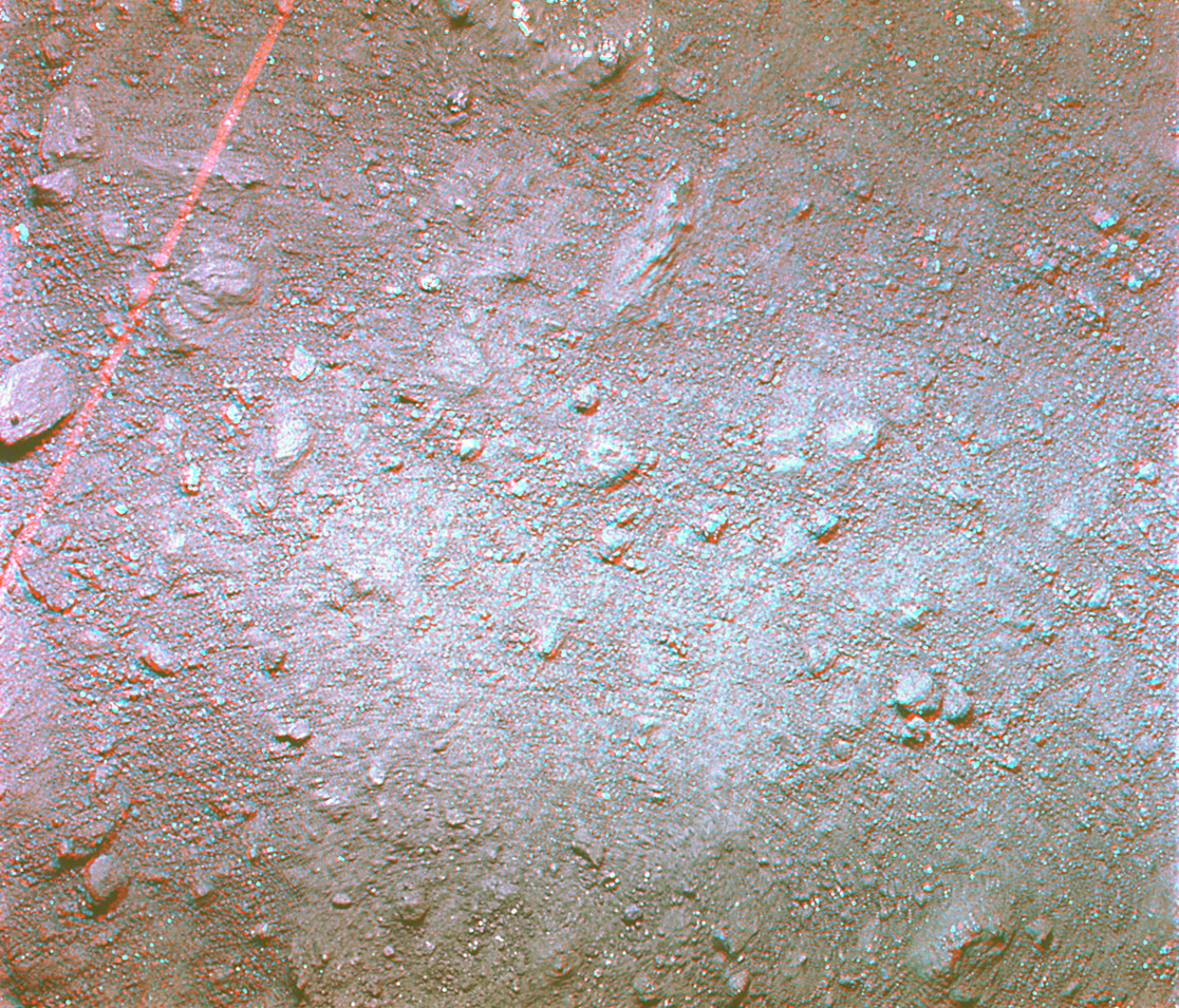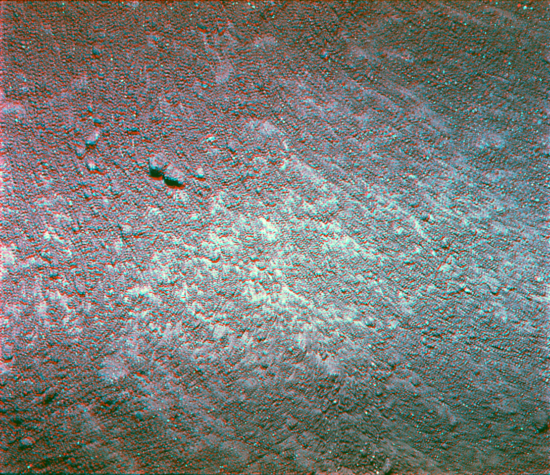 111:00:01 Surface of a large piece of basalt. Note the large zap pit above center near the righthand edge. This boulder is probably the one Neil examined just as he was going out of the TV field-of-view to the right. After he finished examining this boulder, Neil left the ALSCC upright on the boulder surface while he deployed the LRRR and took Hasselblad documentation, as can be seen in AS11-40-5952. The boulder is about 3 meters ENE of the LRRR. Red-blue anaglyph created by Erwin D'Hoore.AS11-45-6714 ( 1.5Mb )