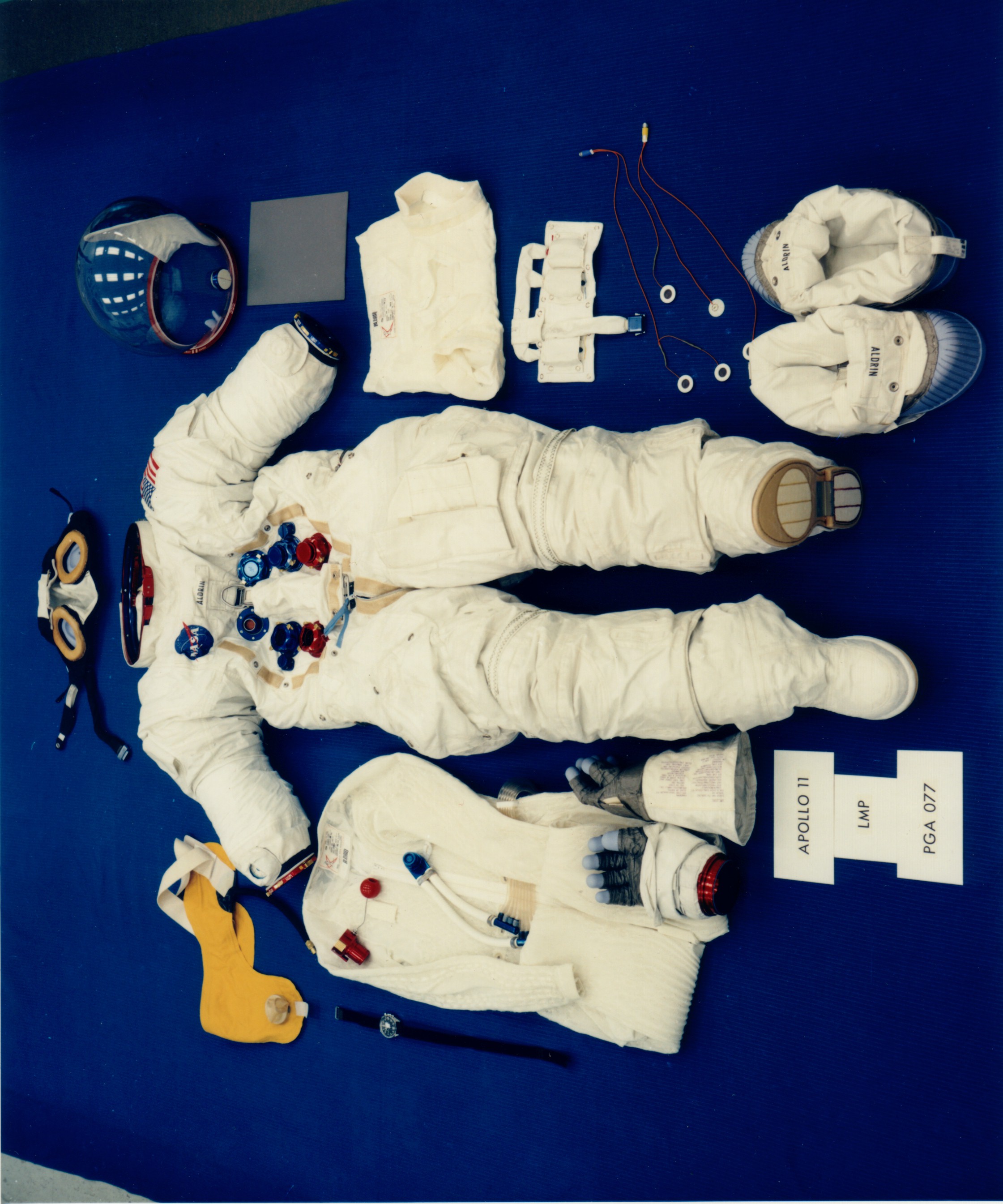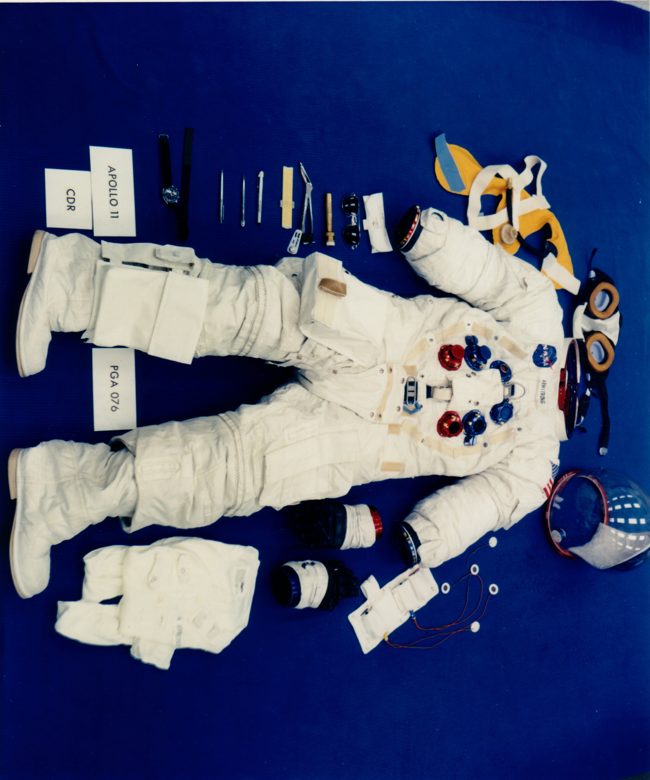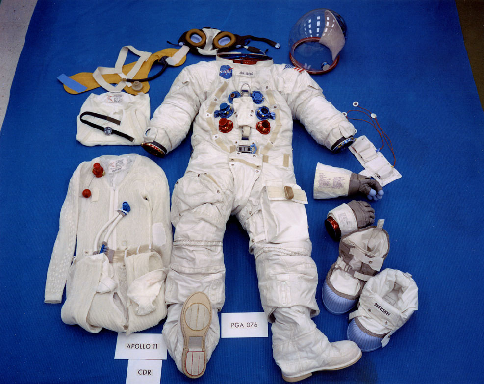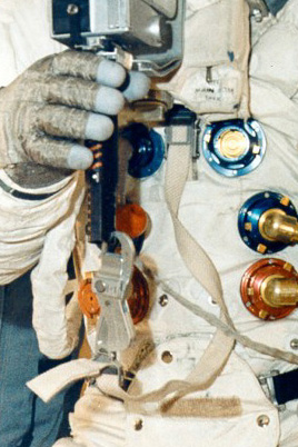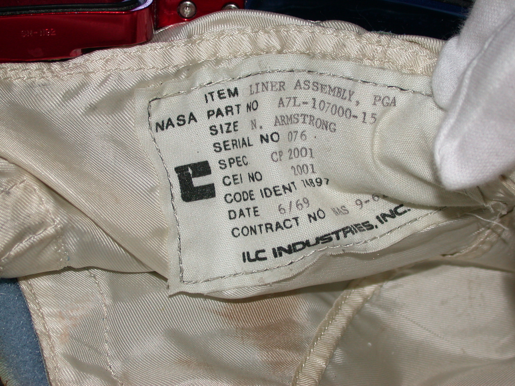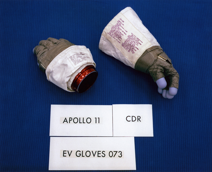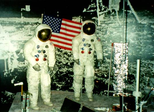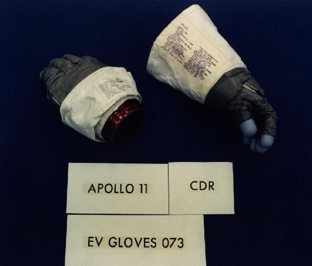 The suits worn by Neil and Buzz on the Moon are seen here on display at the National Air and Space Museum in 1999. Training versions of the Gold camera (lower left), the Solar Wind Collector (right of center) and the EASEP (right foreground) are also displayed. Photo by Ken Glover.IVA Glove at the Kansas Cosmosphere ( 209k )