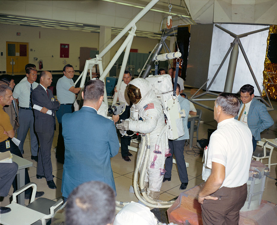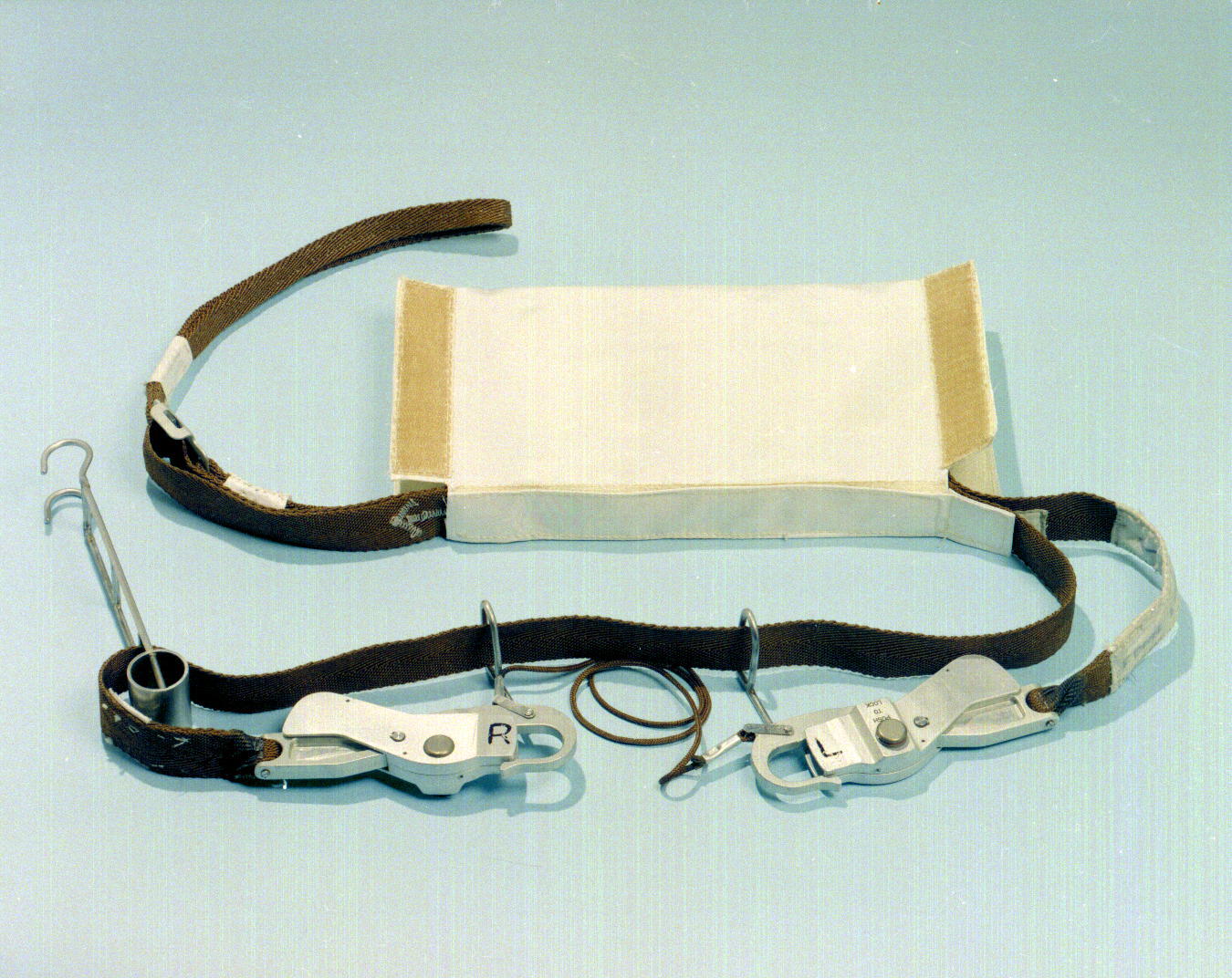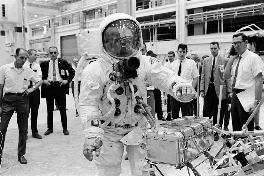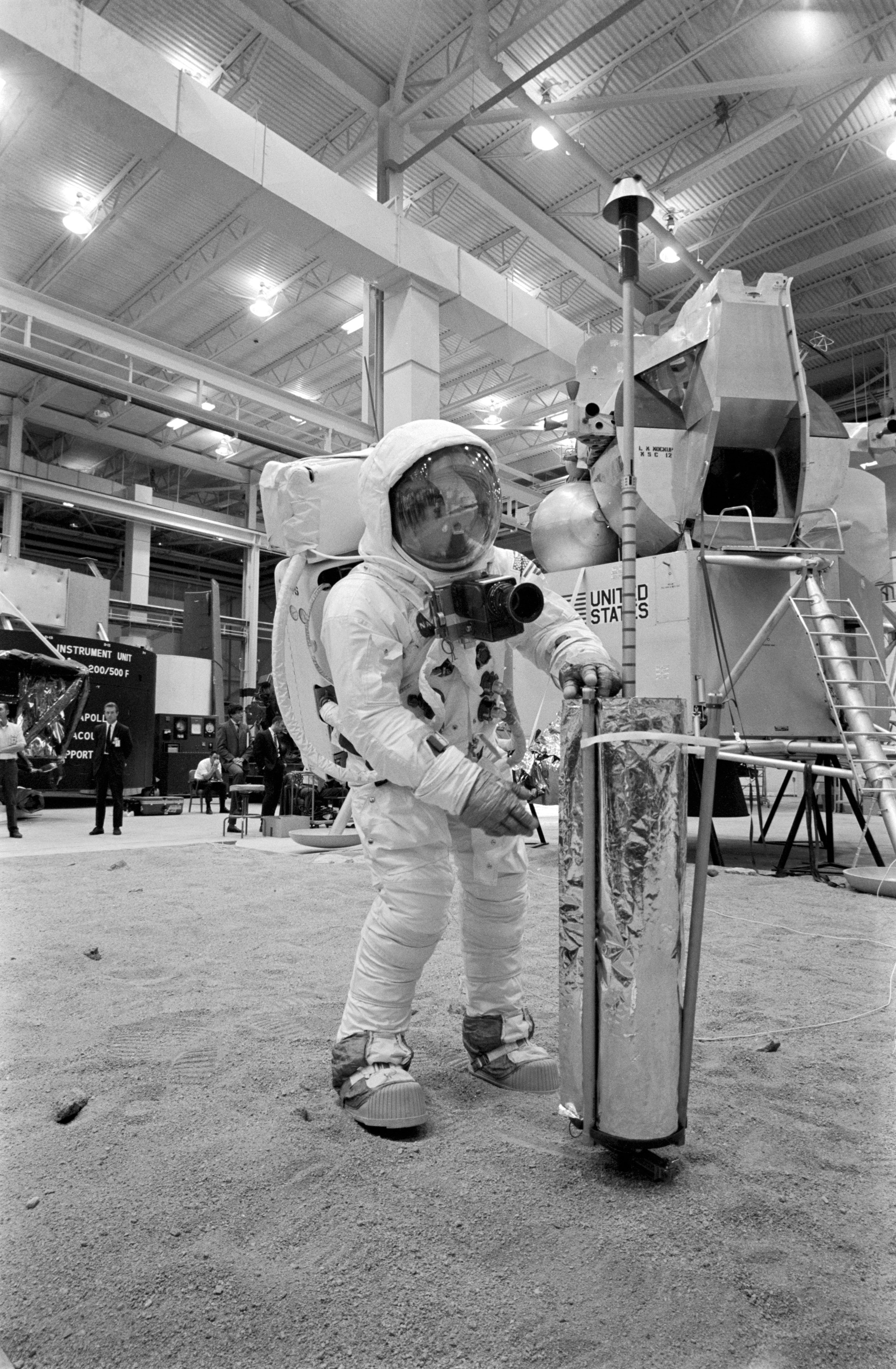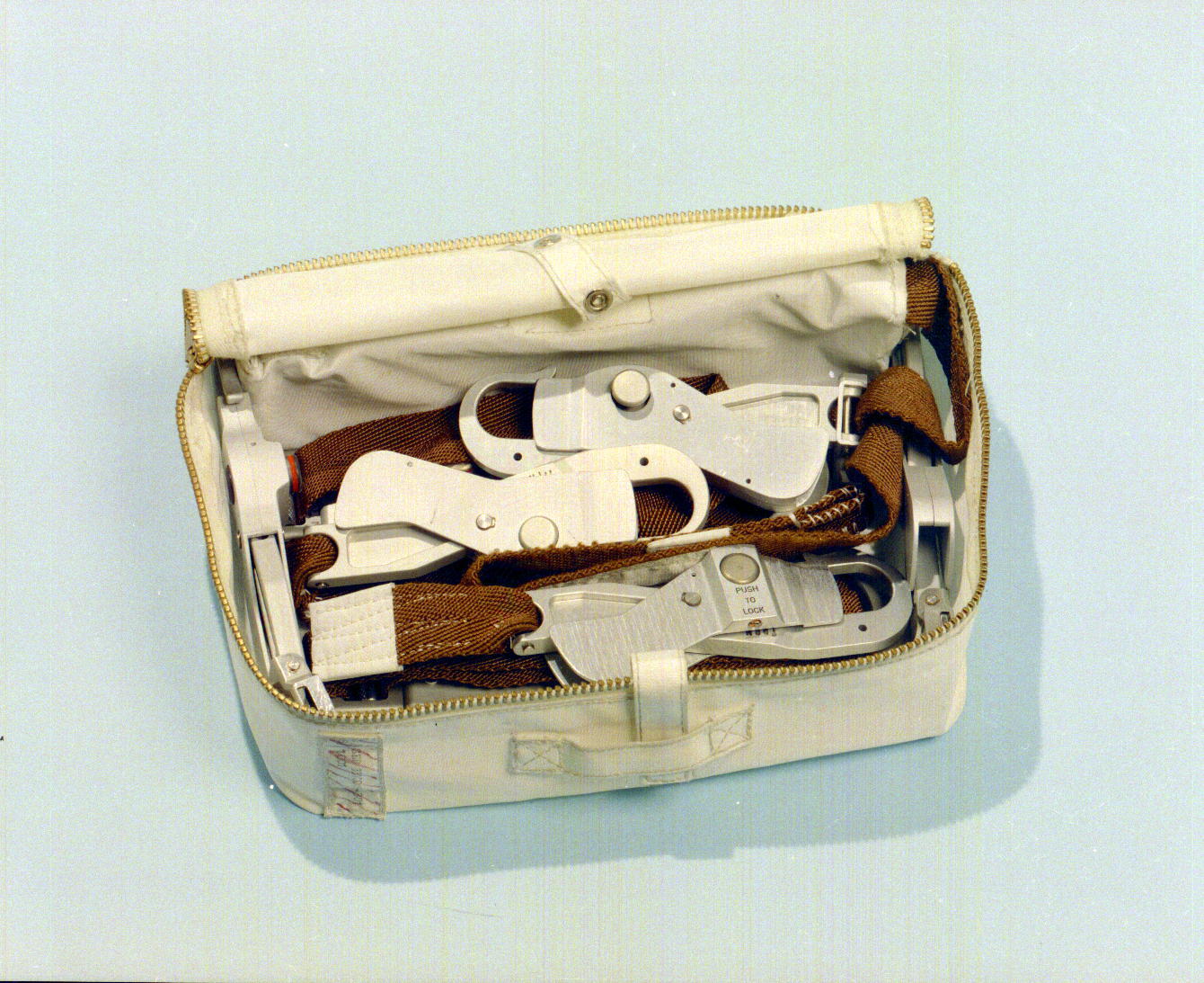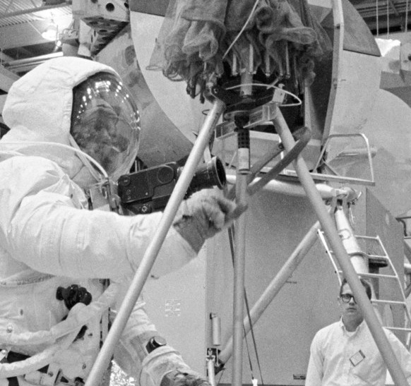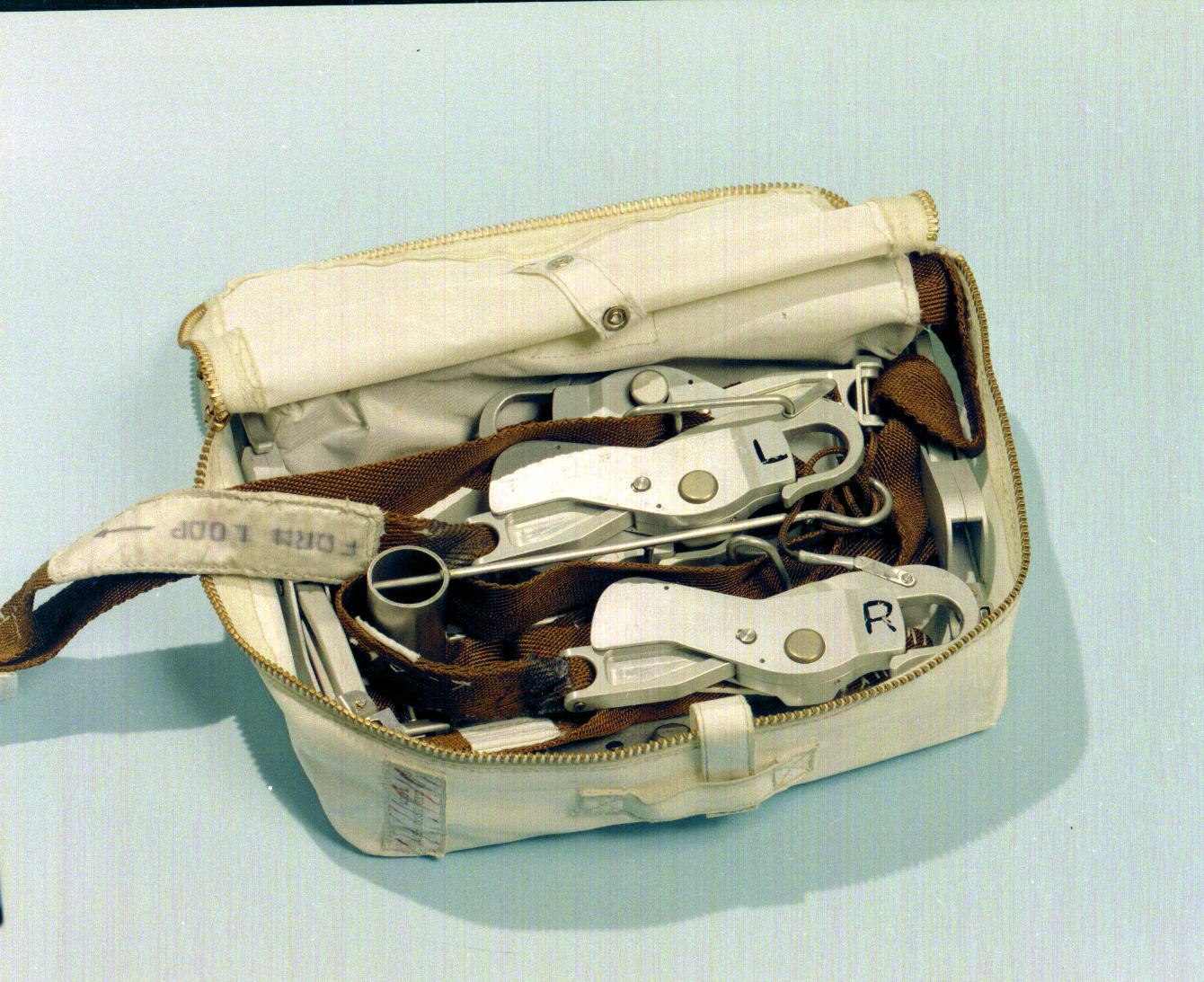 The suits worn by Neil and Buzz on the Moon are seen here on display at the National Air and Space Museum in 1999. Training versions of the Gold camera (lower left), the Solar Wind Collector (right of center) and the EASEP (right foreground) are also displayed. Photo by Ken Glover.IVA Glove at the Kansas Cosmosphere ( 209k )