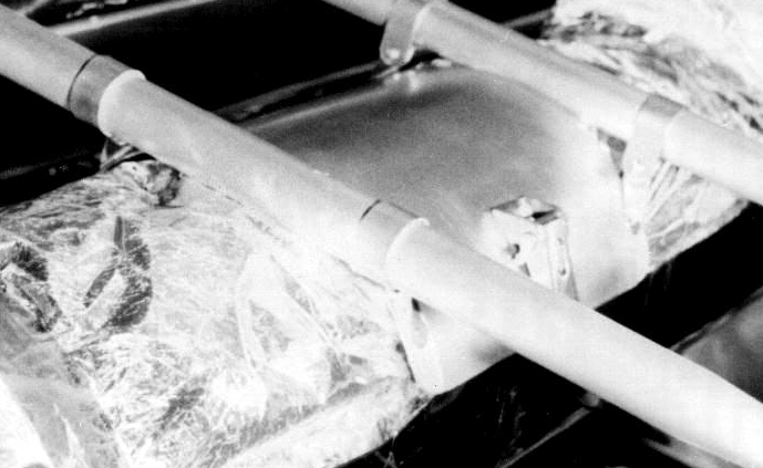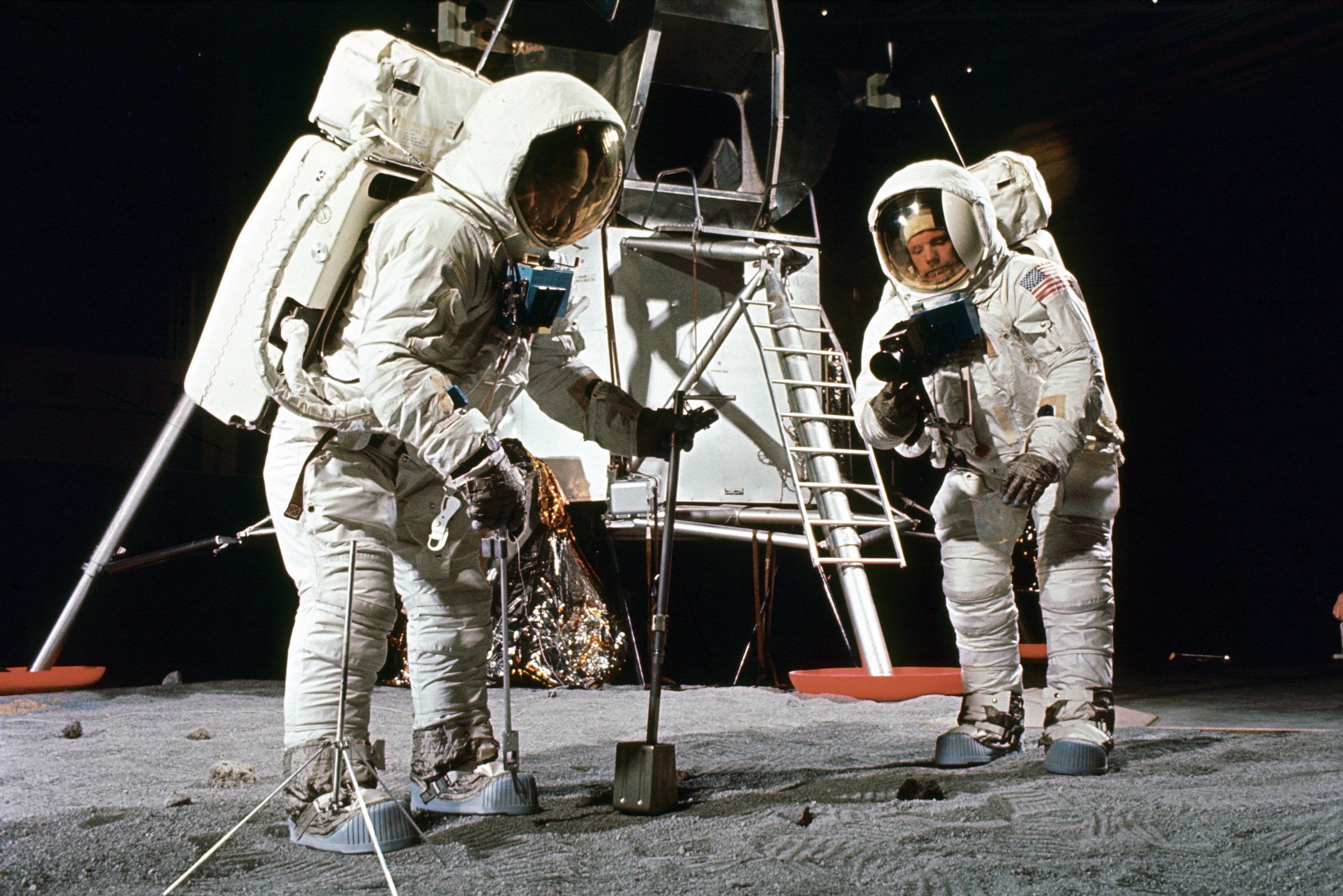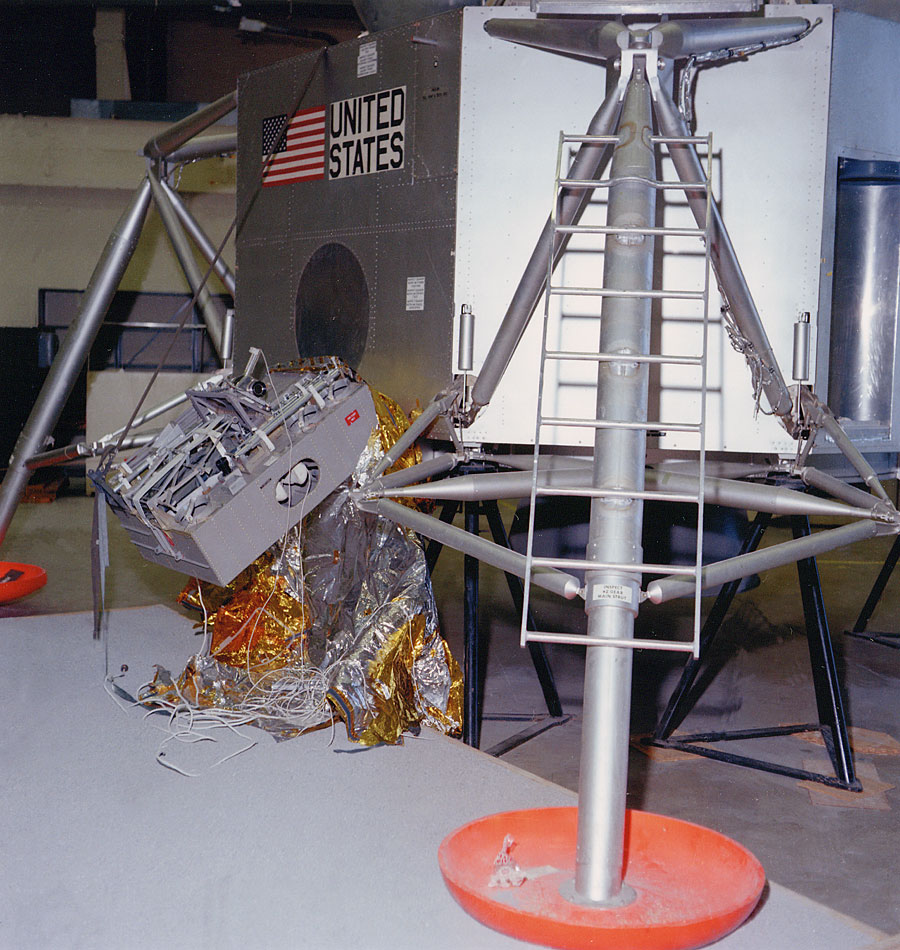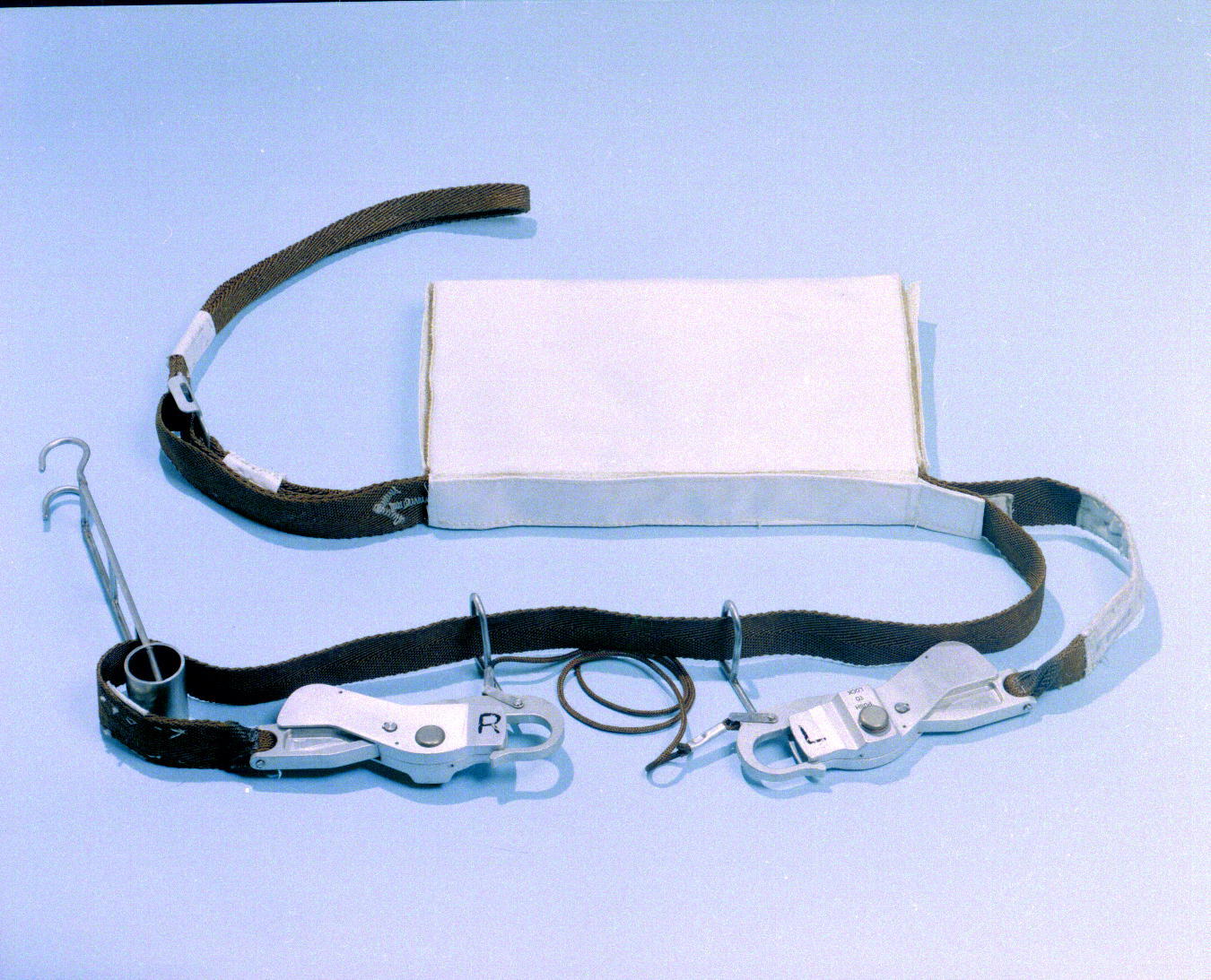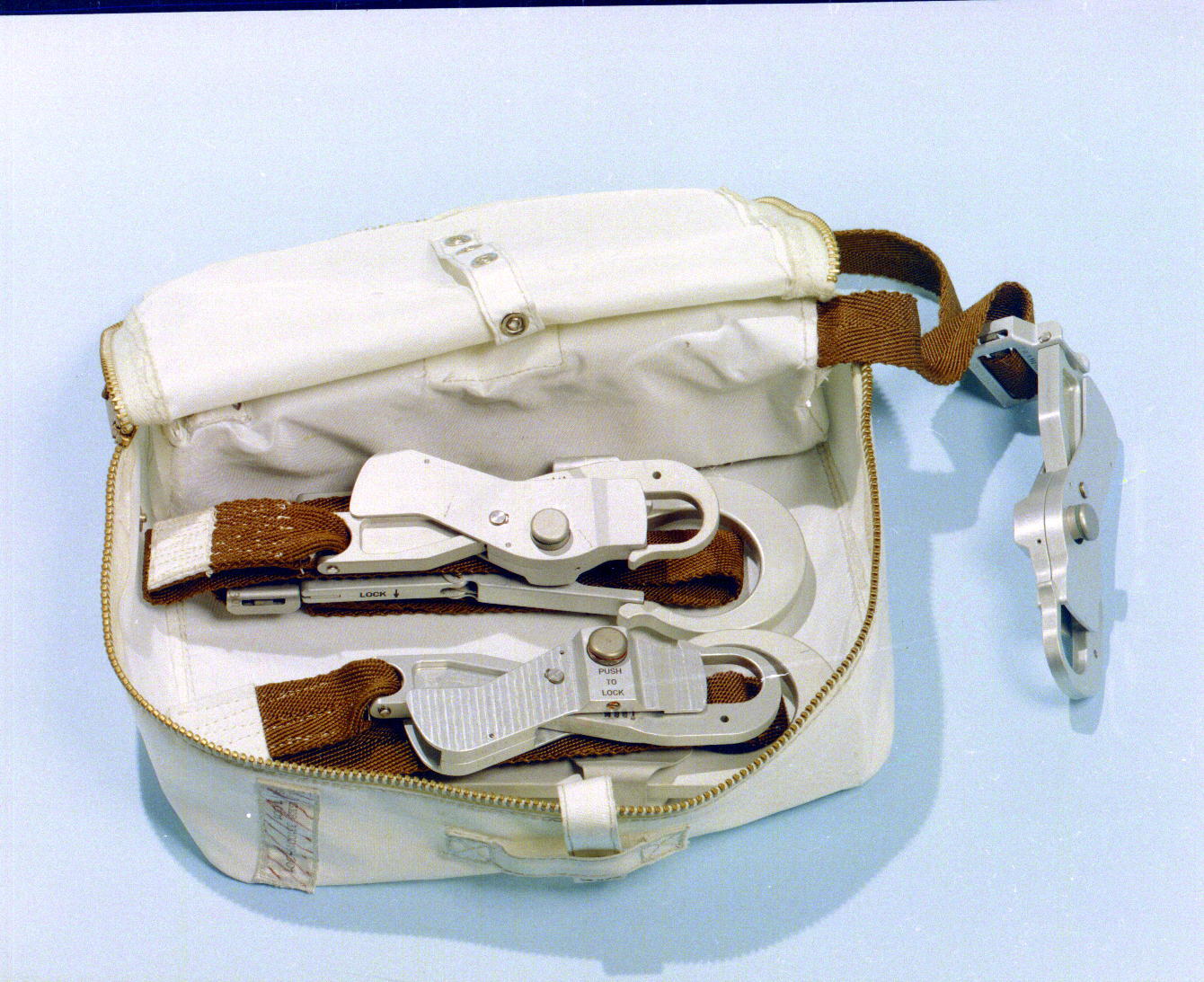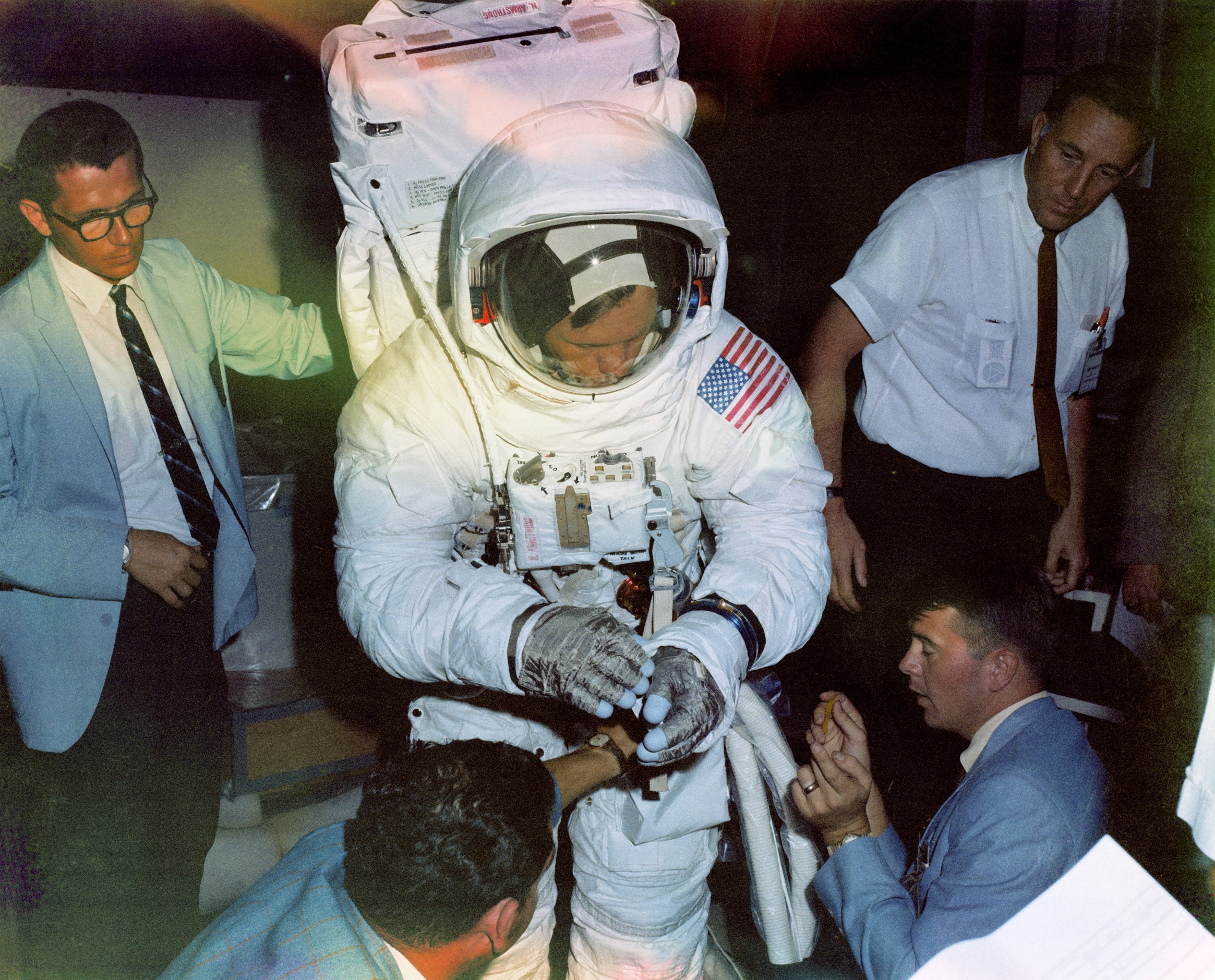 The suits worn by Neil and Buzz on the Moon are seen here on display at the National Air and Space Museum in 1999. Training versions of the Gold camera (lower left), the Solar Wind Collector (right of center) and the EASEP (right foreground) are also displayed. Photo by Ken Glover.IVA Glove at the Kansas Cosmosphere ( 209k )