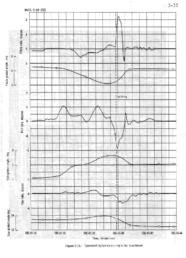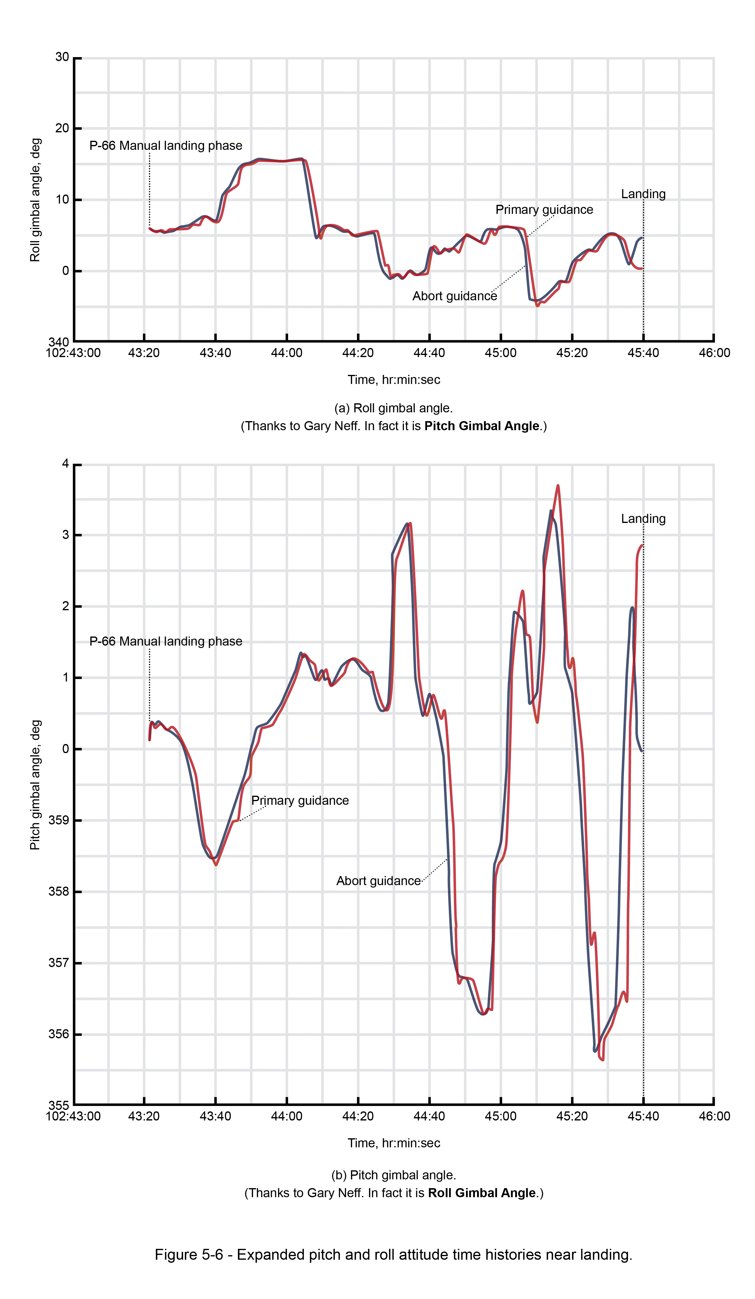 (a) Pitch gimbal angle. (b) Roll gimbal angle. Note that the vertical axes in the oriiginal version were mis-labeled. The upper panel shows Pitch Gimbal Angle and the lower panel shows Roll Gimbal angle. Redrafted by Thomas Schwagmeier.Figure 5-8 ( 347k )