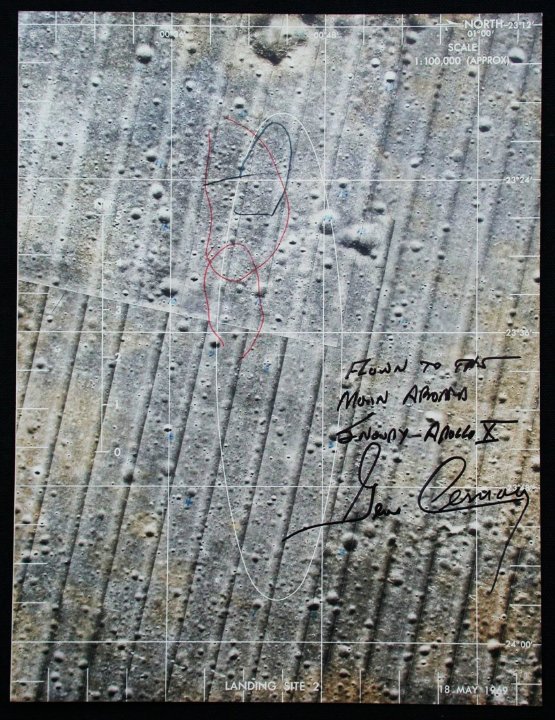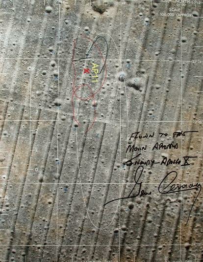 These star charts, printed back-to-back on a single, stiff sheet, were flown to the lunar surface in Eagle and have been signed by Buzz Aldrin. June 2005. Photo and scan courtesy Larry McGlynn.Mint-Condition Apollo 11 Patch/Crest ( HTML link )