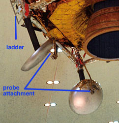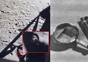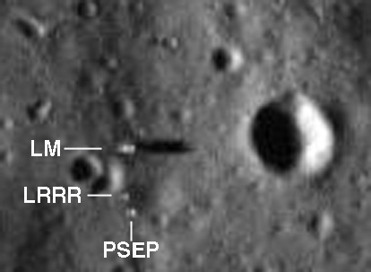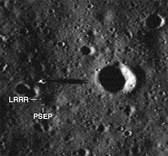 The image is grainy. With the Sun low in the west, the LRRR and PSEP show up well in a 3x-enlarged detail. The raw LROC file is M117338434R. The landing site lat/long is 0.67N/23.47E. The LRO spacecraft was at 0.25N/23.29E.01 February 2010 - First Image - 19:52:11 UTC; Solar El/Az 34.9/270.3; LRO altitude 41 km. ( 1.4 Mb)Deconvolved, 0.25 m/pixel (4.7 Mb TIF) and 0.5 m/pixel (3.1 Mb TIF) versions by GoneToPlaid.