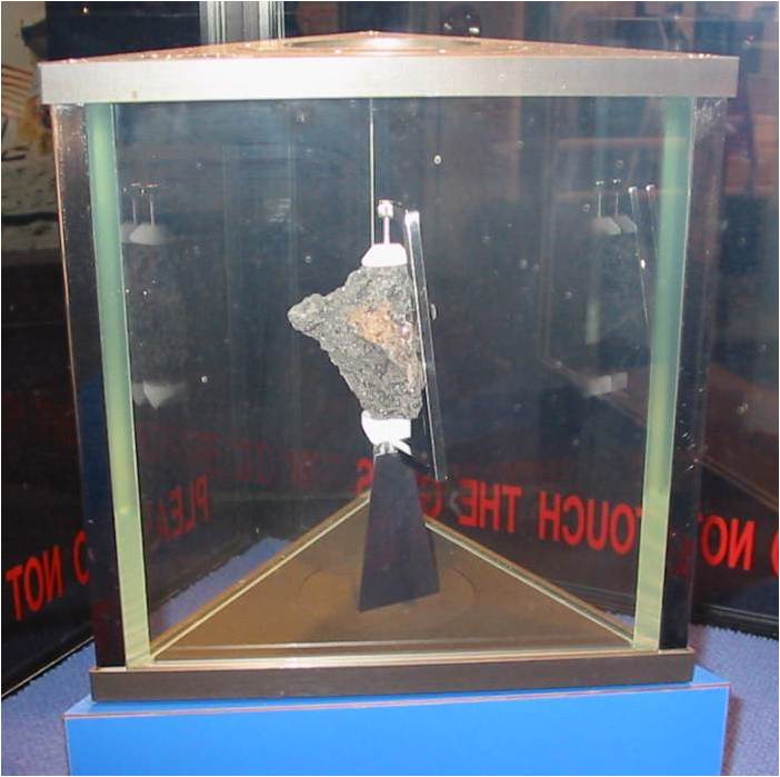 This sample was handcarried to Australia in 1994 by Honeysuckle Creek veteran John Saxon in 1994 and was presented by John Young to honor Australia's contribution to the success of Apollo 11 twenty-five years previously. Photo by Mike Dinn.Trout Trophy ( 298k )