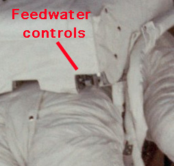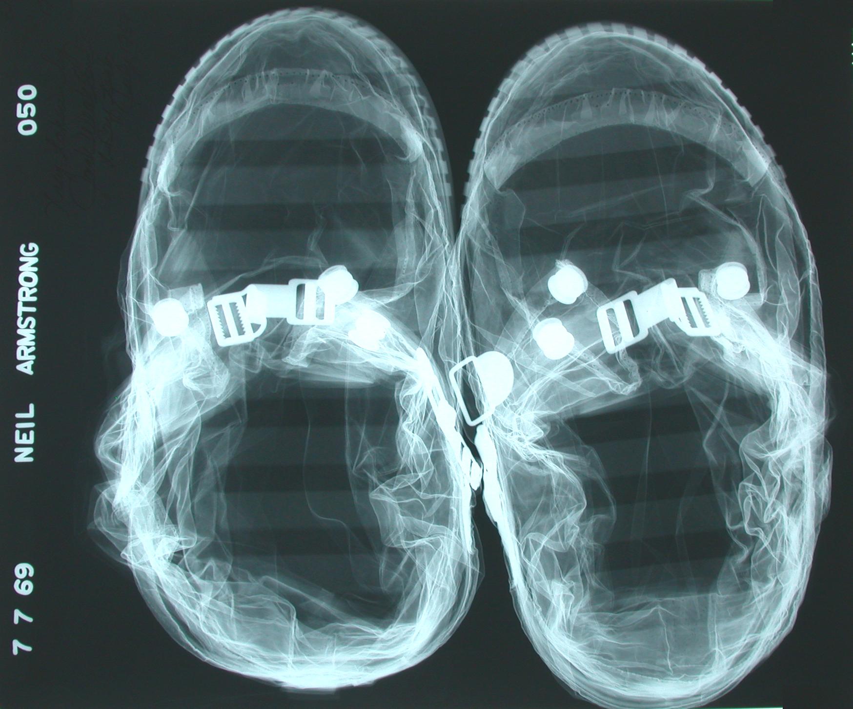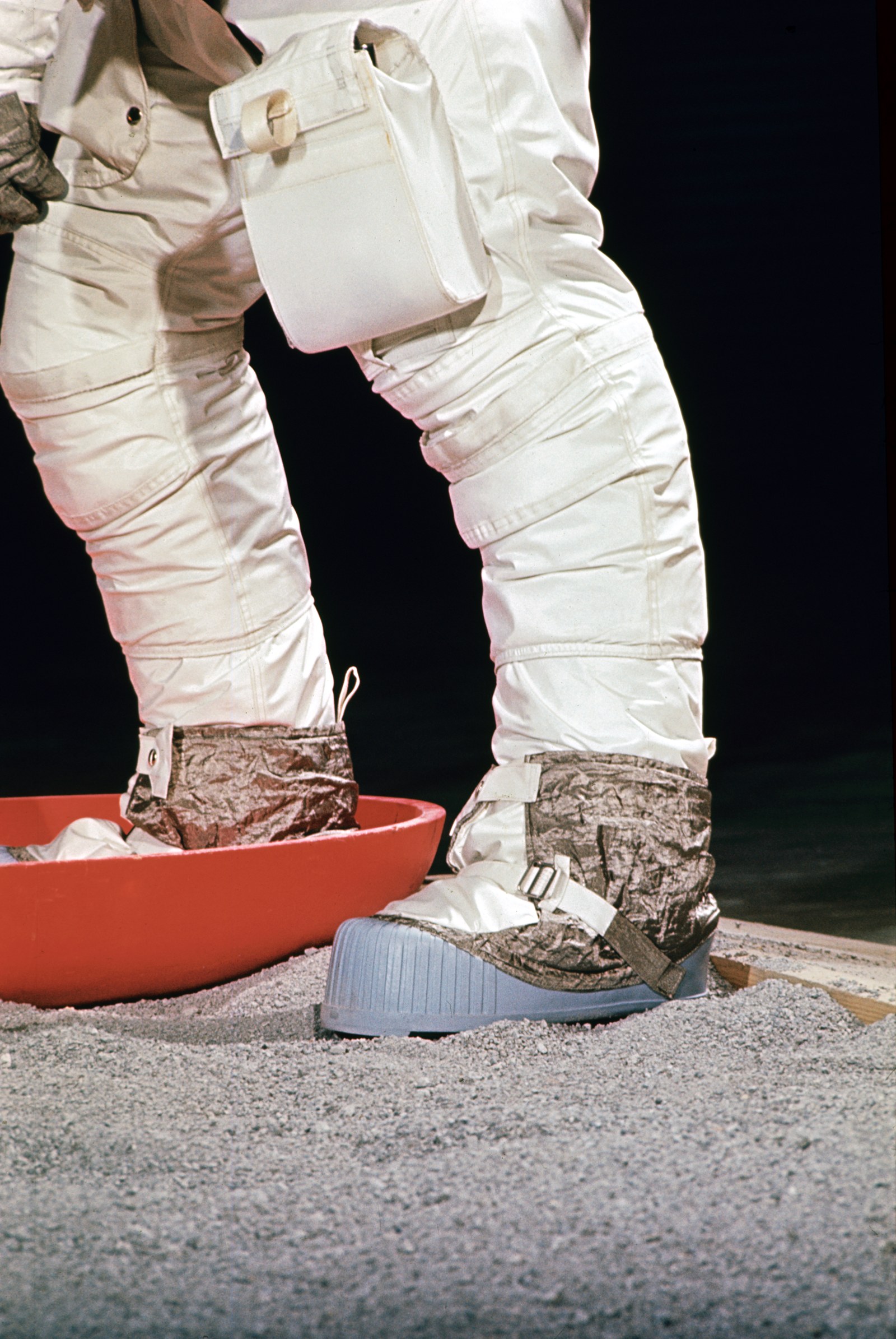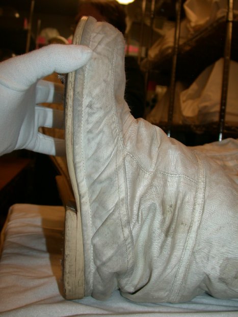 Photo taken at National Air and Space Musuem's Garber Facility courtesy Ulli Lotzmann. April 2006.Left Boot on Neil's Flown PGA (Pressure Garment Assembly) ( 53k )