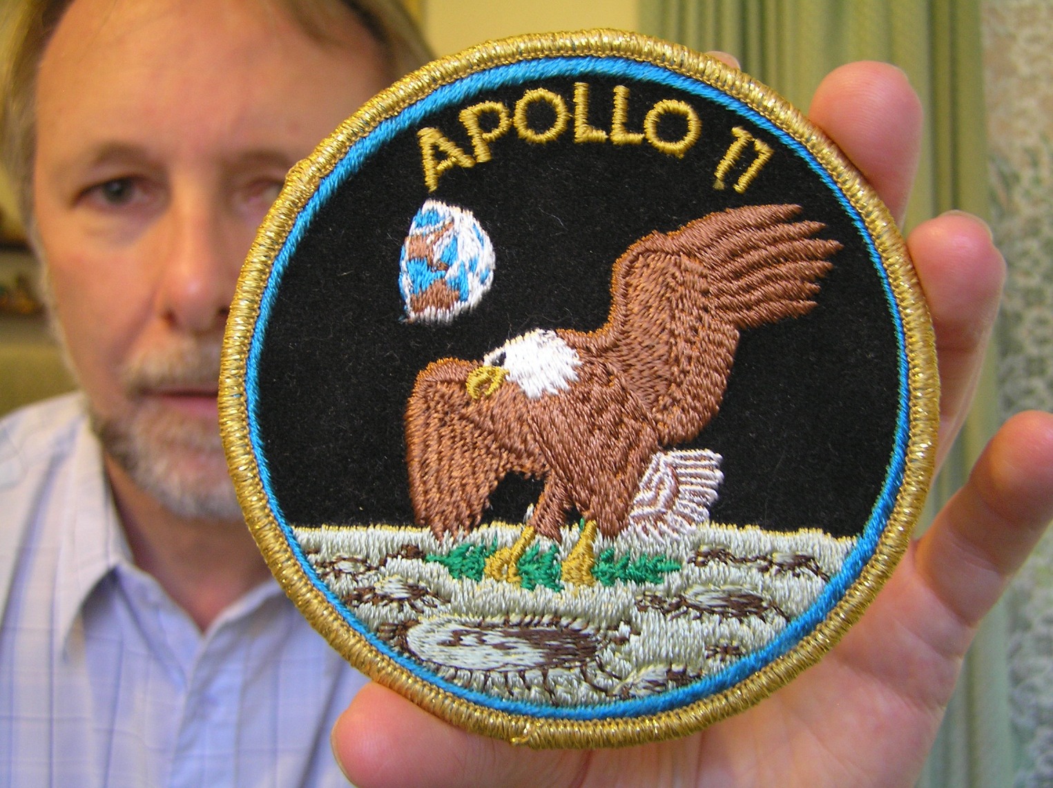 . Colin Mackellar displays an Apollo 11 patch provided by Stan Lebar, the Westinghouse Lunar Camera Program Manager. "Stan kindly loaned me his original A11 patch to scan for the HSK website. it looks fantastic when held up to the light. I suppose I really should call it an 'embroidered patch. The colour varies quite a bit (depending on lighting and background), but in full sunlight, the border is lovely gold, and the blue border is iridescent. The oblique shot(linked below) is probably the closest. I have no idea how many of these were produced, but Stan was given this one for his part in managing the Apollo 11 Lunar TV Camera program." Compare with the version printed on a square of Beta cloth ( 1.4Mb ) and then sewn on Neil's flown suit.Flown Apollo 11 Interim Stowage Assembly ( 0.4 Mb )Colin provided photos of the patch face-on on a white background ( 1Mb, face-on on a purple background ( 1.3Mb ), reversed ( 0.3Mb ), at an oblique angle ( 0.3Mb ), and face-on in a scanner ( 1.3Mb ). 2 March 2009.